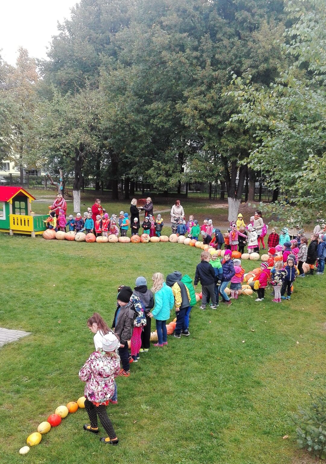 Pavasarį per šeimos šventę vaikai padovanojo savo artimiesiems iš mažų sėklyčių prasikalusius moliūgų daigelius. Daigeliai buvo pasodinti į žemę ir auginami soduose, daržuose, net darželio kieme. Rudenį užauginti moliūgai sugrįžo į darželį. Ir kokių tik jų nebuvo: mažų, didelių, gruoblėtų, o vienas kalbantis ir dainuojantis (auklėtoja metodininkė Daiva Jankūnienė). Tas „kalbantis moliūgas“ pakvietė visus sukurti moliūgų traukinį. Visiems buvo smagu važiuoti oranžiniu traukiniu, žaisti, dainuoti, šokti, džiaugtis ir gėrėtis didžiausiu, originaliausiu moliūgu.