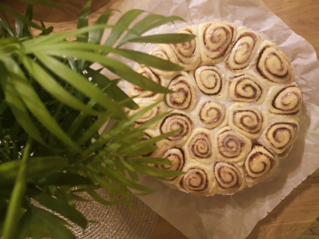 Stipriai nespausdami suvyniojame ritinėlį pagal ilgąjį kraštą. Padaliname į 12 vienodų dalių. Kepimo formą ištepame sviestu, sudedame bandeles palikdami 5–7 mm tarpelius (pažiūrėjus į nuotrauką, turėtų būti aiškiau, kaip sudėti bandeles). Pašauname į orkaitę ir kepame apie 30 minučių 200 laipsnių temperatūroje.