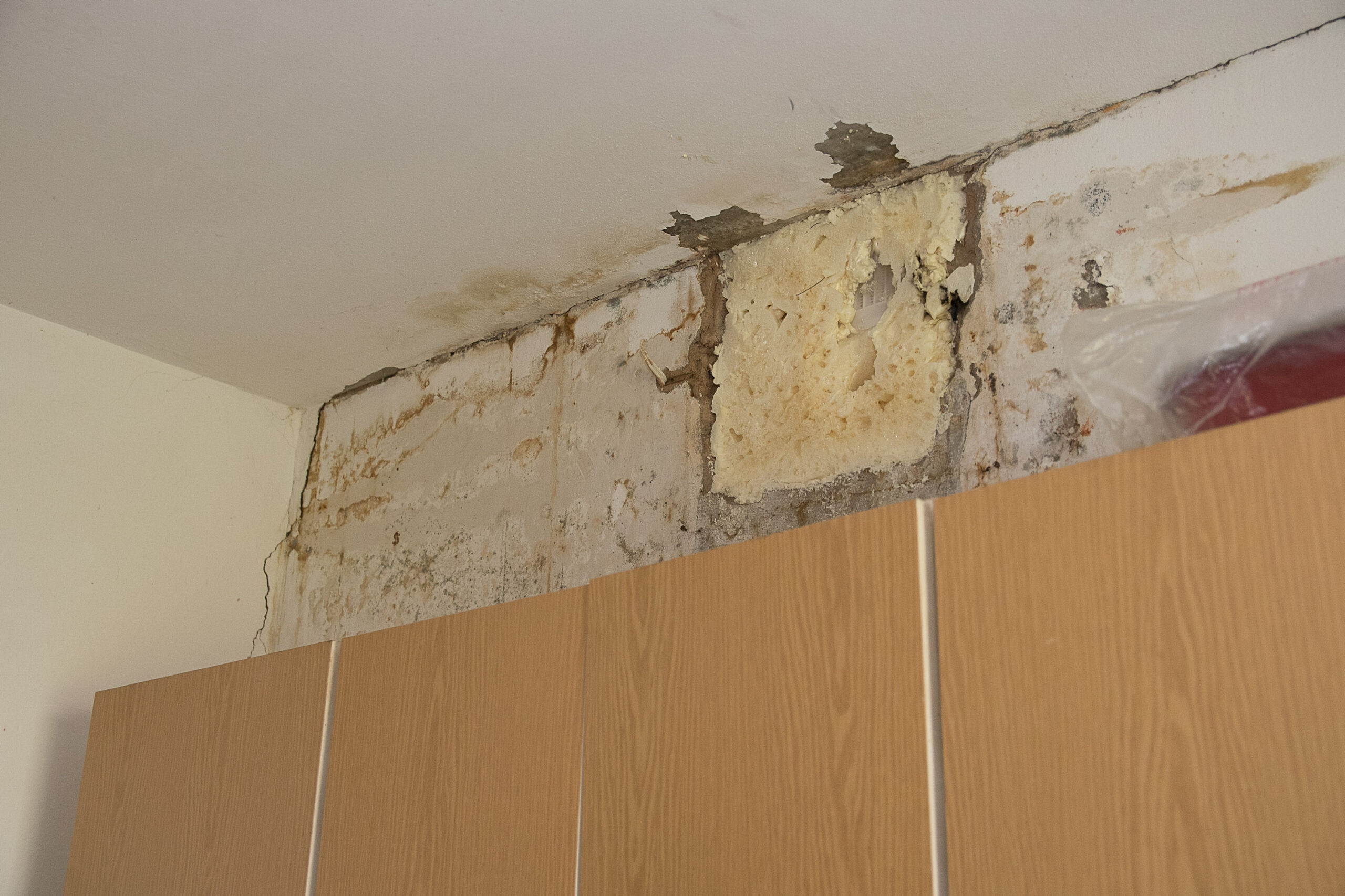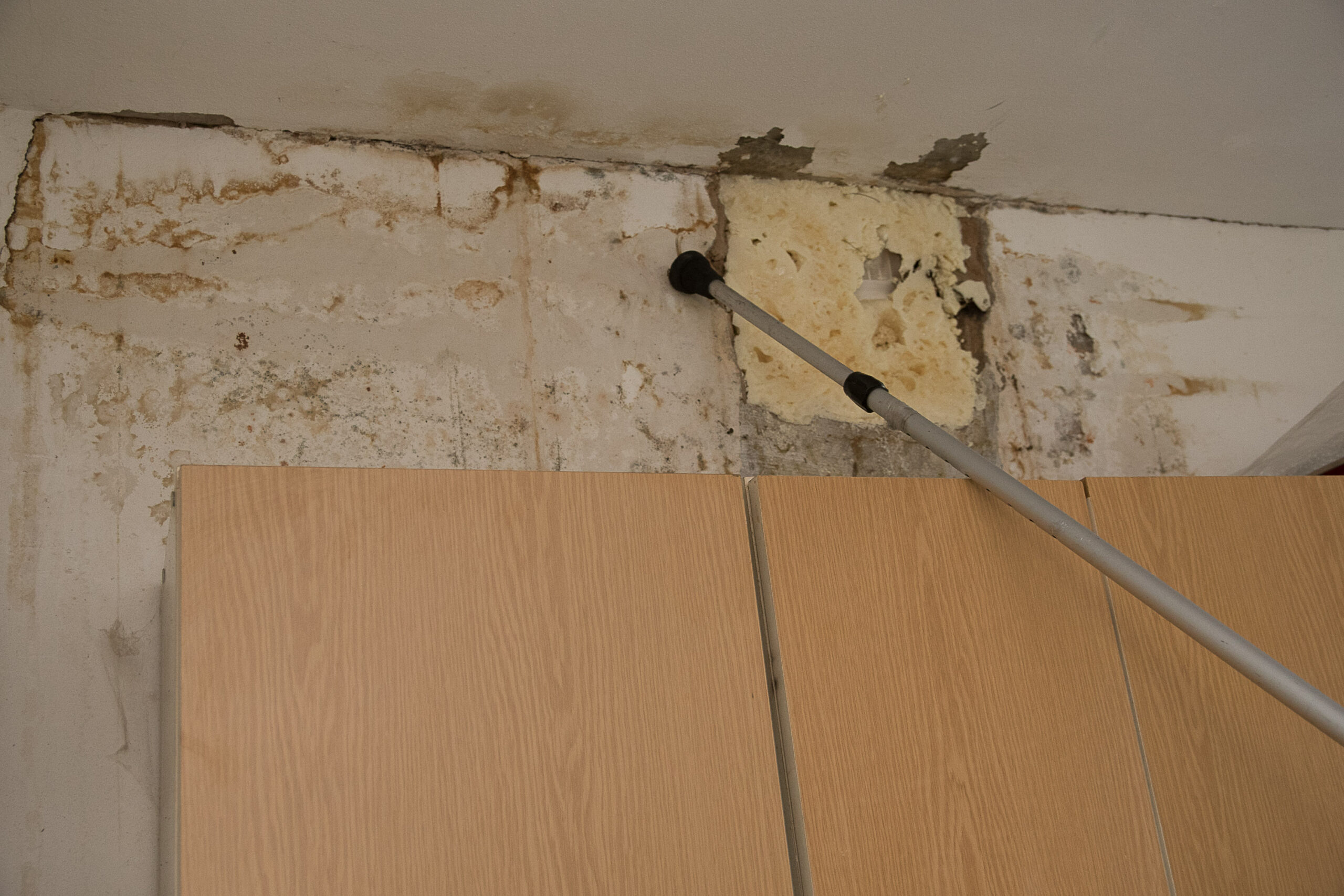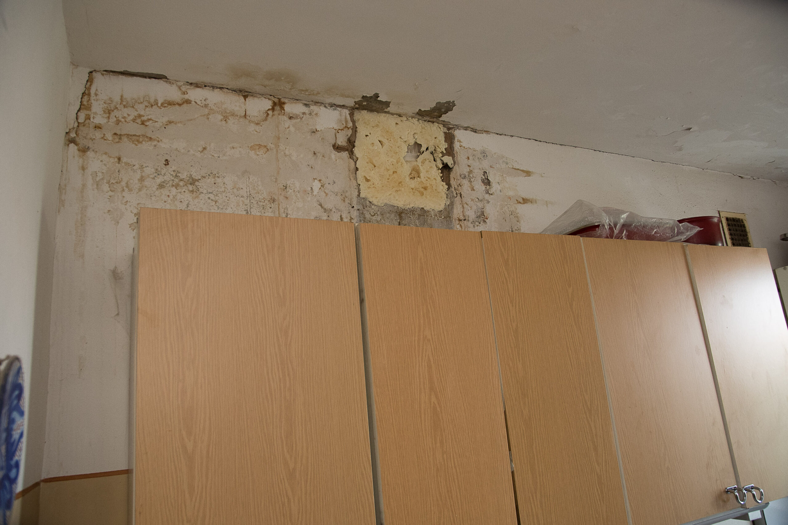 Kaip „Sekundei“ pasakojo Kniaudiškių gatvės 16-uoju numeriu pažymėto daugiabučio gyventojas, maždaug prieš tris savaites virtuvėje, kur eina kanalizacijos bei šalto ir karšto vandens stovai, pro lubas pradėjo sunktis vanduo. Jis apliejo dalį sienos, lubas. Dėl drėgmės perdegė šalia einantys elektros laidai.