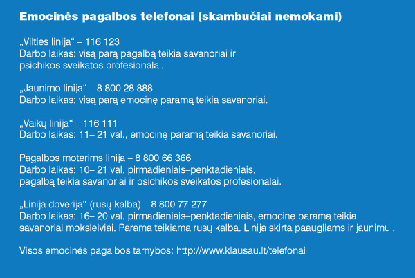 Anot jo, savižudybės kaip stigmos įvaizdis užkerta kelią atverti specialistų kabinetų duris, o to pasekmės dažnai – tragiškos.