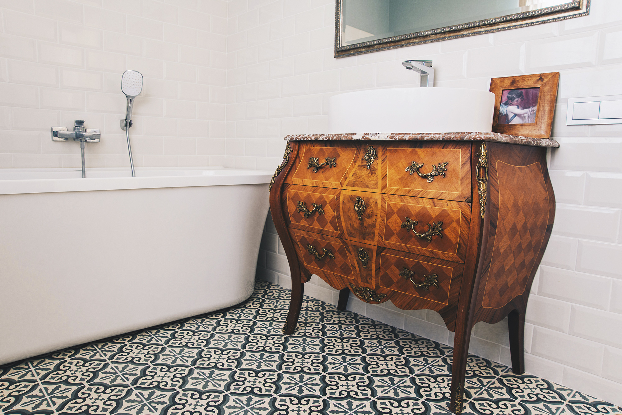 Rafinuotumo įspūdžiui sukurti šiame moderniame vonios kambaryje pastatytas Prancūzijos meistrų kūrinys – gerai išsilaikiusi dviejų šimtų metų senumo riešutmedžio komoda marmuro stalviršiu. Stalviršis buvo pergręžtas, kad tiktų moderni akmens masės plautuvė, stalčiai taip pat pakoreguoti santechnikos prietaisams paslėpti. Rezultatas – romantinio prancūziško buduaro baldas puikiai sujungia Andalūzijos raštus atkartojančių grindų plytelių žaismą ir švarias skandinaviškas sienų linijas.