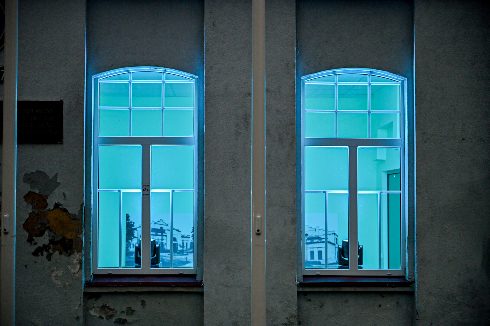 Keturi jo langai šviečia jaukia mėlyna spalva, penktasis, arkinis, langas apšviestas geltonai.
