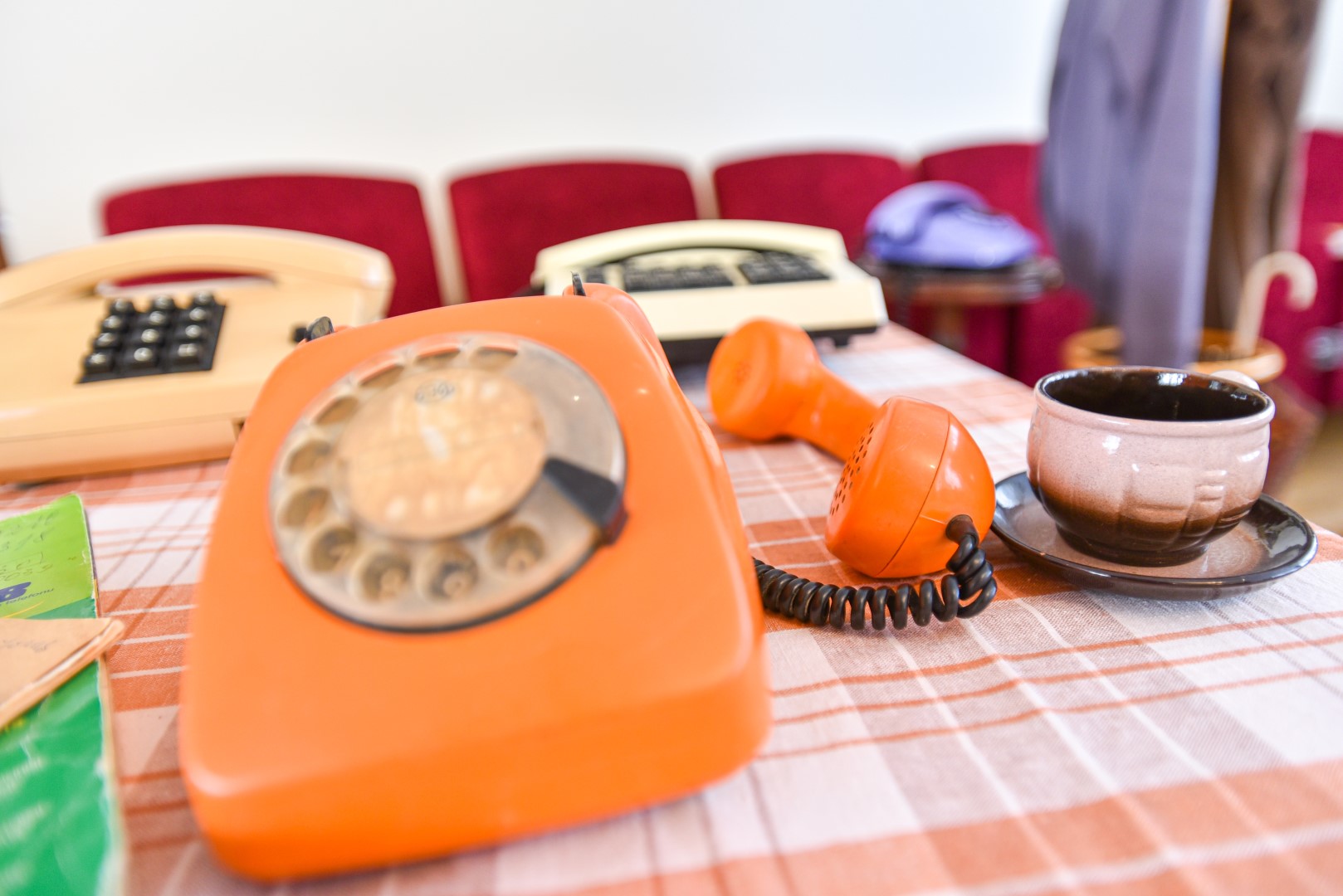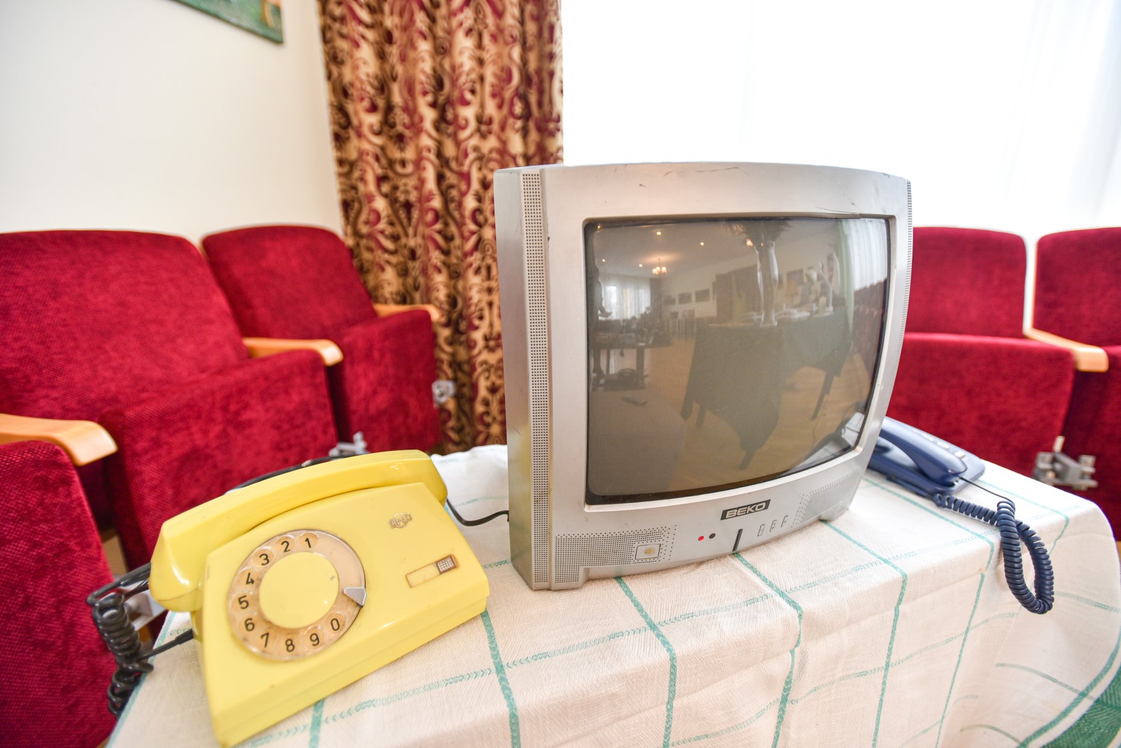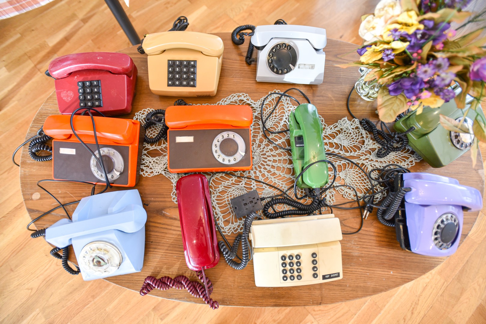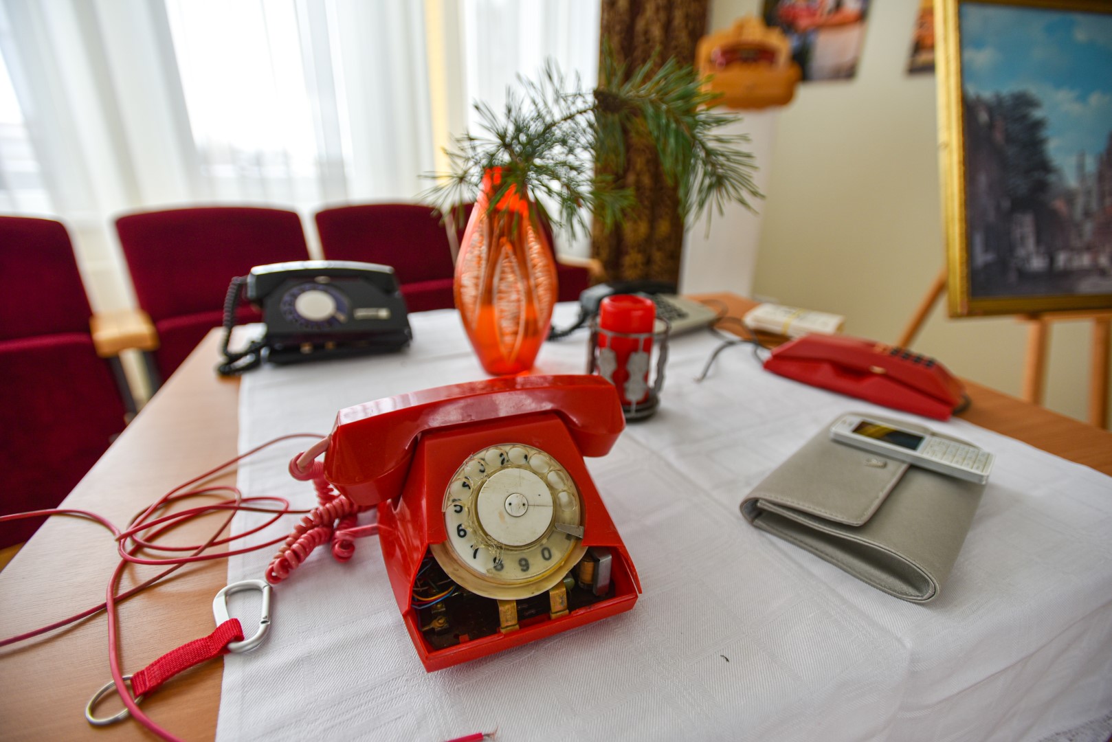 Telefonai ne šiaip išrikiuoti, o sukurta visa istorija, atsižvelgiant į aparatų amžių: kažkuris stovi koridoriuje, o šalia pirštinės, telefonų knyga ir akiniai, kiti įkurdinti improvizuotoje svetainėje. Dar turėtų atsirasti ir Lenino biustas, sovietinė eglutė.