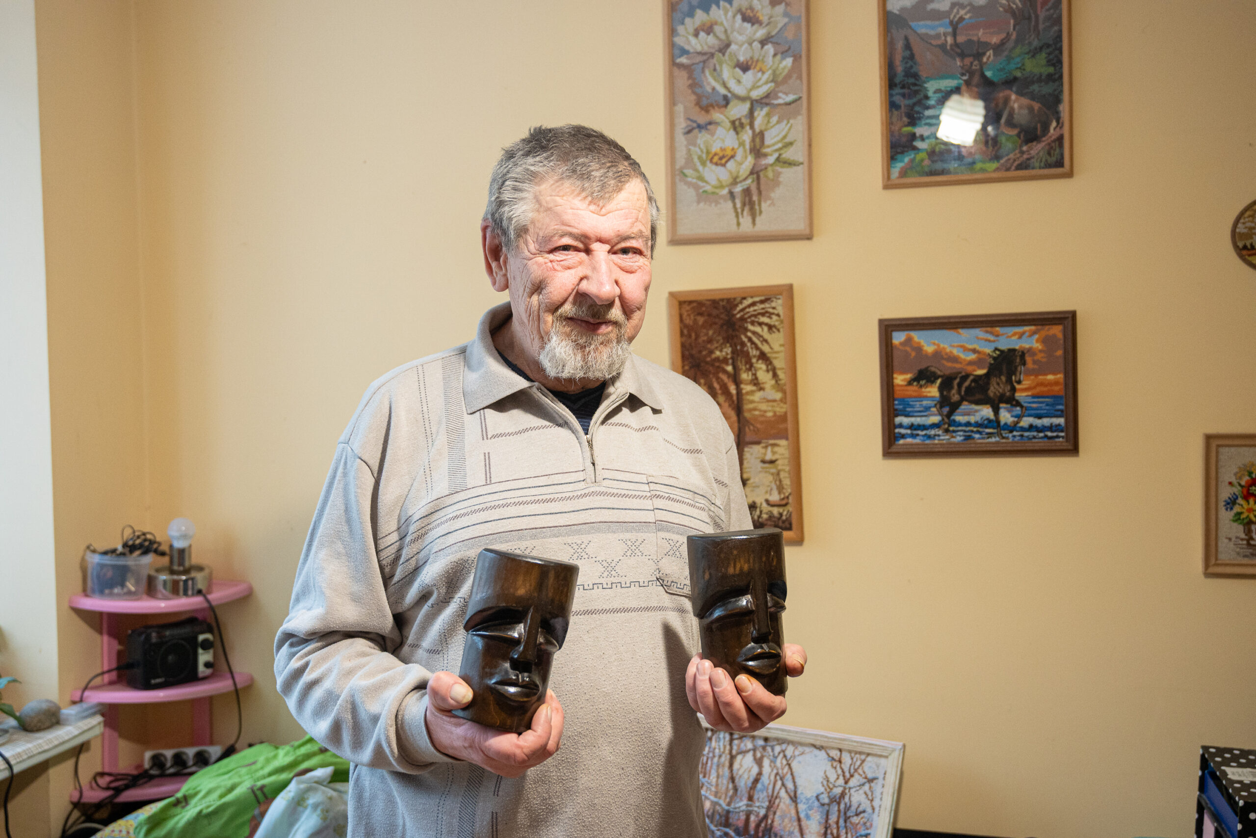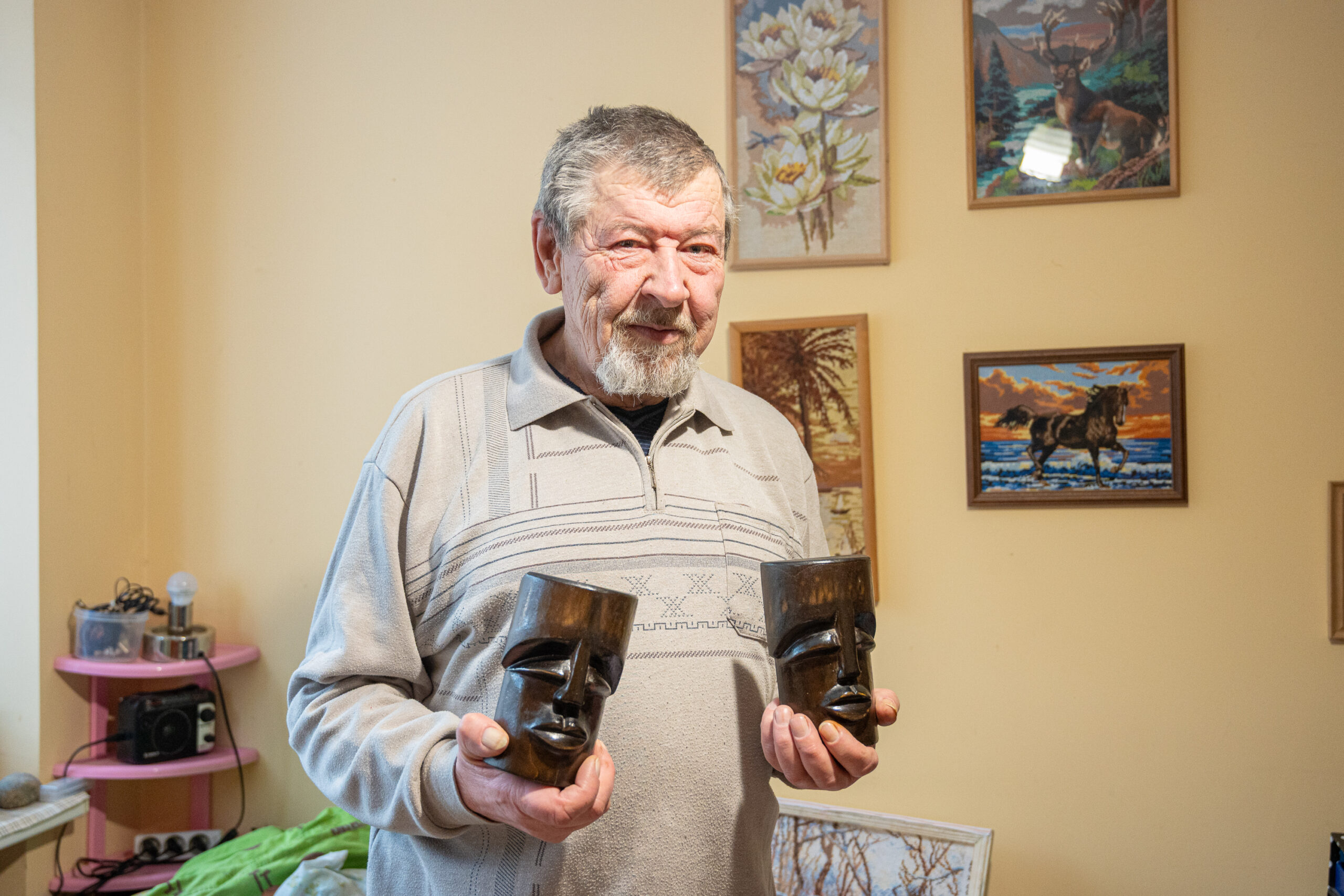 „Tiek priardžiau įvairiausių megztinių, kad iki dabar siūlais užverstas visas mano butas. Gyvenu viename kambaryje, nelabai turiu kur padėti tuos siūlus. Ir juos, kaip dėlionių dėžes, mielai dovanočiau“, – sako siuvinėtojas.
