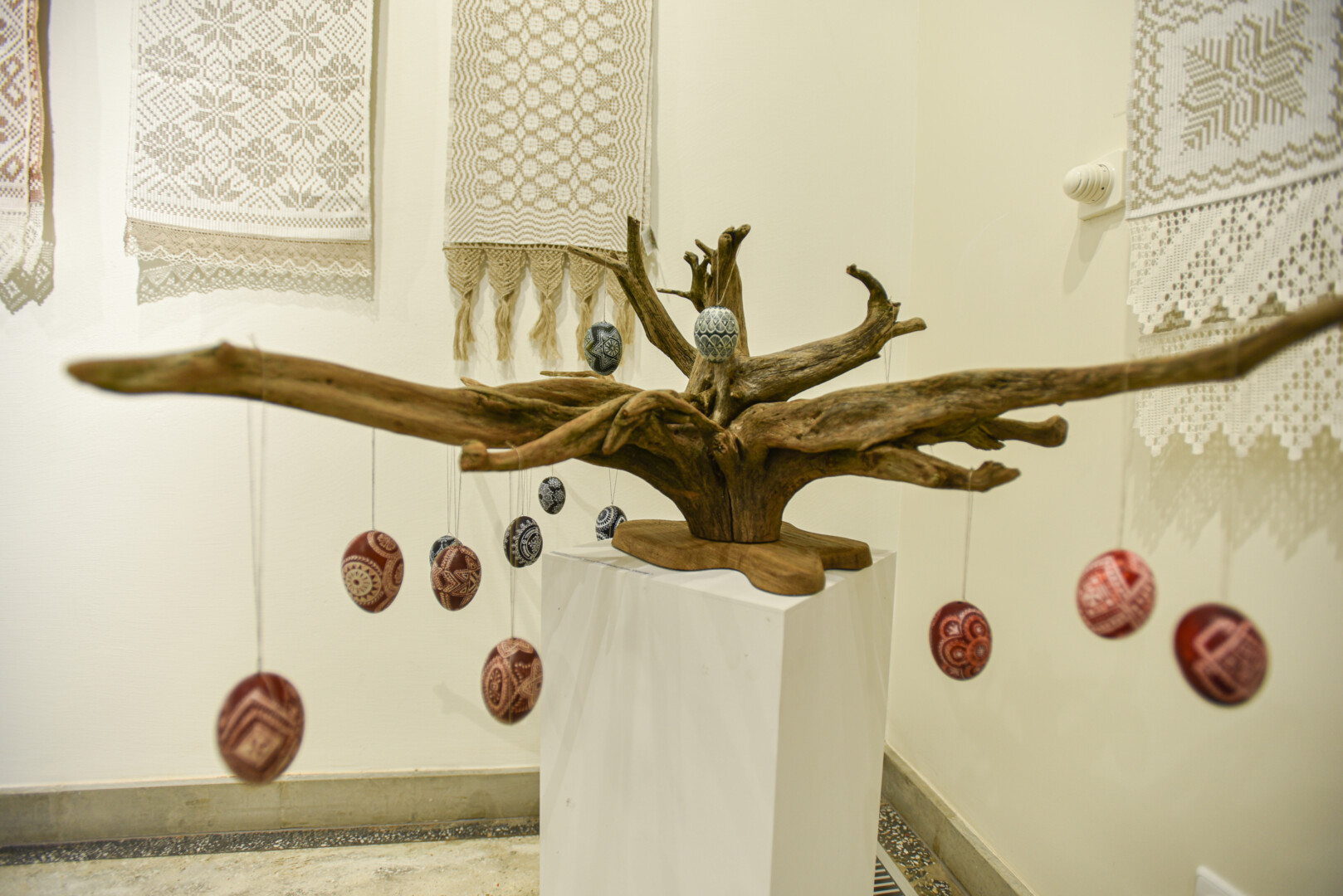 Krašto tautodailės parodoje ant sienų kaba peizažai, natiurmortai, kiti dailės darbai.
