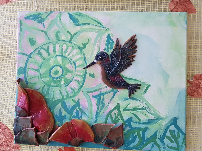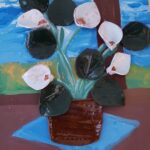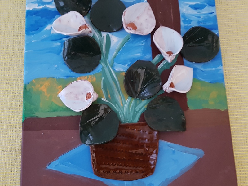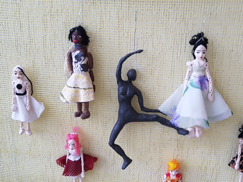 Kur visoje šioje gražioje puokštėje keramika? Ogi visur nuo pat pirmos klasės. Keramikos kabineto sienos ne vieną kartą buvo liudininkės įvairių anekdotinių situacijų. Mokytojos akyse dvejus su puse metų buvo kuriama lėlių kolekcija, katinų kolonija ir įvairūs koliažai. Kai pradėjo kurti koliažus, Austėja nebedirba viena. Būrelio draugai paprašo patarimo, pagalbos, norėdami išdekoruoti koliažo foną. Čia Austėja panaudoja Dailės mokykloje įgytas žinias.