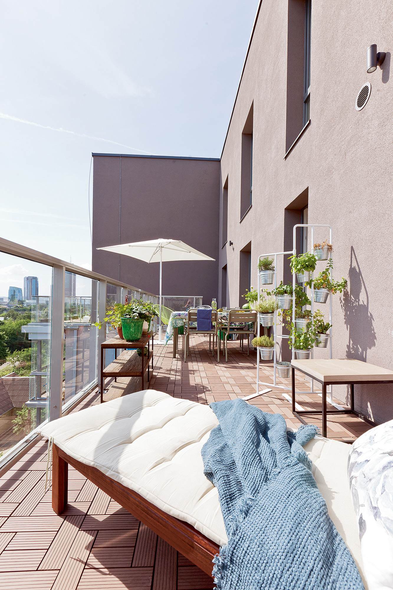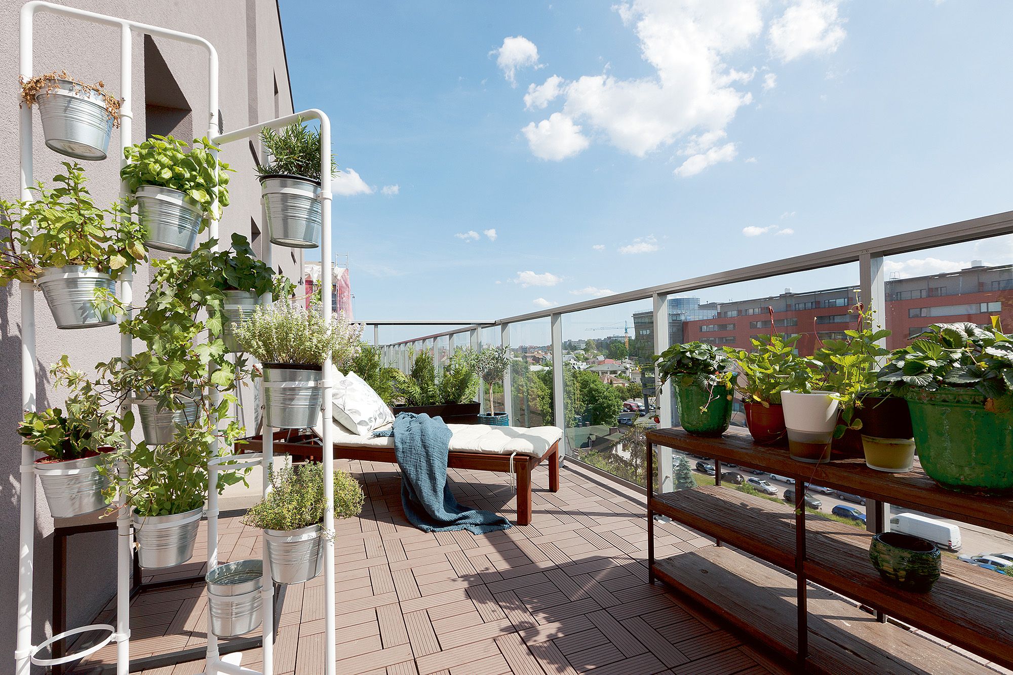 Šiltuoju metų laiku šeima pietų ir vakarienės mieliausiai sėdasi terasoje, į kurią patenkama tiesiai iš virtuvės. Stilinguose vazonuose žydi ne tik dekoratyviniai augalai: dvelkia bazilikai, mėtos, čiobreliai, pirmąjį derlių nokina paprikos ir pomidorai. Tarp šių kvapų ir spalvų pakako vietos ne tik stalui su kėdėmis, bet ir šezlongui.
