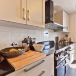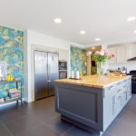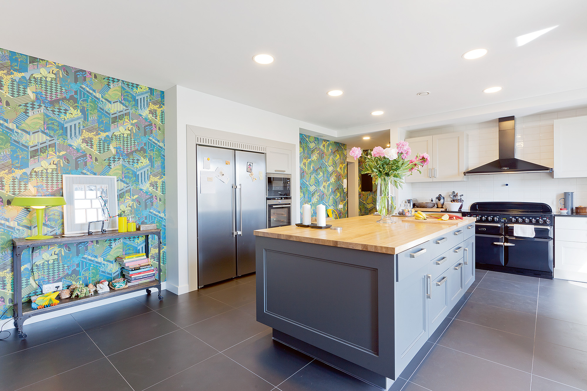 Būtent virtuvė yra ta erdvė, į kurią pirmiausia įžengia ir šeimininkai, ir svečiai. Kelios orkaitės, didžiulė sala patalpos centre, solidus daugybę rakandų slepiantis baldų komplektas signalizuoja, kad maisto gaminimas šeimai – ne kančia, o malonumas, kuriam skiriama daug dėmesio. Palyginti monochromišką virtuvės sienų ir baldų spalvų derinį papildo margi tapetų fragmentai ir detalės: nuo ryškiai salotinio žaismingo stalinio šviestuvo iki virtuvę svaiginančiu kvapu užliejusių bijūnų. Žaismingos indų, šviestuvų, tekstilės gaminių spalvos – lyg prieskonis, paryškinantis „skaniausius“ šio interjero elementus. „Jei manote, kad spalvų nebijau, tai iš tiesų labai bijau, bet su spalvų baime dirbu. Visos pagrindinės spalvos yra balta, pilka ir juoda. Spalvinu detalėmis ir tapetų raštų intarpais“, – sako „Retroformos“ įkūrėja. Daugiau spalvų virtuvėje ir gyvenamojoje zonoje, o miegamuosiuose vyrauja balta ir pilka.