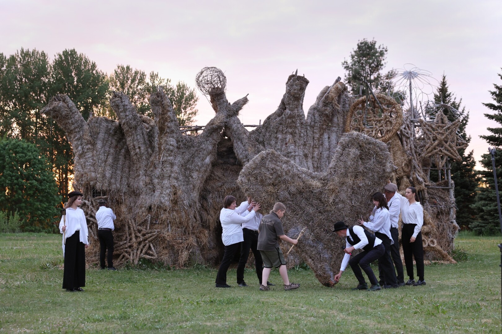 Surengus interaktyvų spektaklį „Kas iš tiesų nutiko katės namams?“ sekmadienio vakarą paskutinė parko skulptūra – šiaudinė pilis – atiduota ugniai.