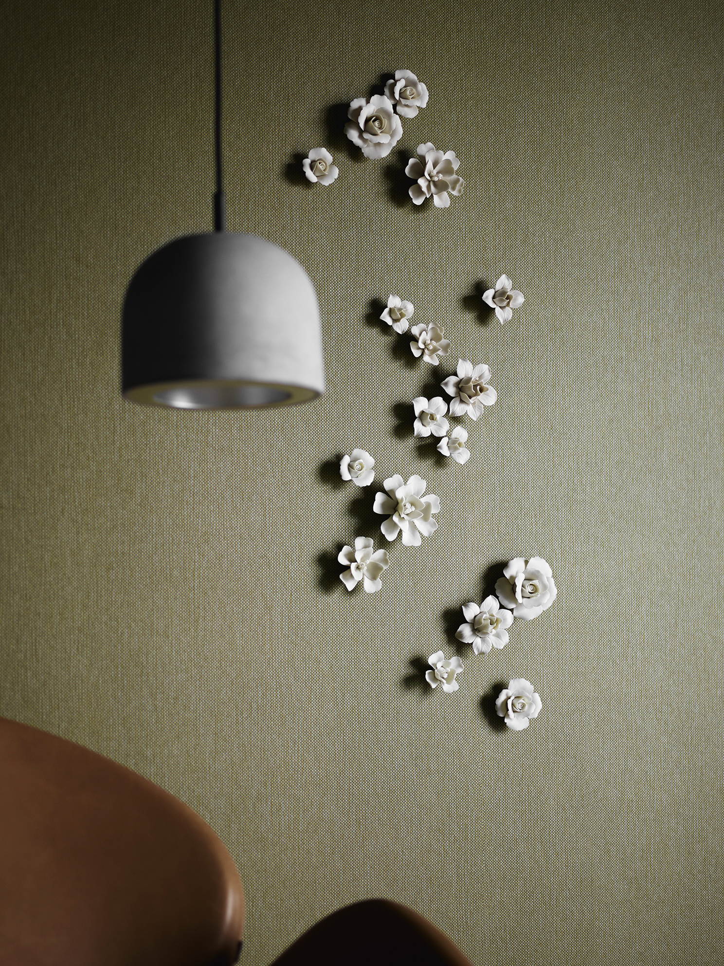 Porcelianinės gėlės – puiki sienų dekoro detalė miegamajam, kuriam neabejotinai suteiks romantiškumo. Pasirinkus tokį dekoravimo būdą, reikia pasistengti, kad kambaryje nebūtų kitokių ornamentų. Vienas variantas – naudoti tik gėlių motyvus, kurių gali atsirasti ant lovatiesės ar pagalvėlių. Siena, ant kurios bus klijuojamos porcelianinės gėlės, turėtų būti vienspalvė.