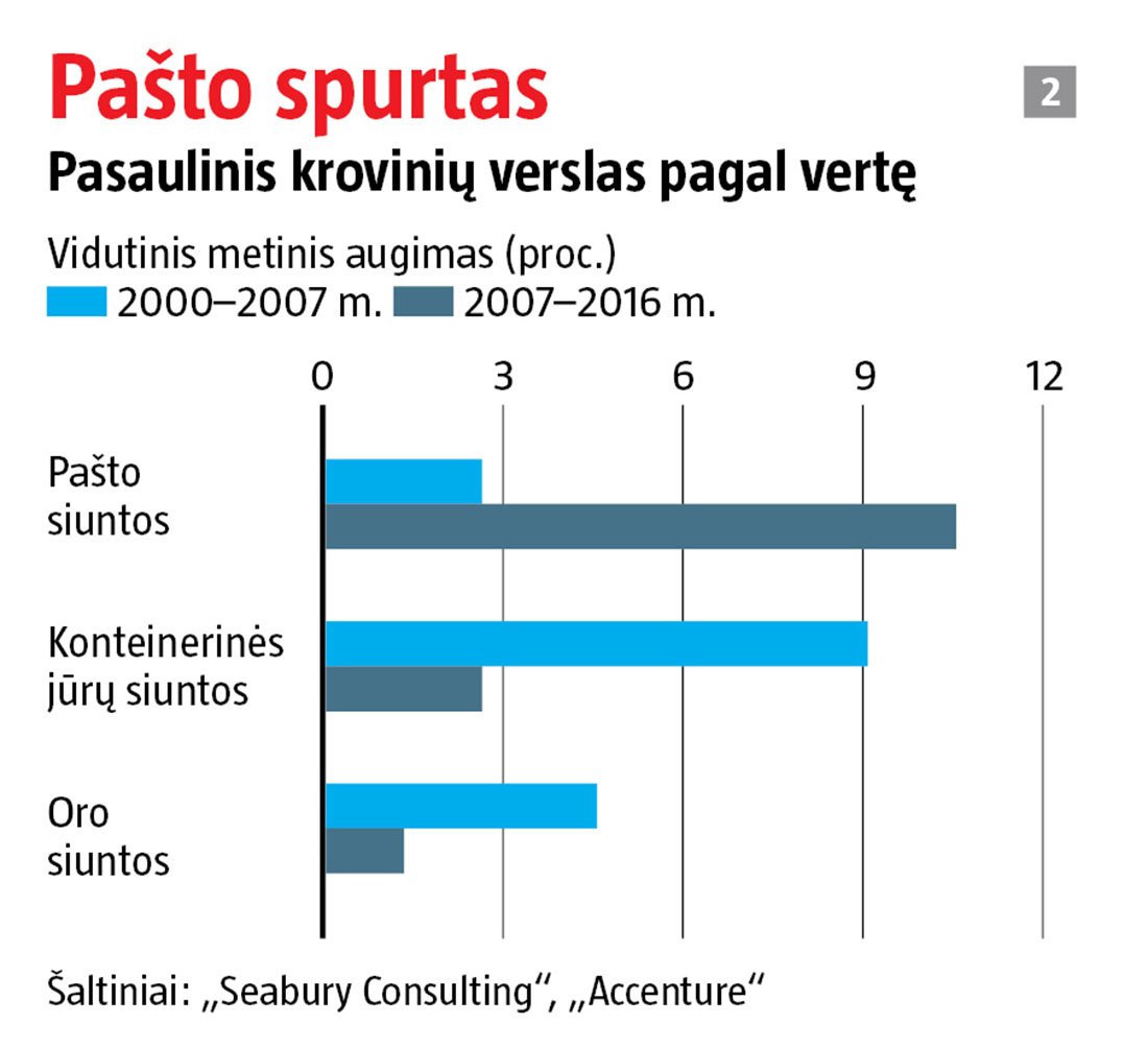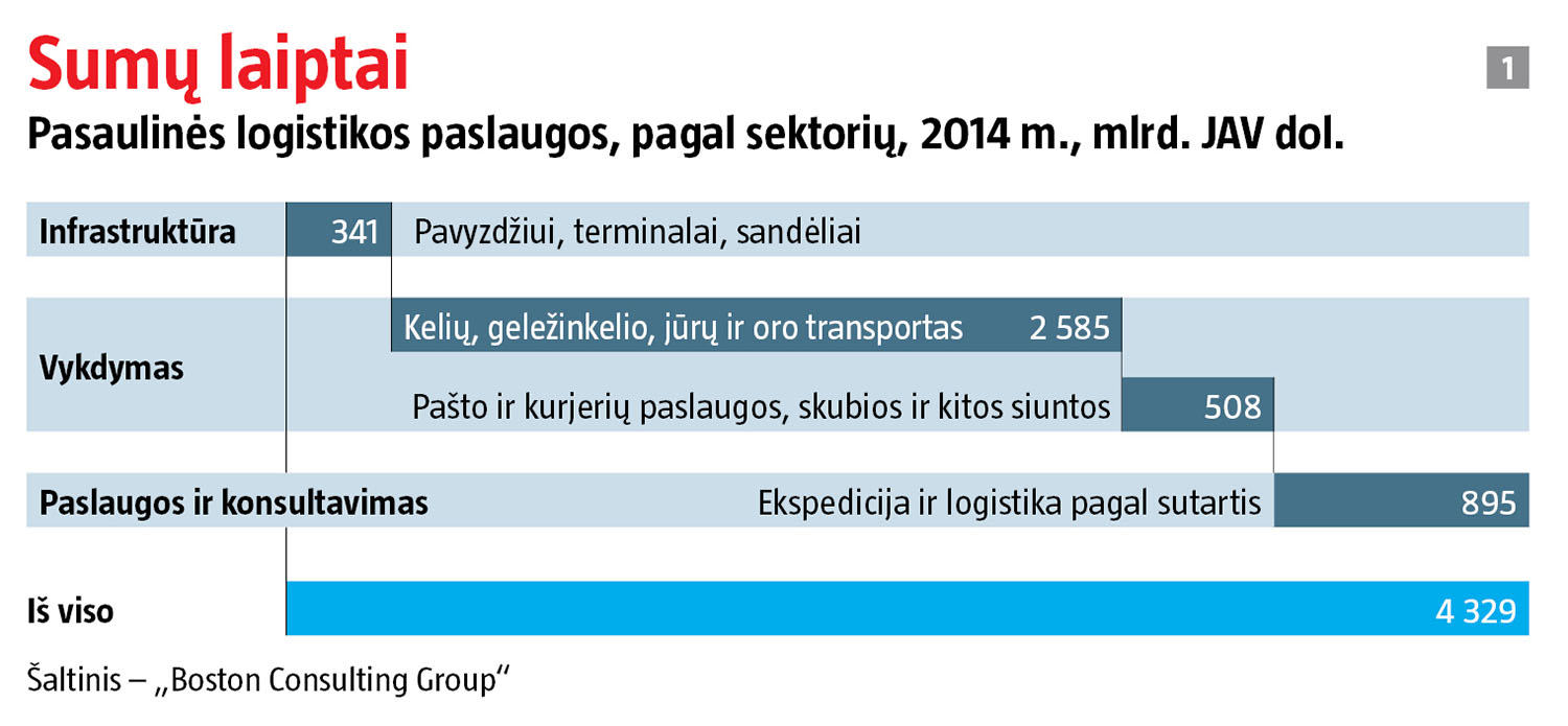 Taigi dauguma prekių po pasaulį keliauja pasirinkus antrą variantą – konteinerius. BCG duomenimis, užsieninių krovinių verslo pajamos siekia 2,6 trln. JAV dolerių per metus. Nemažą tų pajamų dalį pasiima tarpininkai. Darbui su muitine, draudimui, perkėlimui iš jūros į kelius ar ant geležinkelio ir visai kitai fizinei, procedūrinei ir biurokratinei gaišačiai, kurios neįmanoma išvengti gabenant krovinius, reikia ekspeditoriaus paslaugų. Tokios įmonės susižeria daugiau kaip penktadalį logistikos sektoriaus pajamų (žr. 1 grafiką). Kartais joms tenka net 45 proc. nuo visos pristatymo kainos. 2016 m. „Deutsche Post DHL“ grupei priklausančio ekspeditoriaus pajamos viršijo 26 mlrd. JAV dolerių. Mažesnių konkurenčių, t. y. šveicarų „Kuehne + Nagel“ ir vokiečių „DB Schenker“ uždarbis siekė atitinkamai 20 mlrd. ir 17 mlrd.