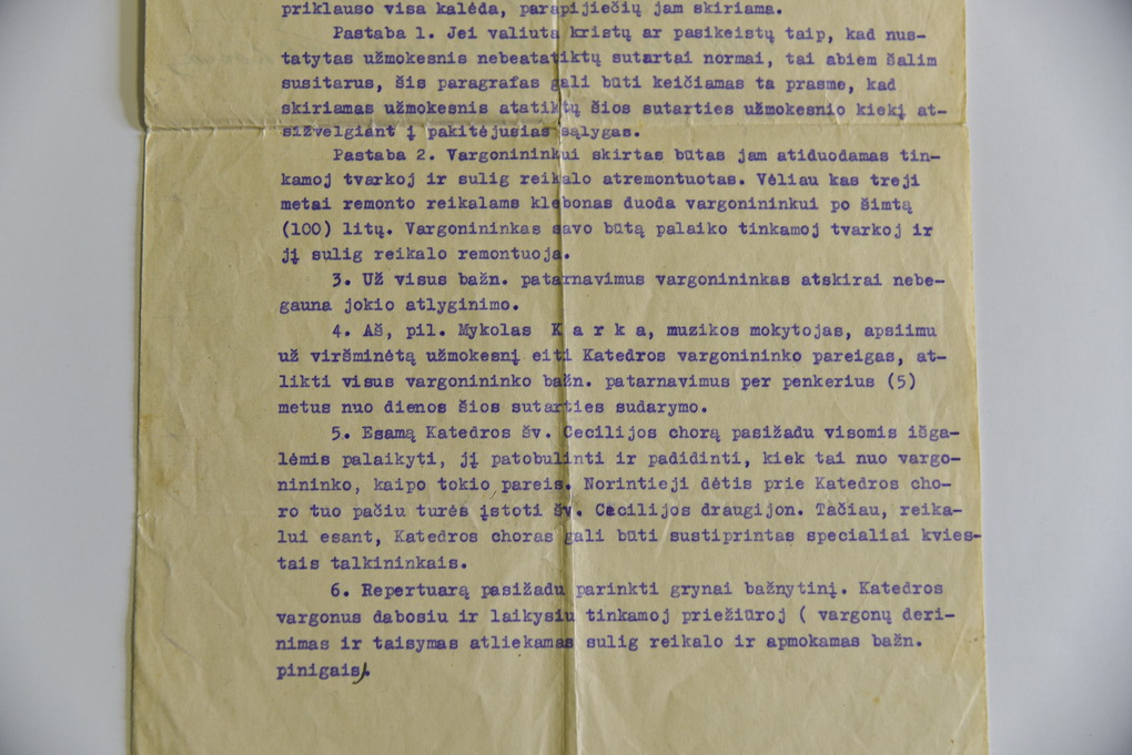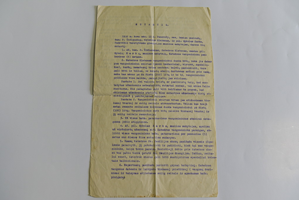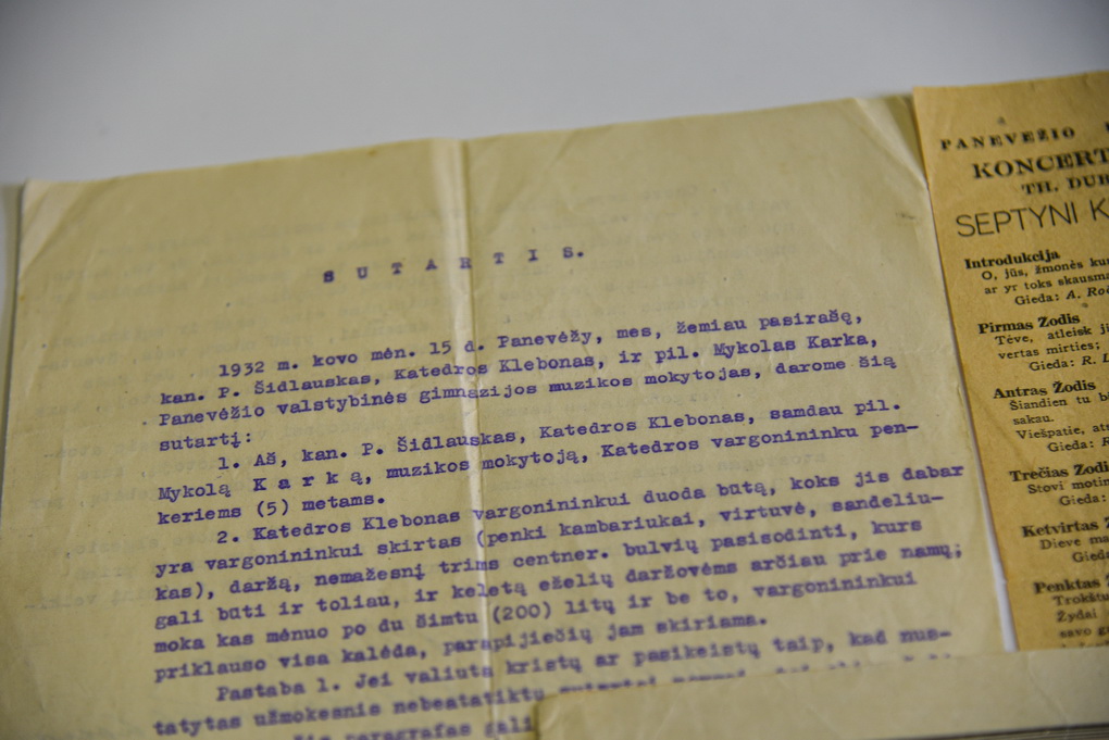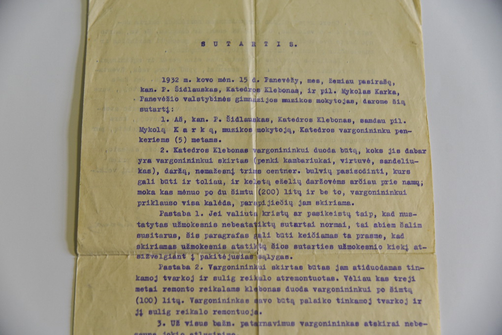 Muziejaus saugomame M. Karkos archyve galima išvysti itin įdomų dokumentą – 1932 metais su Panevėžio Kristaus Karaliaus katedros klebonu Povilu Šidlausku pasirašytą sutartį. Pagal ją muzikas buvo pasamdytas penkeriems metams dirbti vargonininku katedroje.