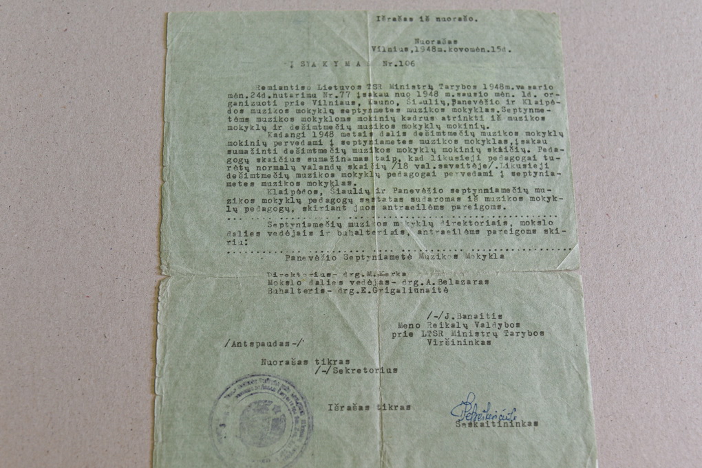 Muziejaus fonduose galima pamatyti dokumentus, patvirtinančius tokios iniciatyvos – ugdyti muzikalius piliečius – sėkmę. Pavyzdžiui, 1948 metų Meno reikalų valdybos prie LTSR Ministrų tarybos viršininko Juozo Banaičio įsakymą. Juo, pasak R. Stružienės, penkiuose didžiuosiuose šalies miestuose prie veikiančių muzikos mokyklos įsakyta organizuoti septynmetes muzikos mokyklas.
