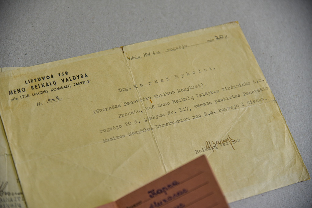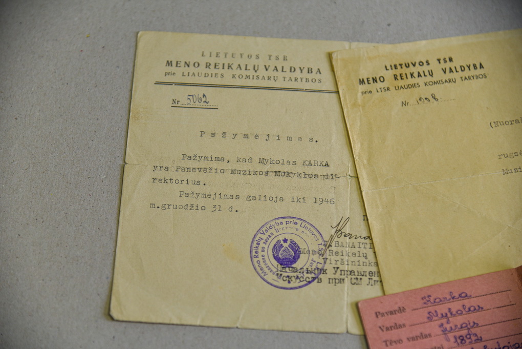 Saugomas ir M. Karkos prašymo atleisti iš Muzikos mokyklos vadovo pareigų pablogėjus sveikatai juodraštis, ir 1950 metų birželio 6 dienos įsakymo atleisti iš pareigų, paliekant dėstytoju, rankraštis.