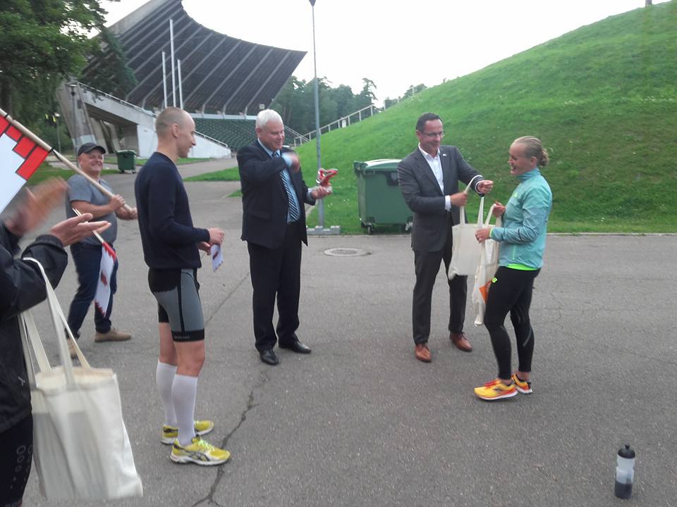 Išlydėti žygio dalyvių atvyko Panevėžio miesto meras Rytis Račkauskas, kuris atletams įteikė miesto vėliavą ir dovaną Klaipėdos merui – žymaus Panevėžio stiklo menininko Remigijaus Kriuko kurtą trilapį žiedą, simbolizuojantį tris sporto šakas.