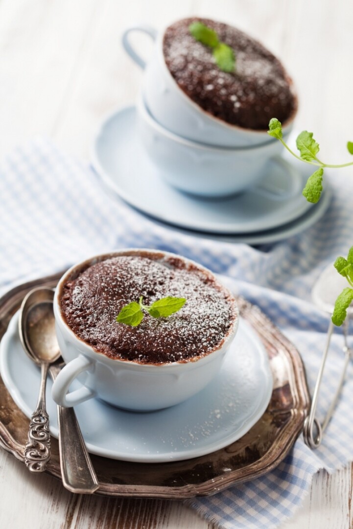Reikės (4 porcijoms): 80 g miltų, 4 šaukštų kakavos miltelių, 4 šaukštų cukraus, 0,5 šaukštelio kepimo miltelių, žiupsnelio druskos, 120 ml pieno, 4 šaukštų aliejaus, 80 g juodojo šokolado.