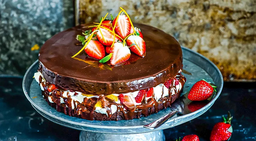 Reikės (8 porcijoms): 4 šaukštų kakavos miltelių, 4 šaukštų vandens, 3 vidutinių apelsinų, 200 g sviesto, 200 g smulkaus cukraus, 3 kiaušinių, 200 g miltų, 1 šaukštelio kepimo miltelių, 250 ml riebios grietinėlės, 400 g braškių; glajui: 100 g sviesto, 100 g juodojo šokolado (70 proc.), 100 g cukraus; papuošti: 2 mėtos šakelių.