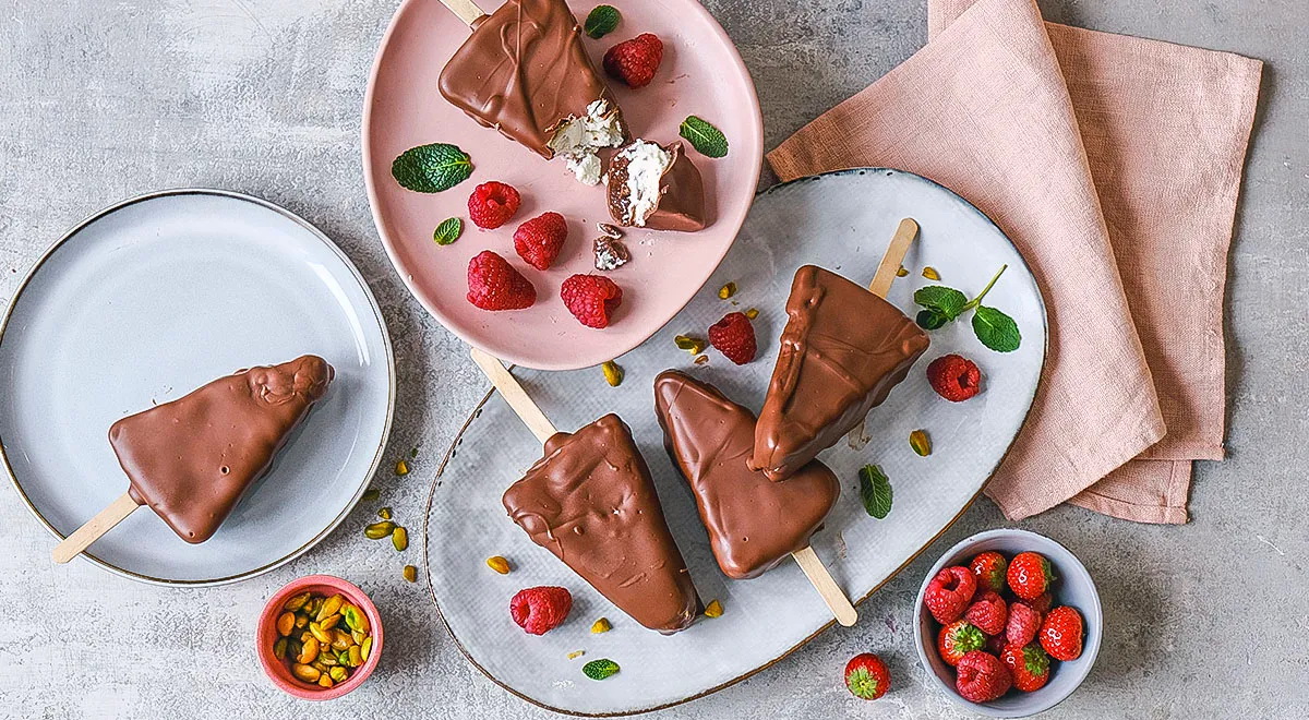 Išklokite padėklą pergamentiniu popieriumi. Ant jo dėkite šokoladu aplietus „eskimo“ ir palaikykite 10 minučių, kad sustingtų.