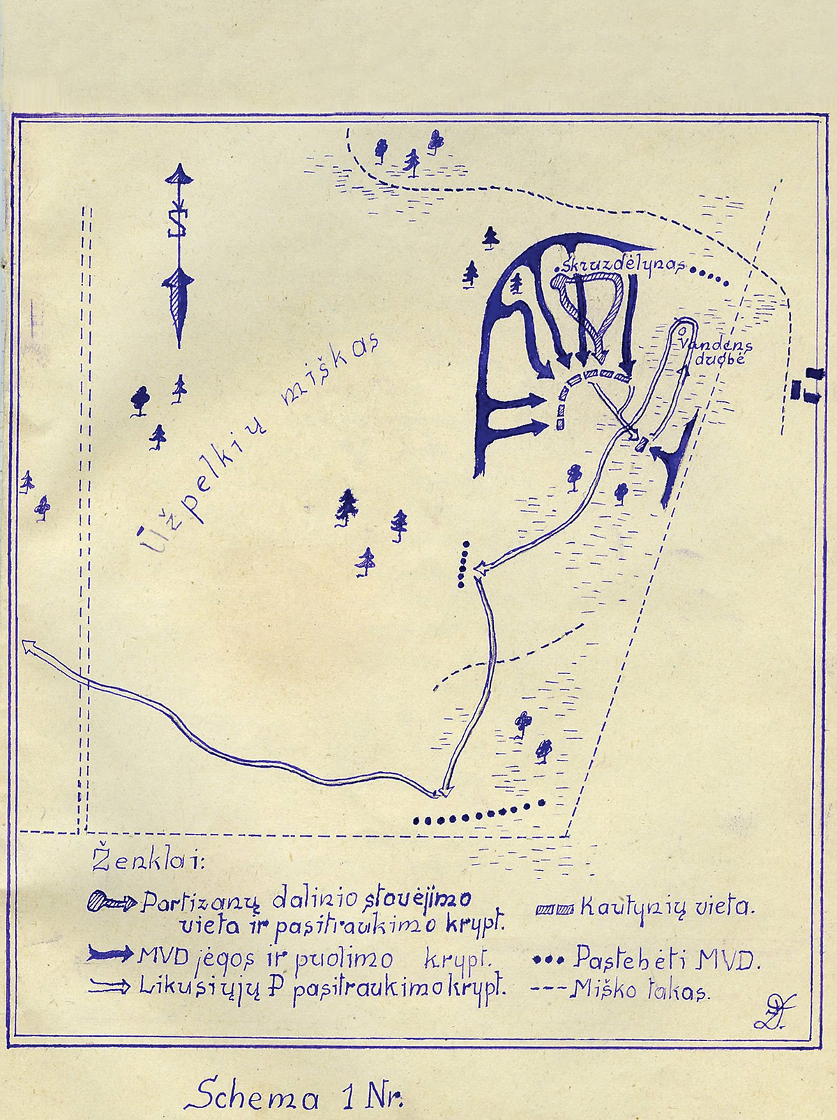 Dar prieš pradėdami kautynių vietos paieškas tyrėjai iš istorinių dokumentų žinojo, kad vienas partizanų – L. Mingėlas-Džiugas – buvo stipriai sužeistas, bet V. Šniuolis-Vytvytis patraukė jį iš kautynių lauko ir nunešė ant pečių bene aštuonis kilometrus iki to paties Minaičių bunkerio, kur prieš pusę metų buvo pasirašyta nepriklausomybės deklaracija. Ten Džiugas ir gydytas, o apsveikęs nupaišė schemą, kuri pateko į Lietuvos ypatingąjį archyvą ir, kaip vėliau įsitikino tyrėjai, buvo gana tiksli. Šioje buvo pažymėta stovyklavietė, apsupimo vietos, puolimo ir atsitraukimo kryptys, miško keliukai, kvartalai, mūšio eiga. Tereikėjo, regis, nedaug – schemą, sudėjus kartu su rašytiniais šaltiniais, „pritaikyti“ vietovėje. Bet tai truko dvejus metus.