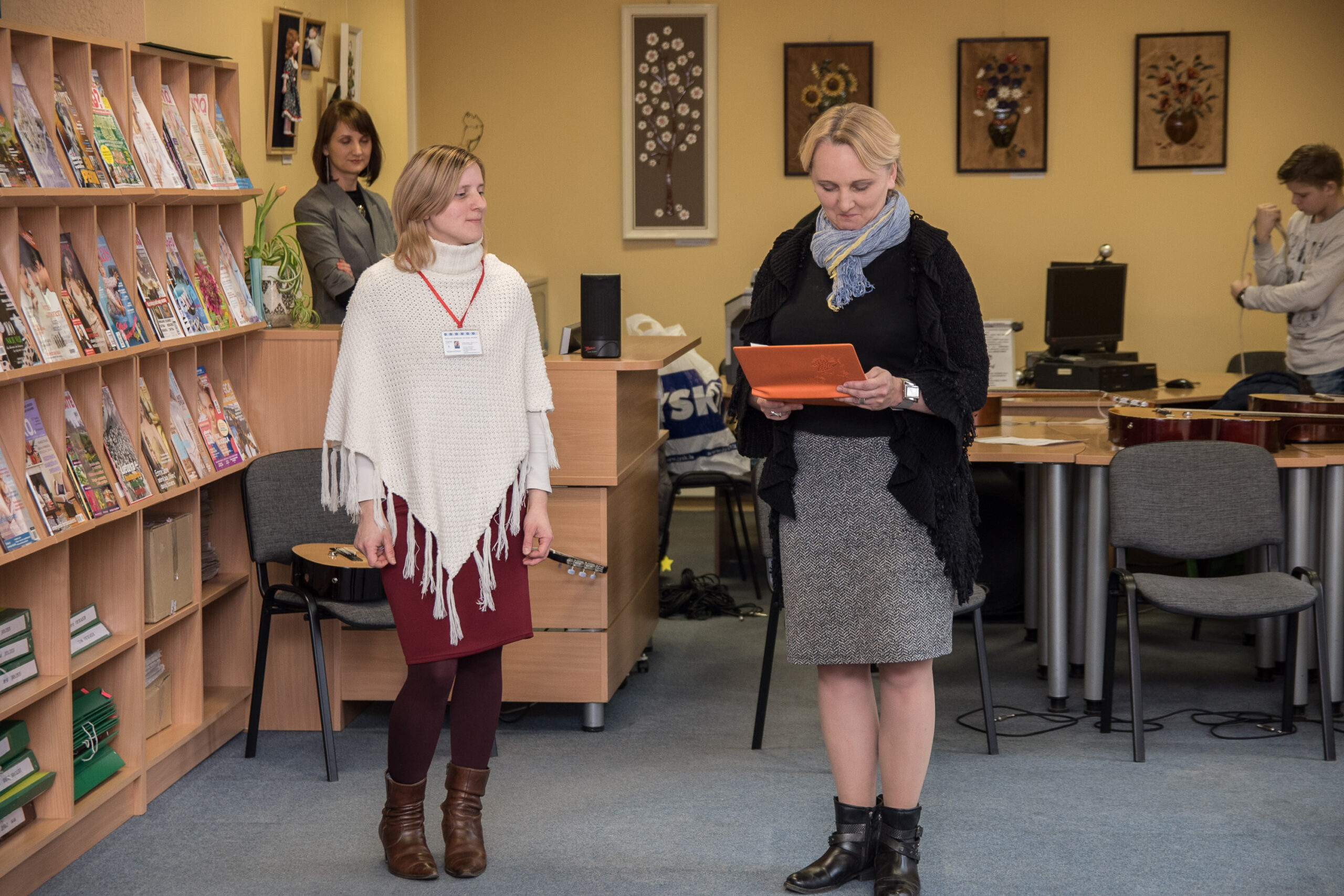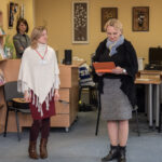 Vaikų kūrybiškumo lavinimo studijos „Deimančiukai“ savanorė džiaugiasi, kad į parodos atidarymą atėjo ir studijos vadovė Aušra Lukoševičiūtė, ir kiti jos kūrybą vertinantys žmonės.