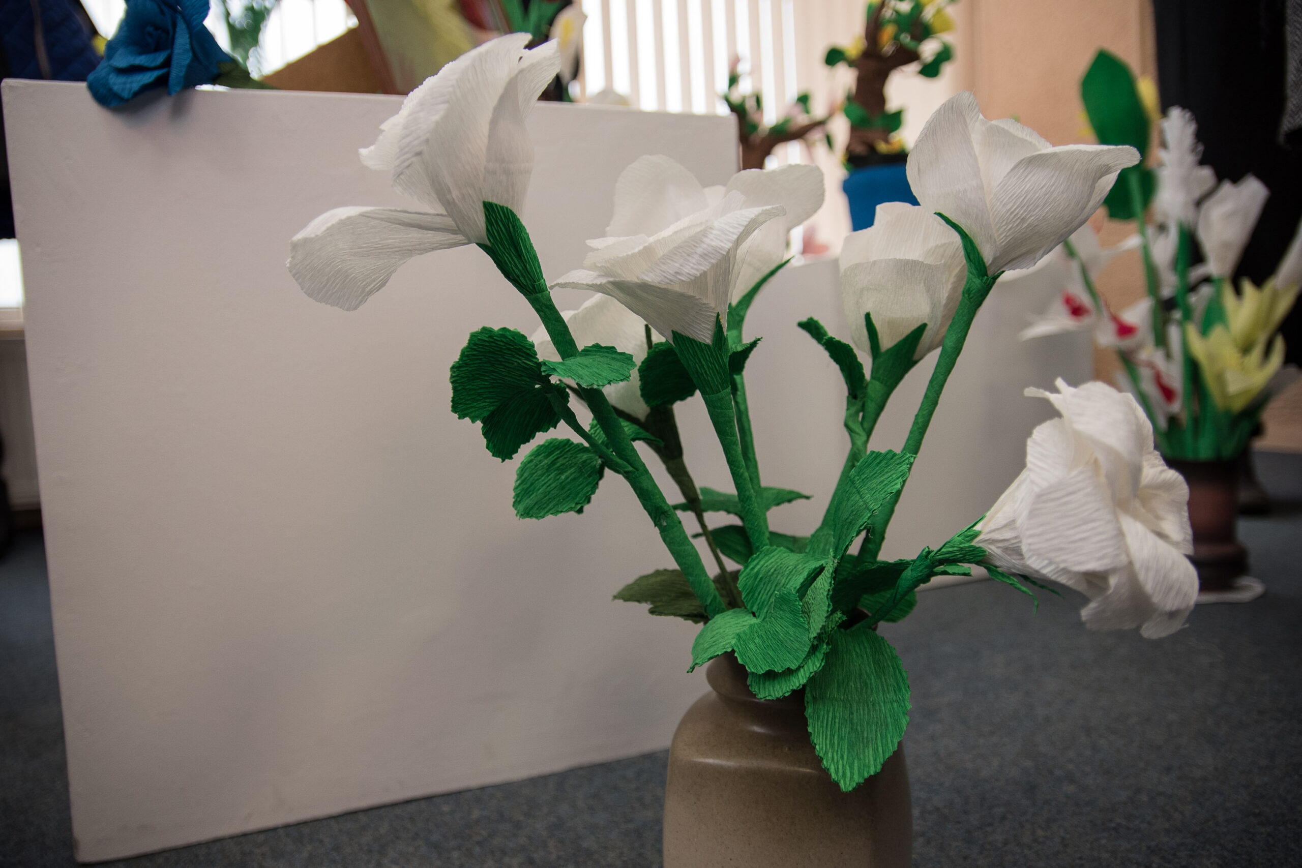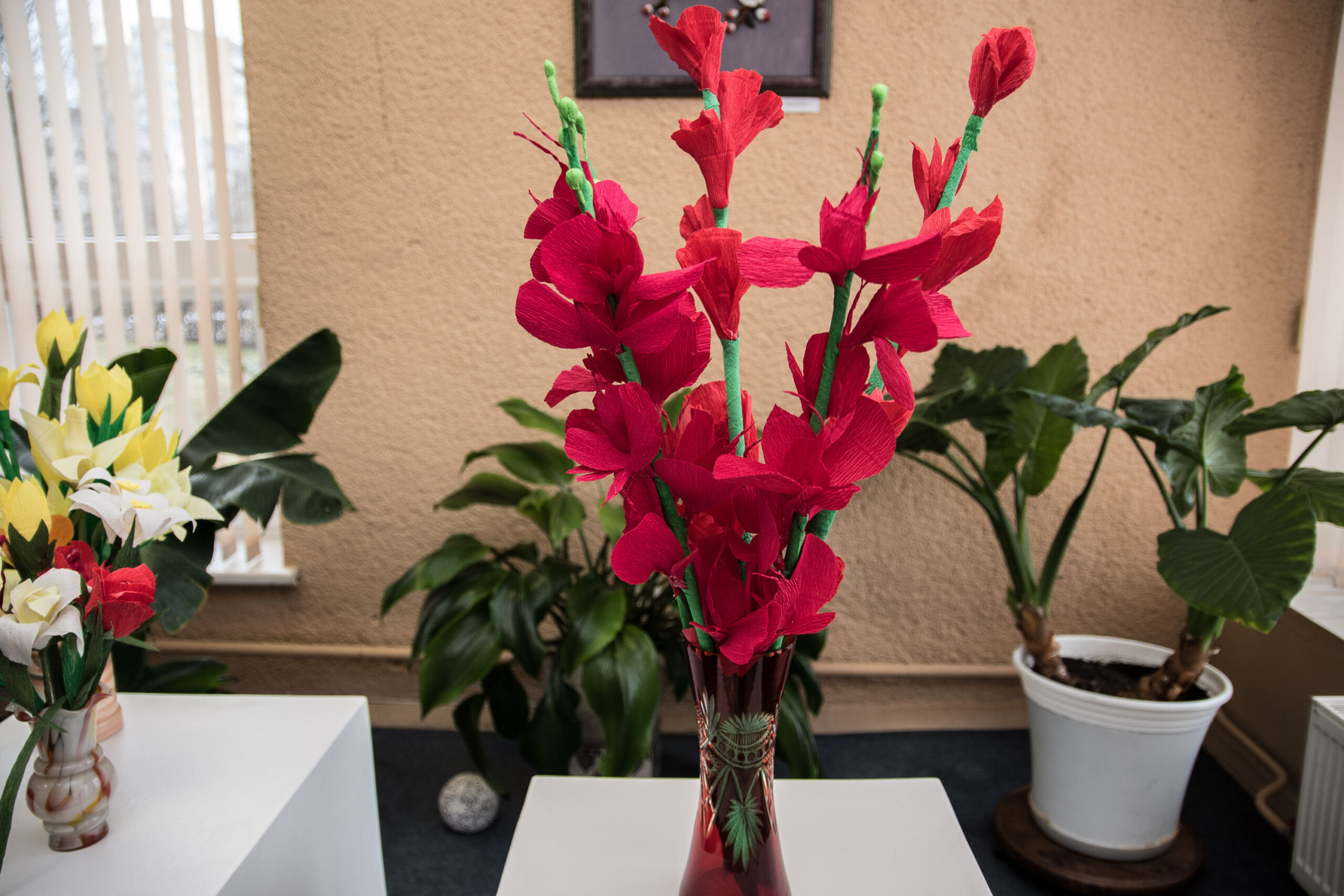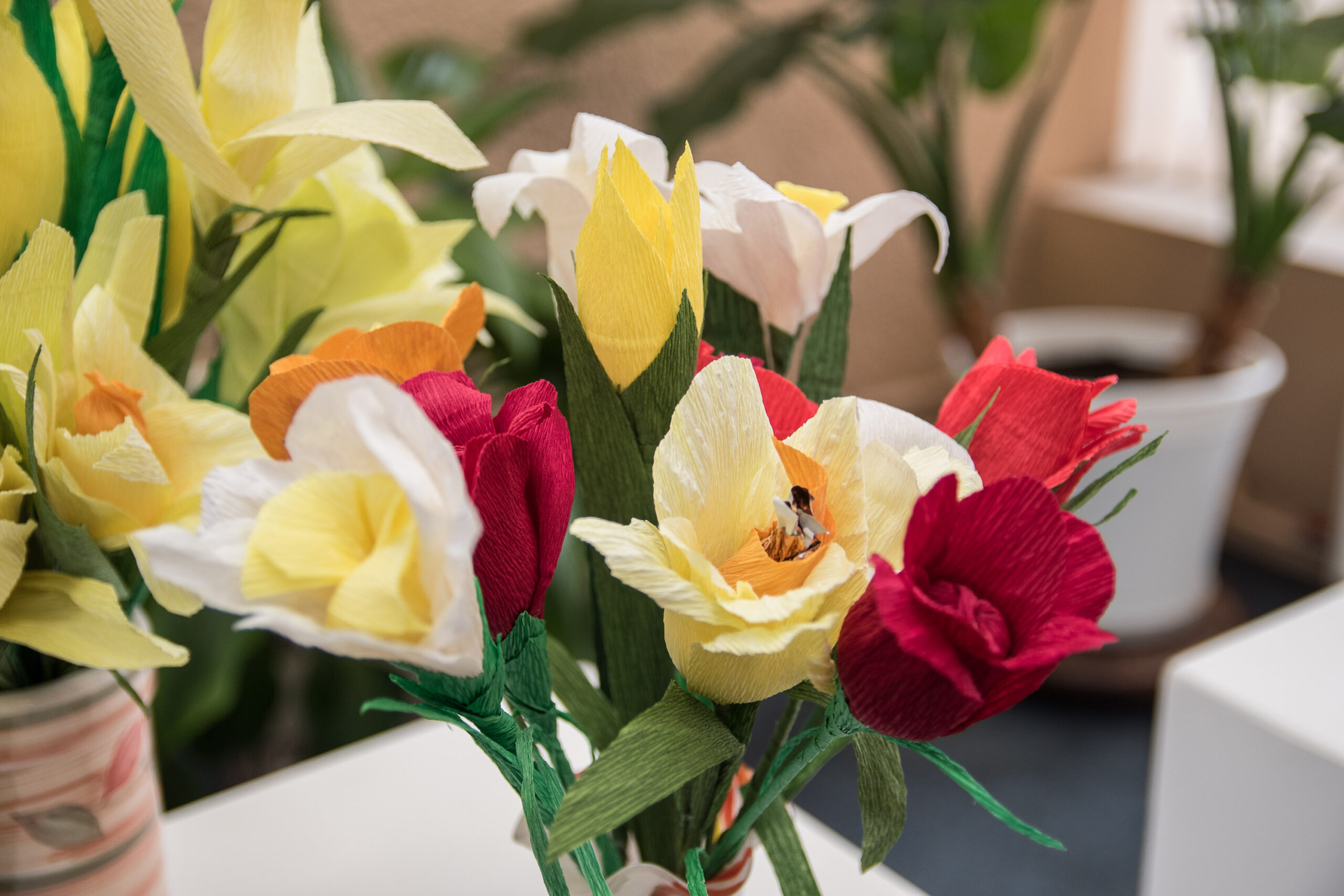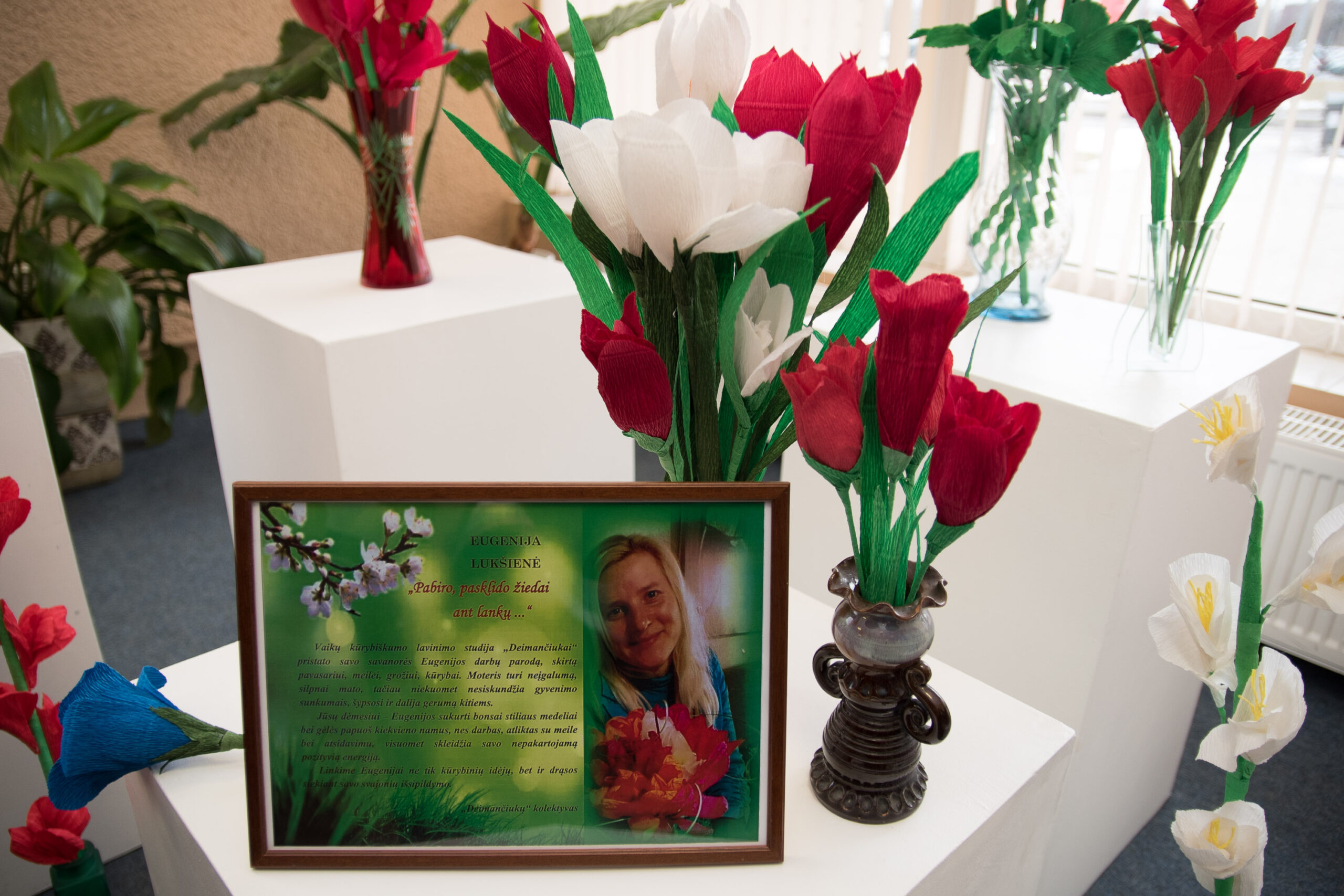 Prieš porą metų į kūrybines paieškas leidosi ir panevėžietė Eugenija Lukšienė. Jos pasirinktas kūrybos būdas – iš krepinio popieriaus daromos įvairiaspalvės gėlės.