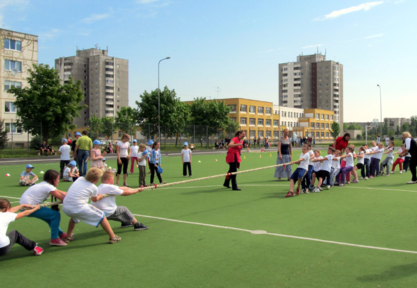 Po šventės atidarymo mažieji mokyklos bendruomenės nariai dalyvavo linksmosiose estafetėse: rideno gimnastikos kamuolį, šokinėjo maišuose, lazda rideno teniso kamuoliukus, lindo pro medžiaginius tunelius ir kt. Nuotaikingai vyko virvės traukimo varžybos. Savo atžalų atėjo palaikyti mokinių tėveliai.