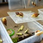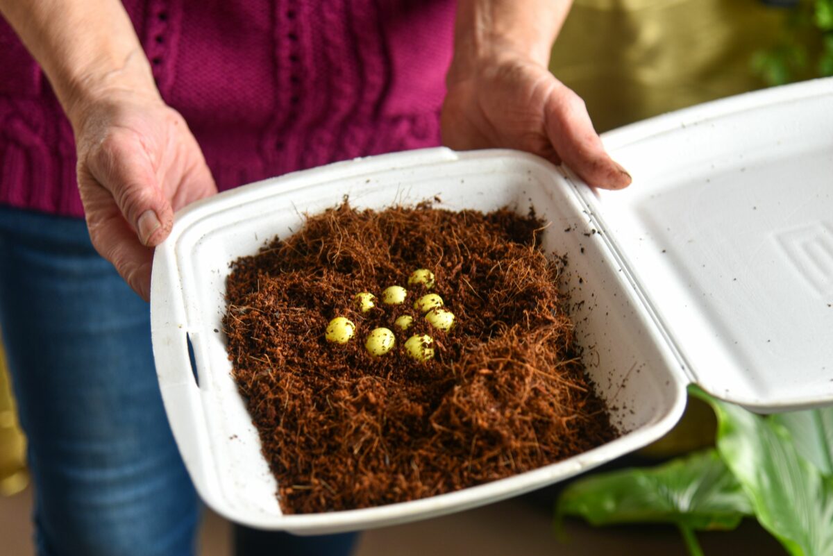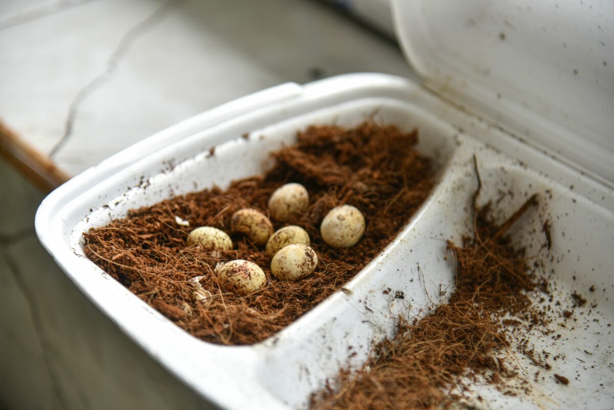 Mažose dėžutėse achatinų kiaušiniai per gerą mėnesį, nieko nedarant, virsta sraigiukais.