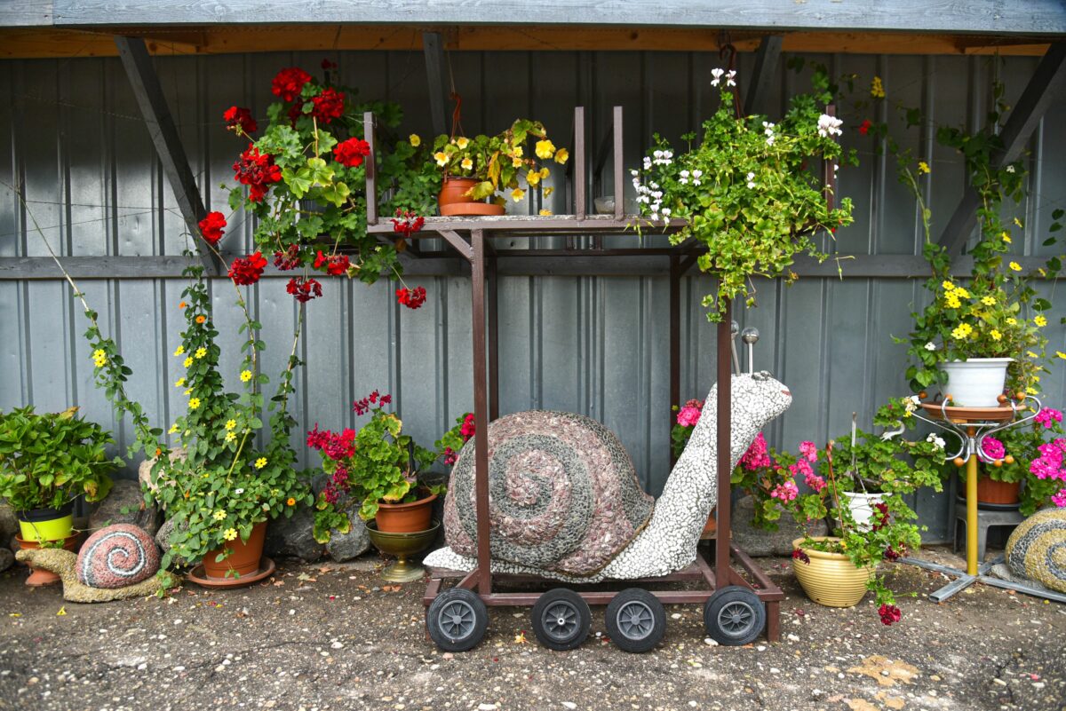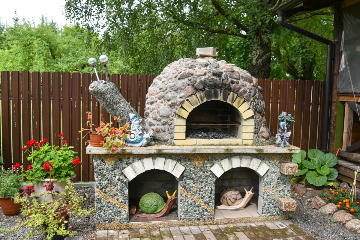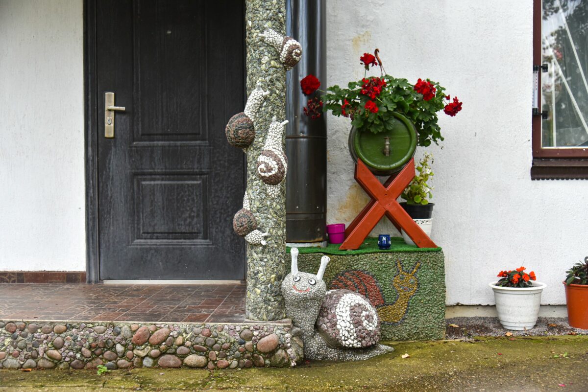 Krikštaponių sodyboje ant kiekvieno kampo pasitinka pačios šeimininkės gamintos dekoracijos: molinės, betoninės, akmenukais lipdytos sraigės ant namų sienų, ant kolonų, ant tvorų ir gėlynuose. Svečiams Janina iš modelino prilipdžiusi ir mažyčių suvenyrų lauktuvėms. Kieme – sraigienos gaminių krautuvėlė, cechas.