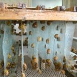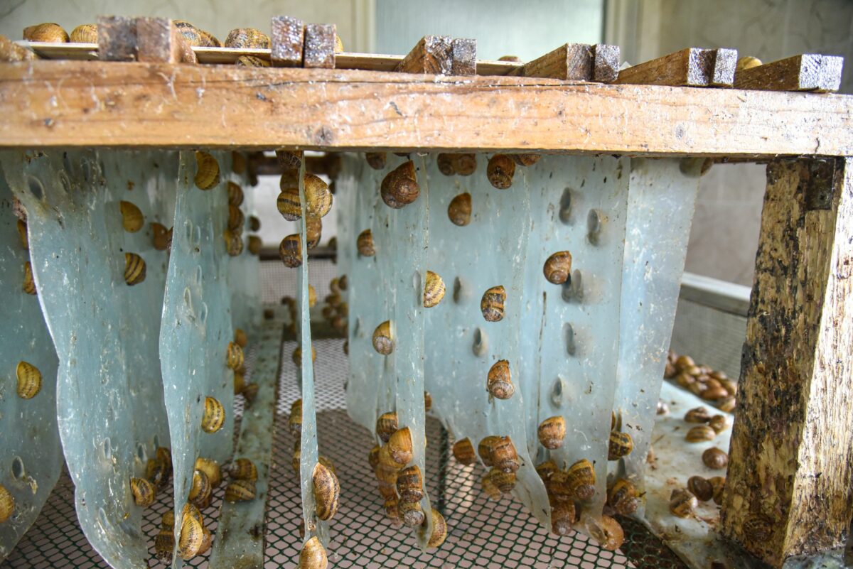„Sraigė – naktinis padaras, dieną ji miega“, – pasakoja J. Krikštaponienė, kilstelėdama vieną aptvaro konstrukciją. Jos apačioje prilipusi visa sraigių jūra.