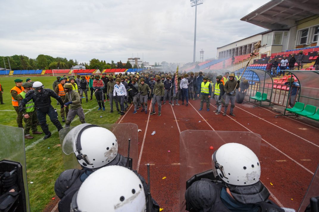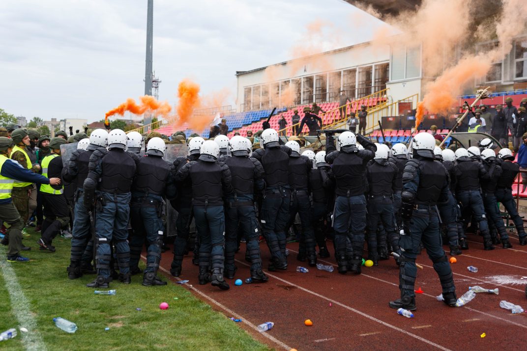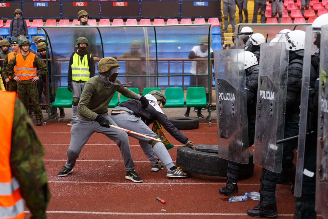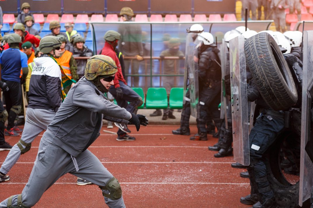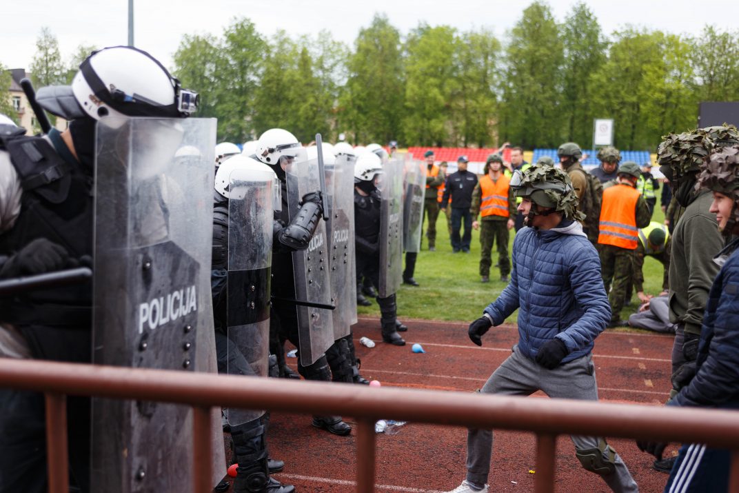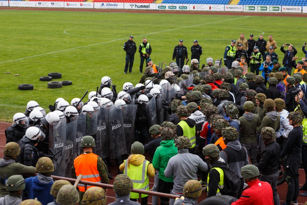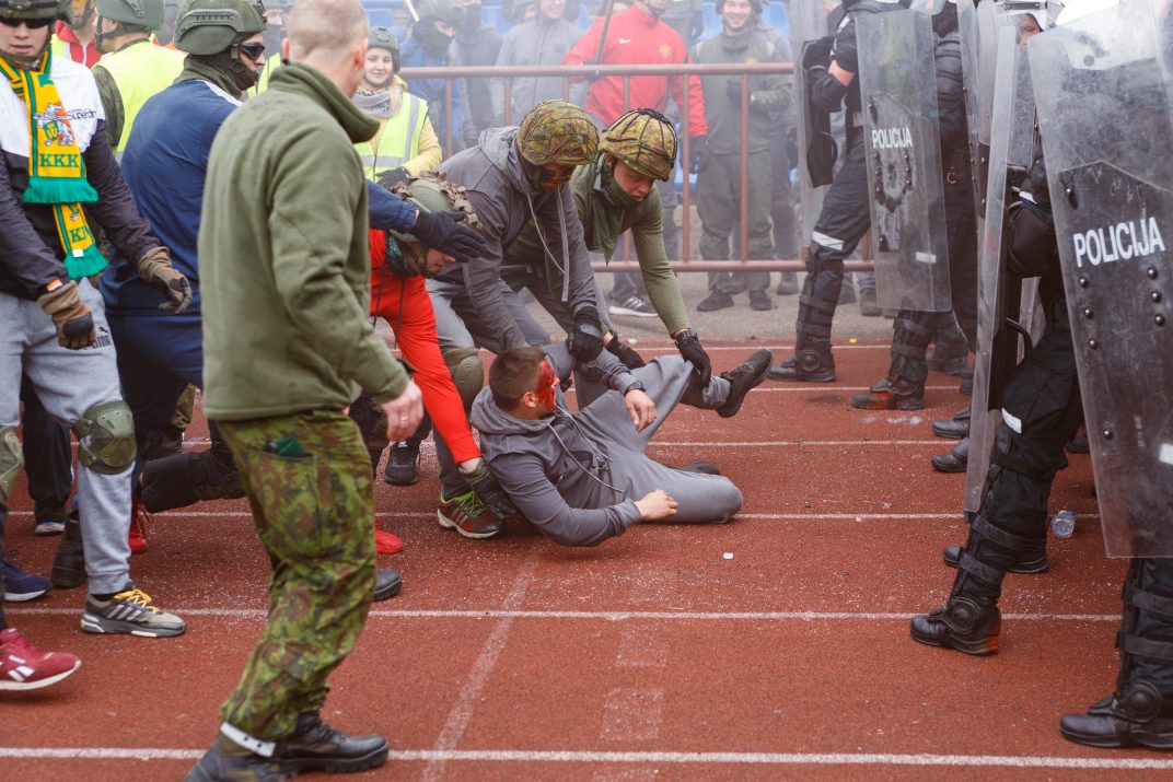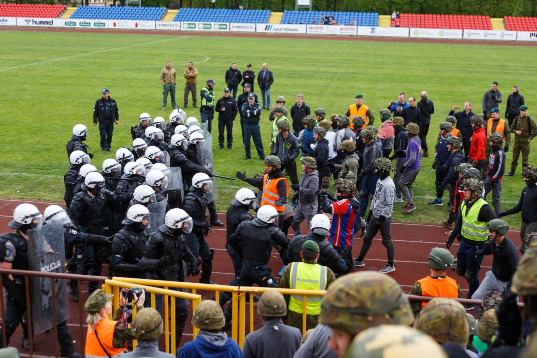 Penktadienio rytą sustiprintos policijos pareigūnų ir kitų tarnybų pajėgos skubėjo į „Aukštaitijos“ stadione prasidėjusias futbolo sirgalių riaušes. Čia mokymuose, inscenizuodami galimą situaciją, susirėmė Karaliaus Mindaugo husarų bataliono kariai ir Panevėžio apskrities VPK pareigūnai.