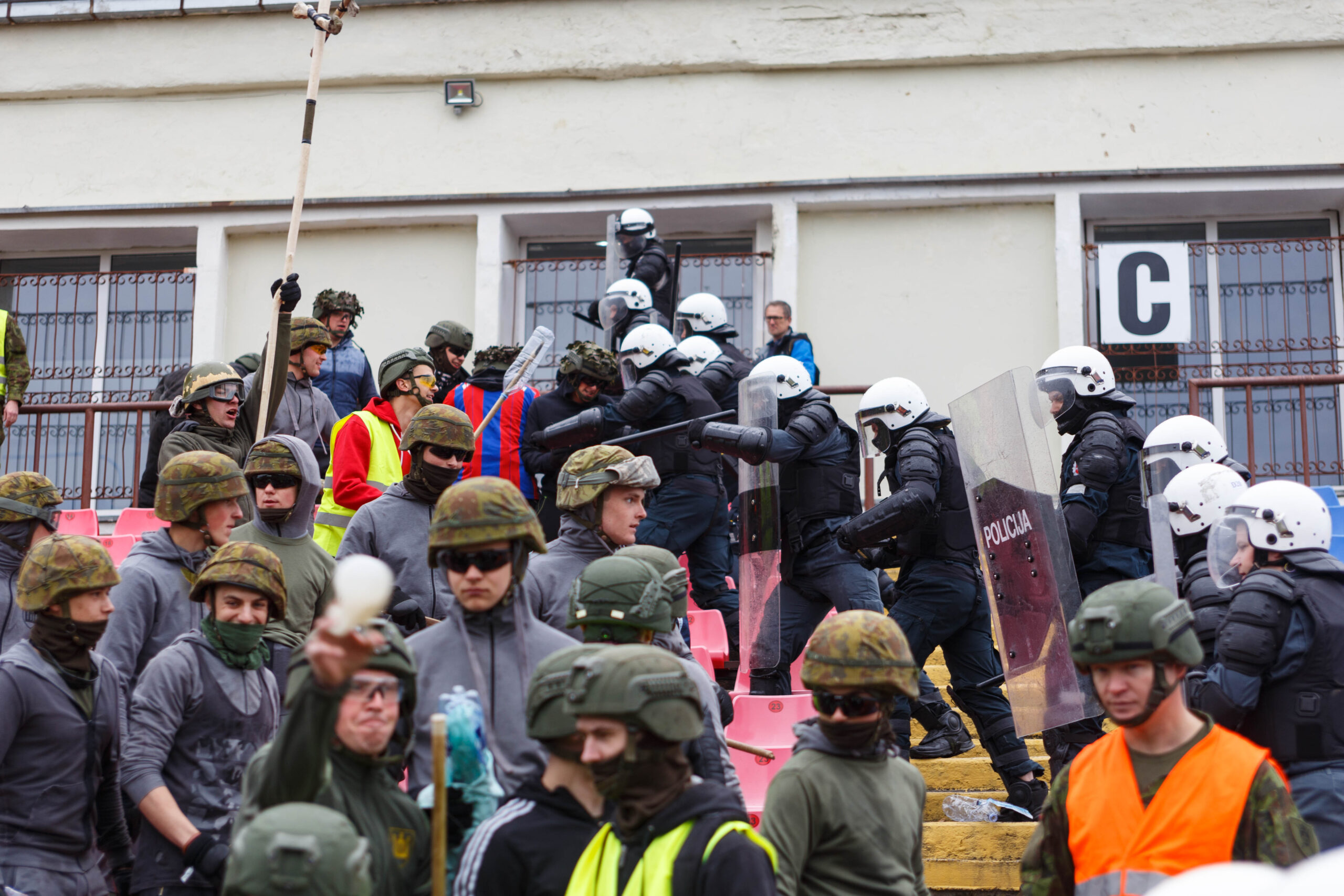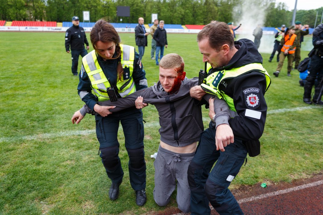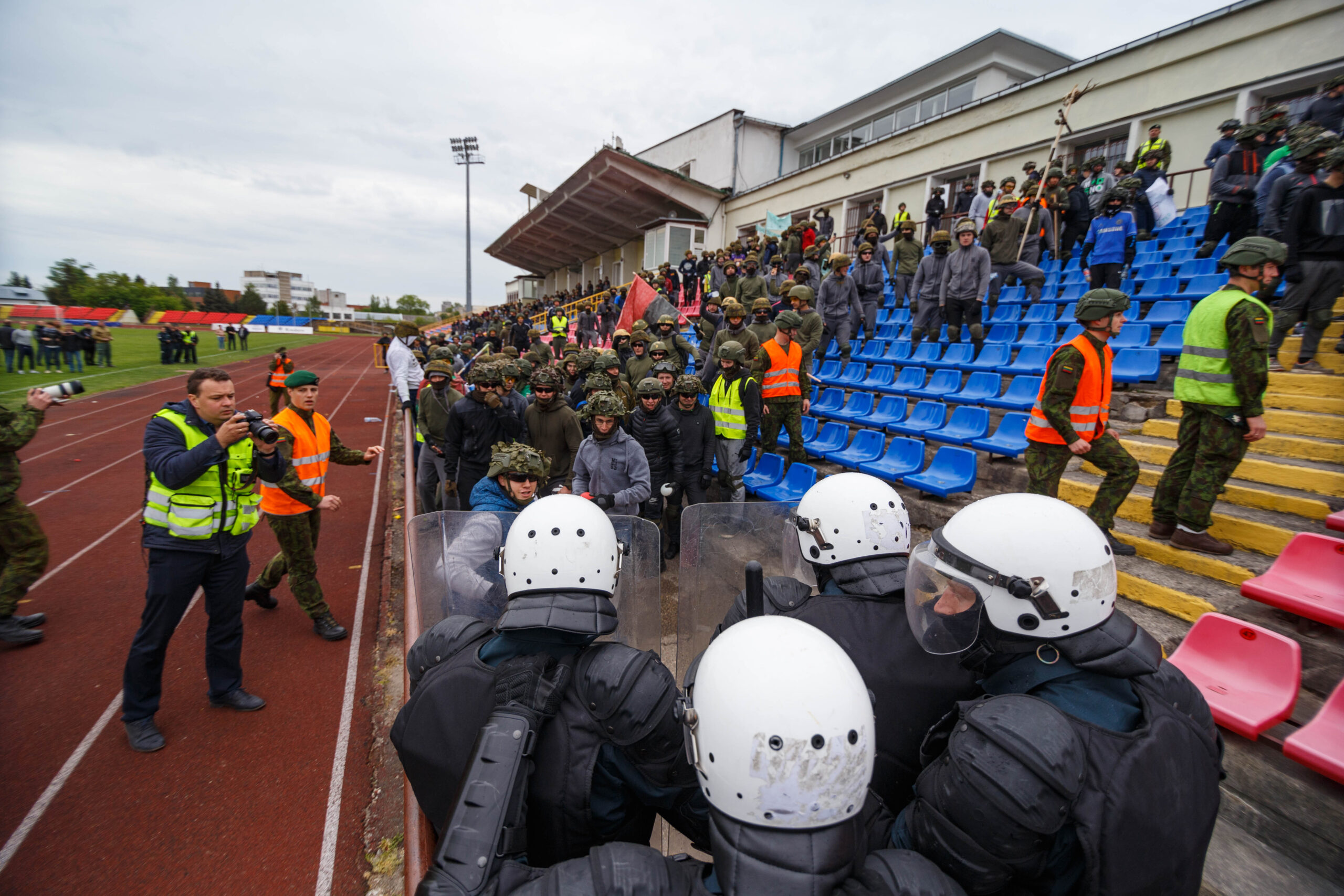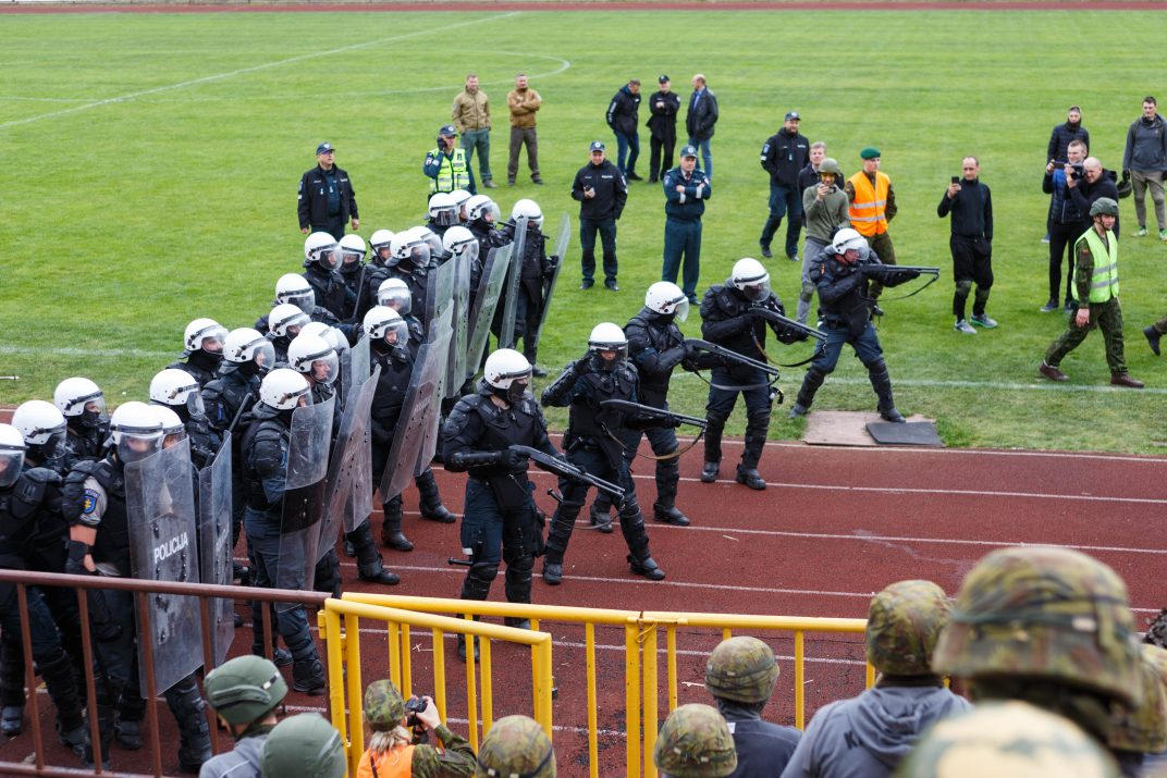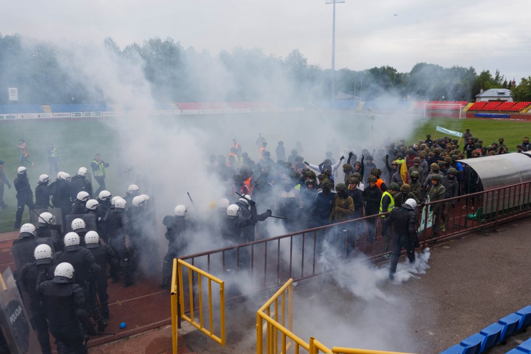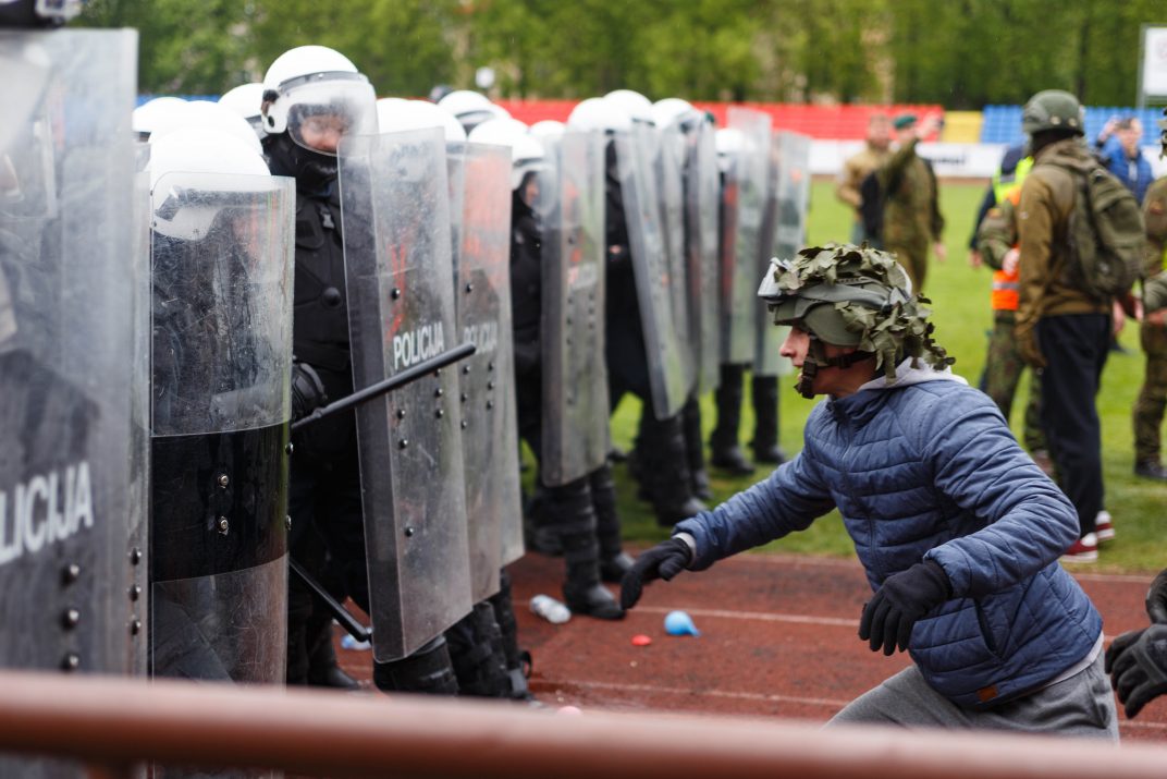 Penktadienio rytą sustiprintos policijos pareigūnų ir kitų tarnybų pajėgos skubėjo į „Aukštaitijos“ stadione prasidėjusias futbolo sirgalių riaušes. Čia mokymuose, inscenizuodami galimą situaciją, susirėmė Karaliaus Mindaugo husarų bataliono kariai ir Panevėžio apskrities VPK pareigūnai.