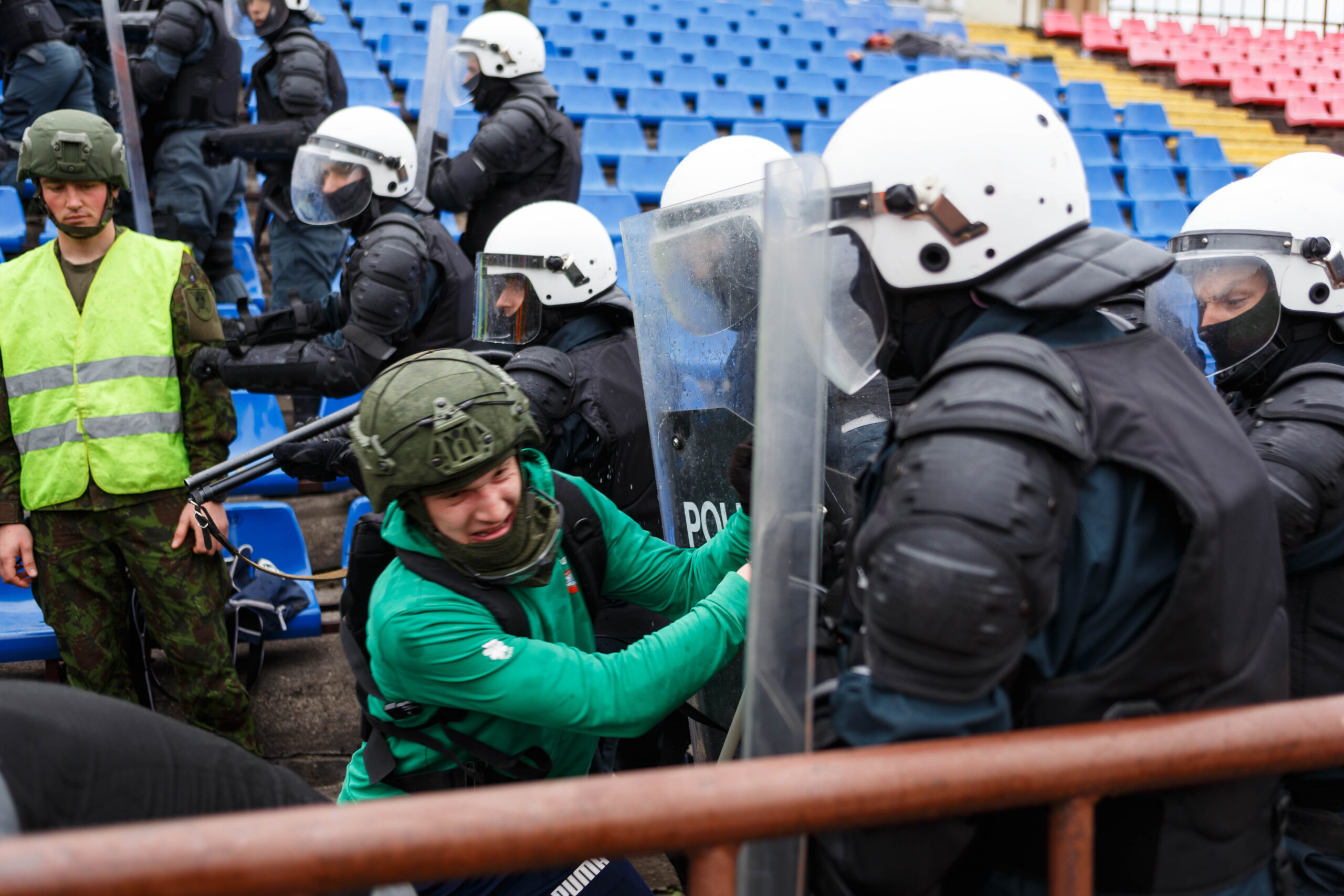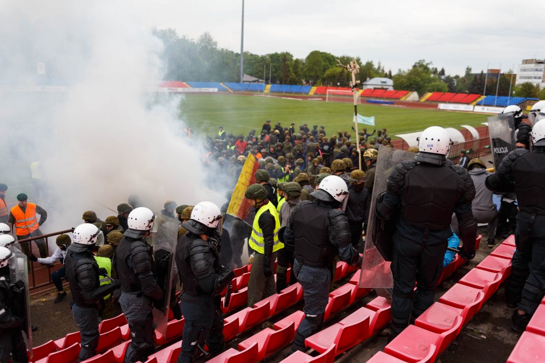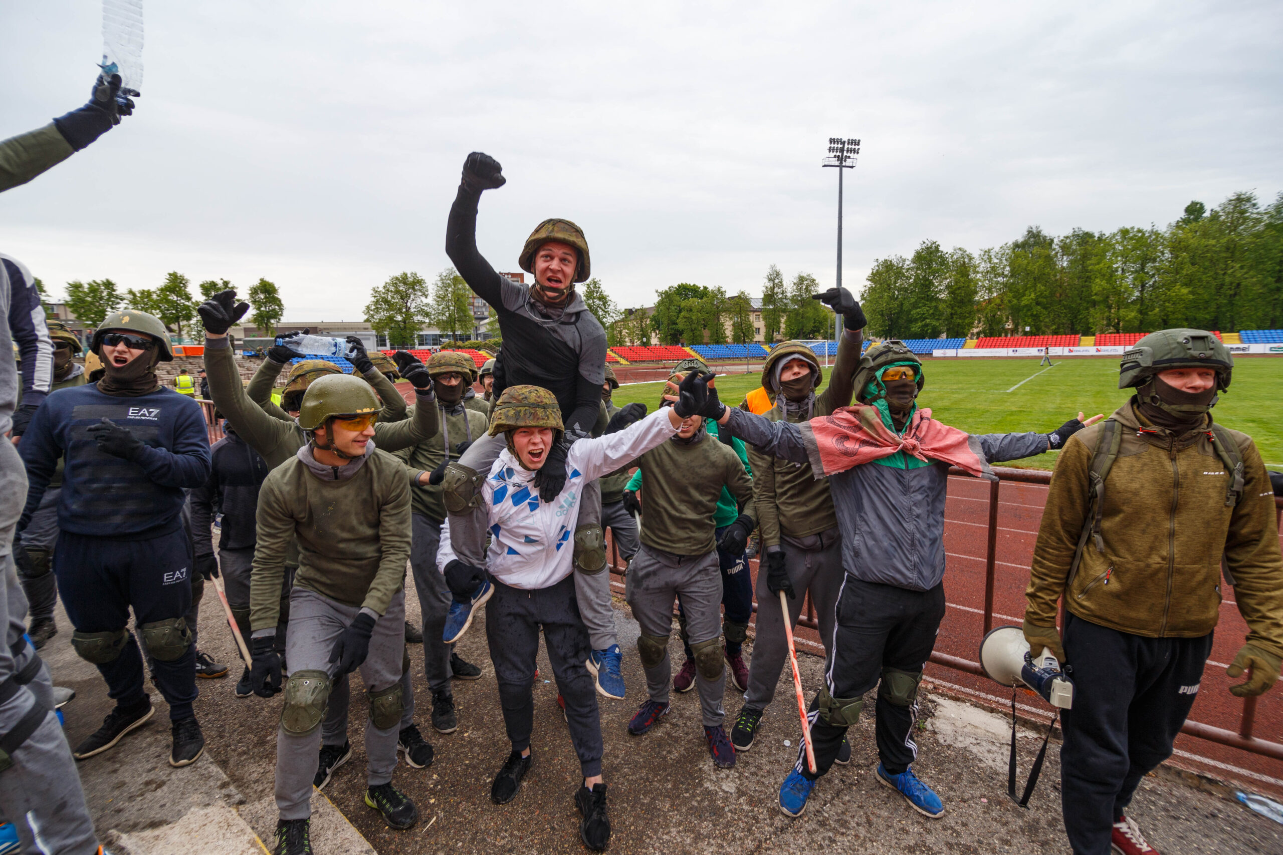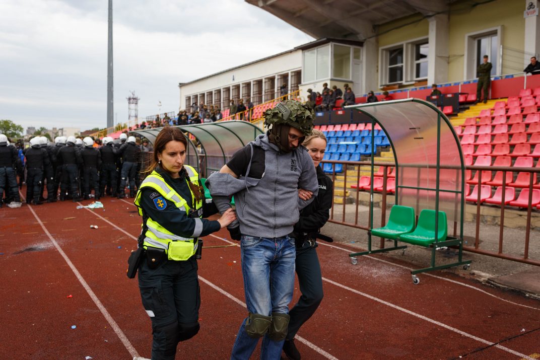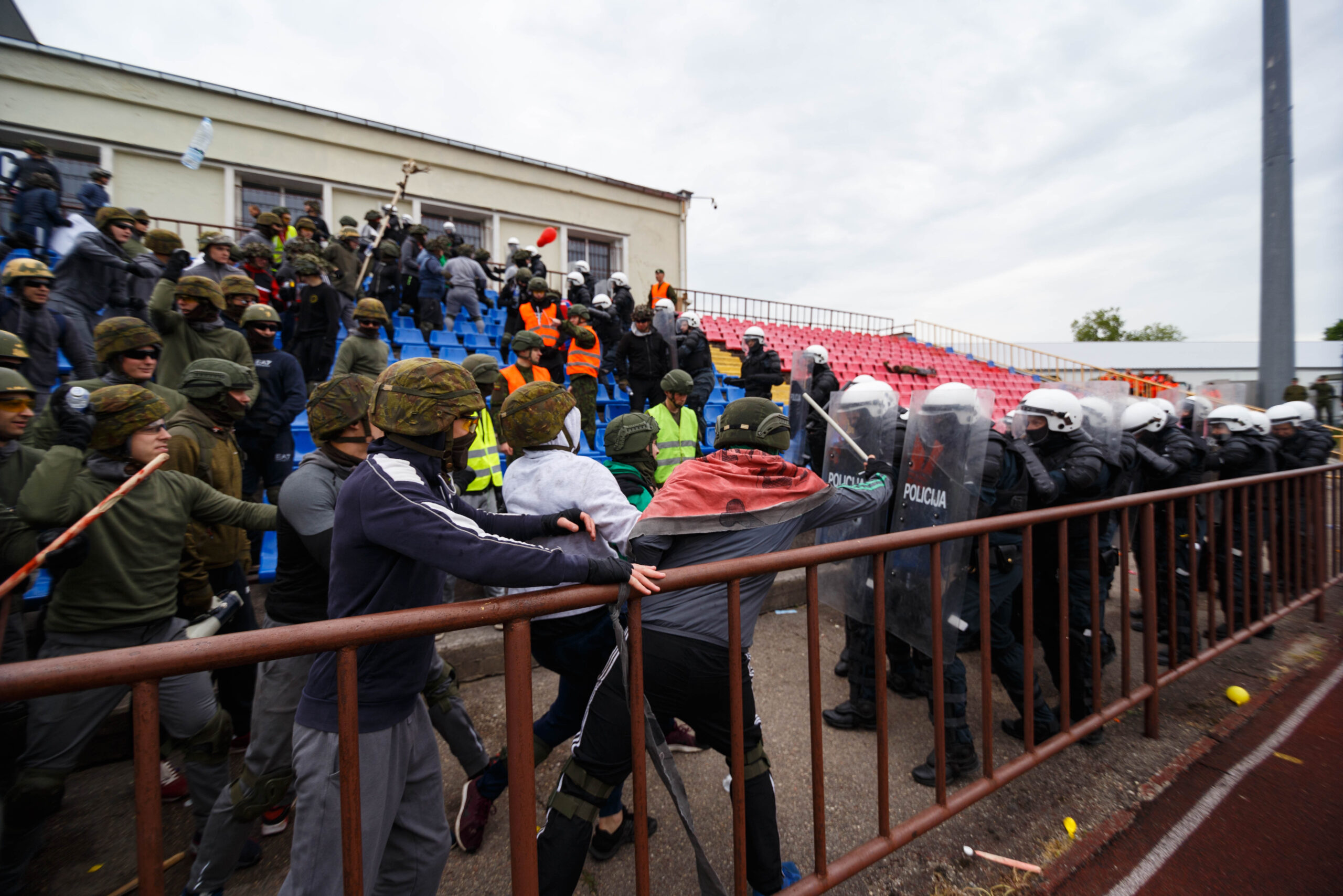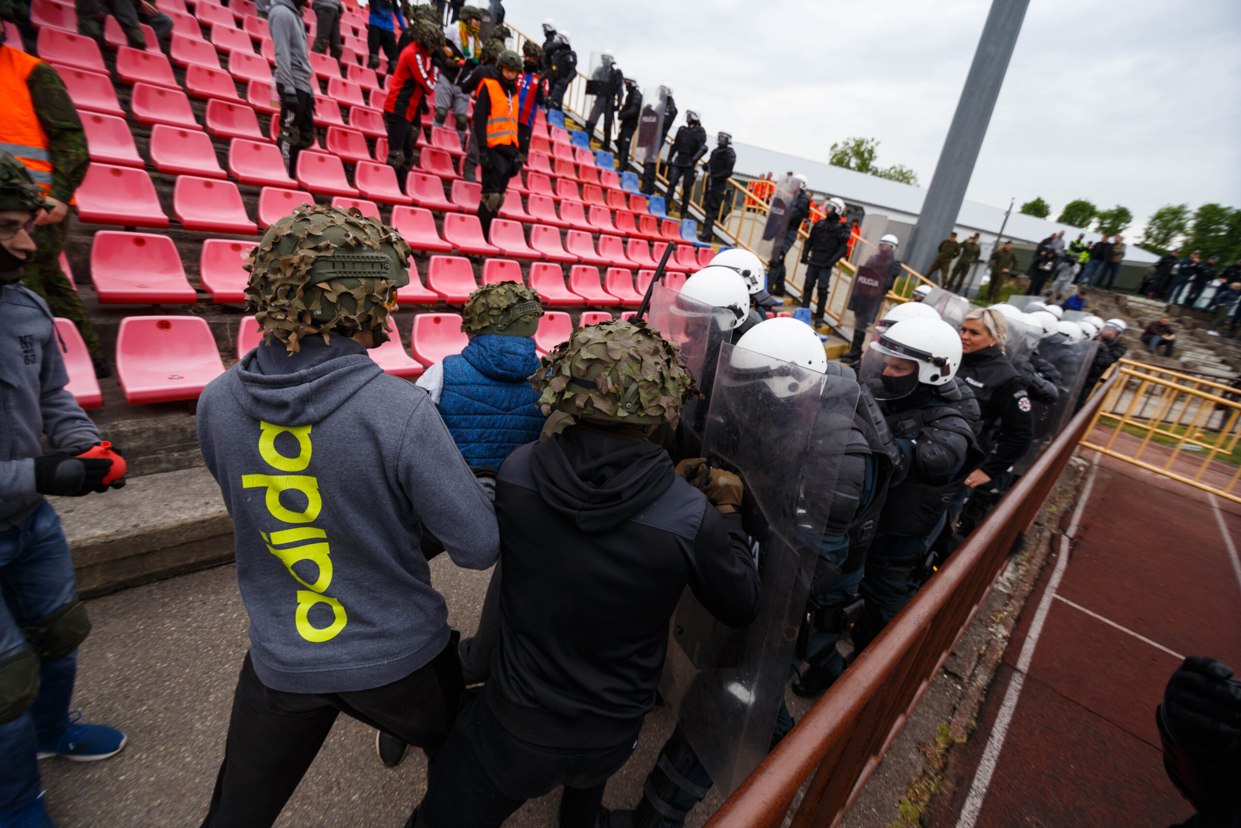Penktadienio rytą sustiprintos policijos pareigūnų ir kitų tarnybų pajėgos skubėjo į „Aukštaitijos“ stadione prasidėjusias futbolo sirgalių riaušes. Čia mokymuose, inscenizuodami galimą situaciją, susirėmė Karaliaus Mindaugo husarų bataliono kariai ir Panevėžio apskrities VPK pareigūnai.