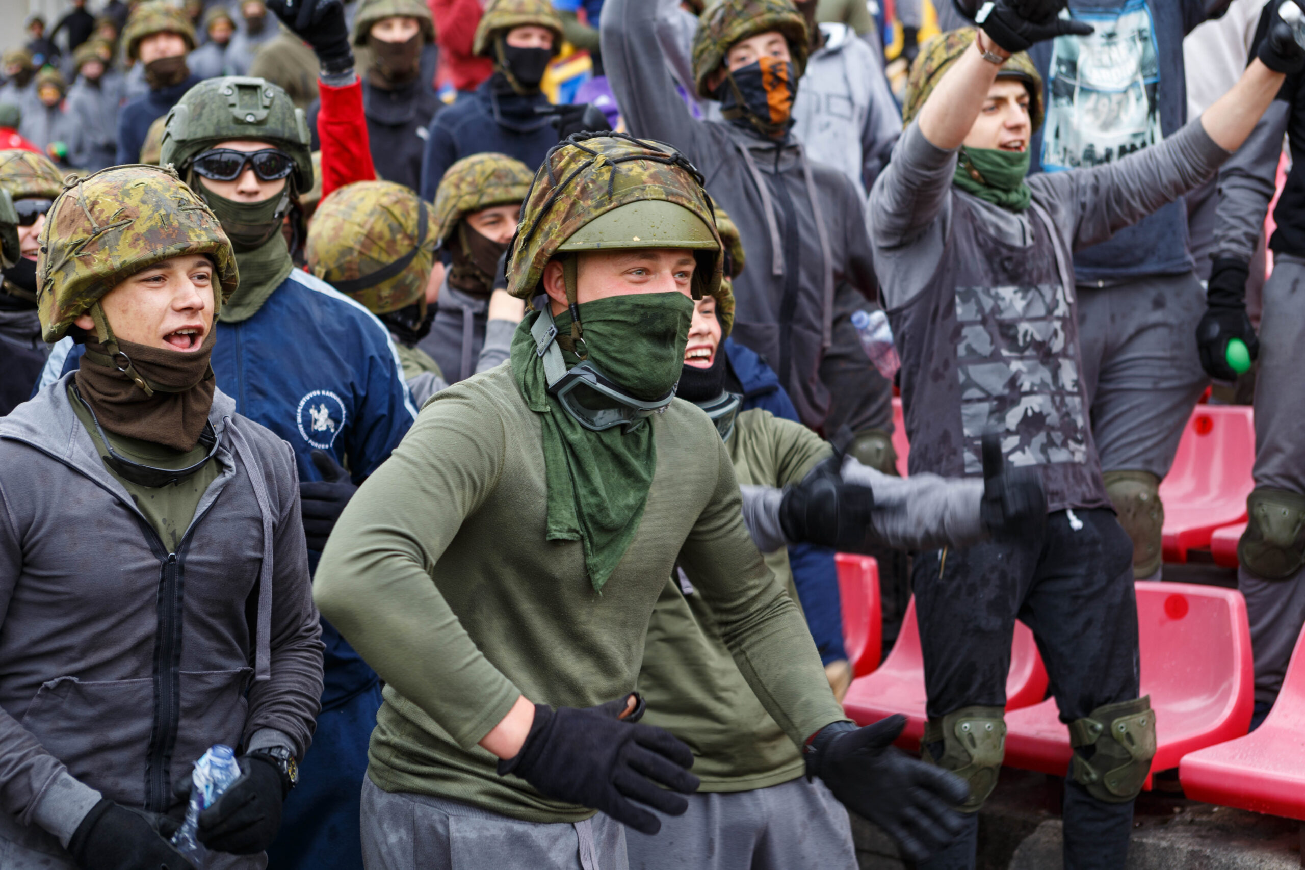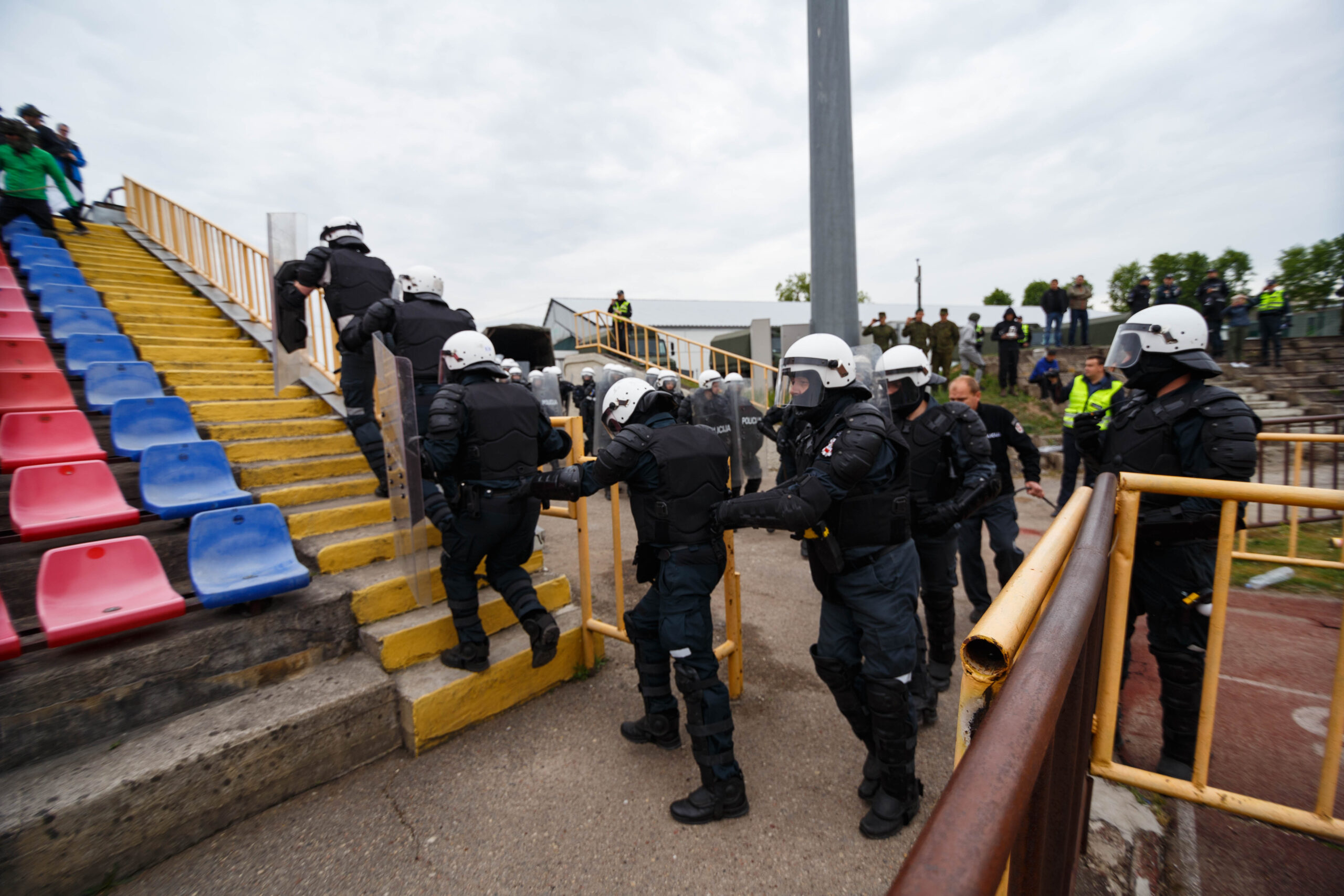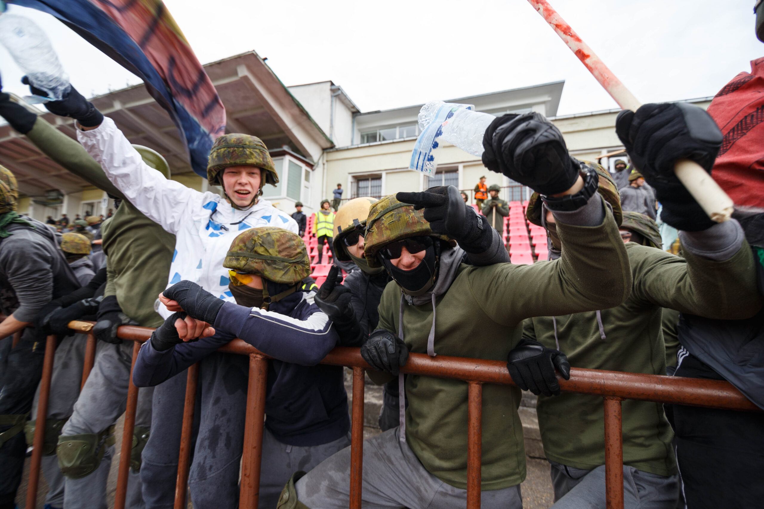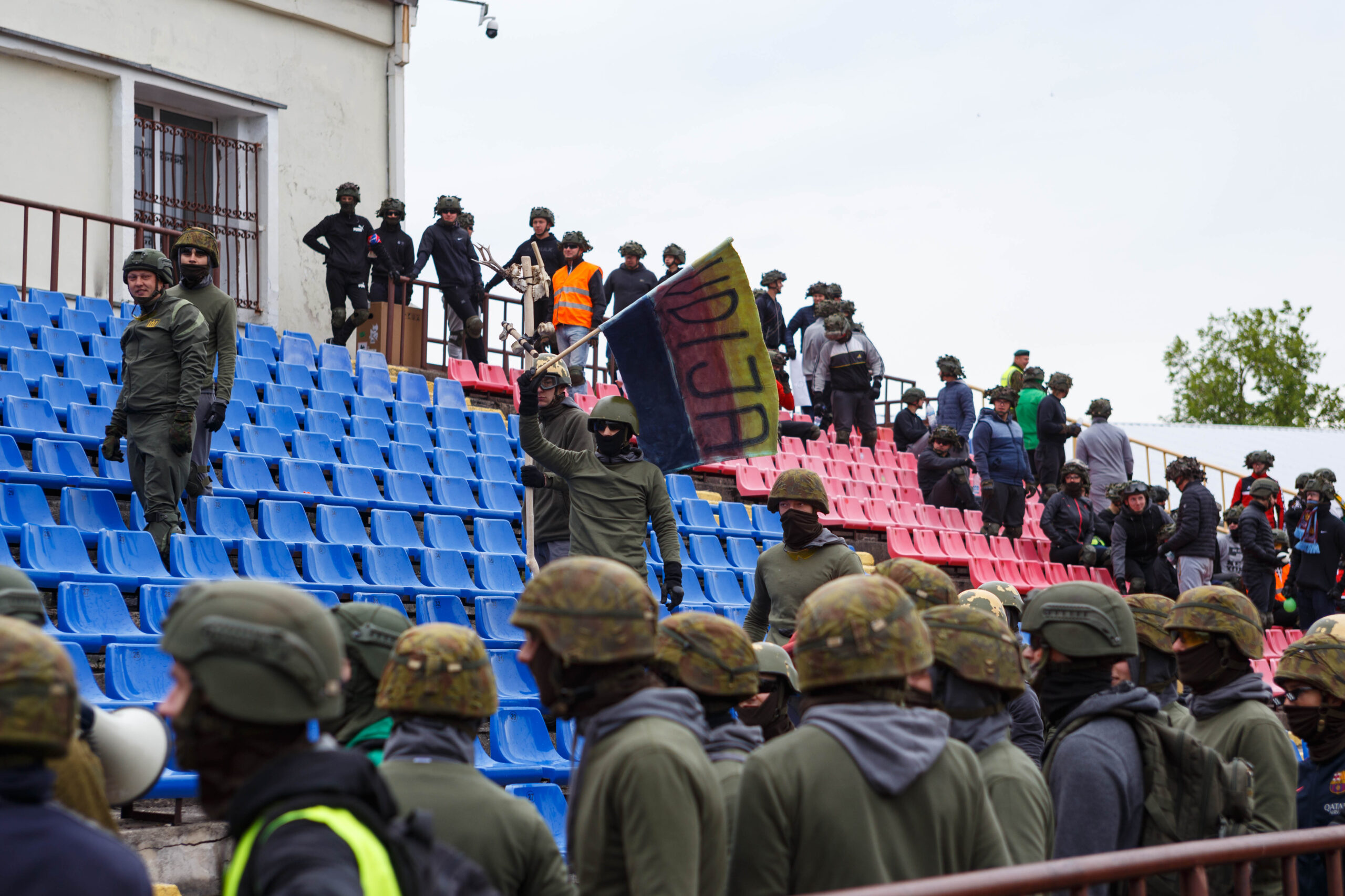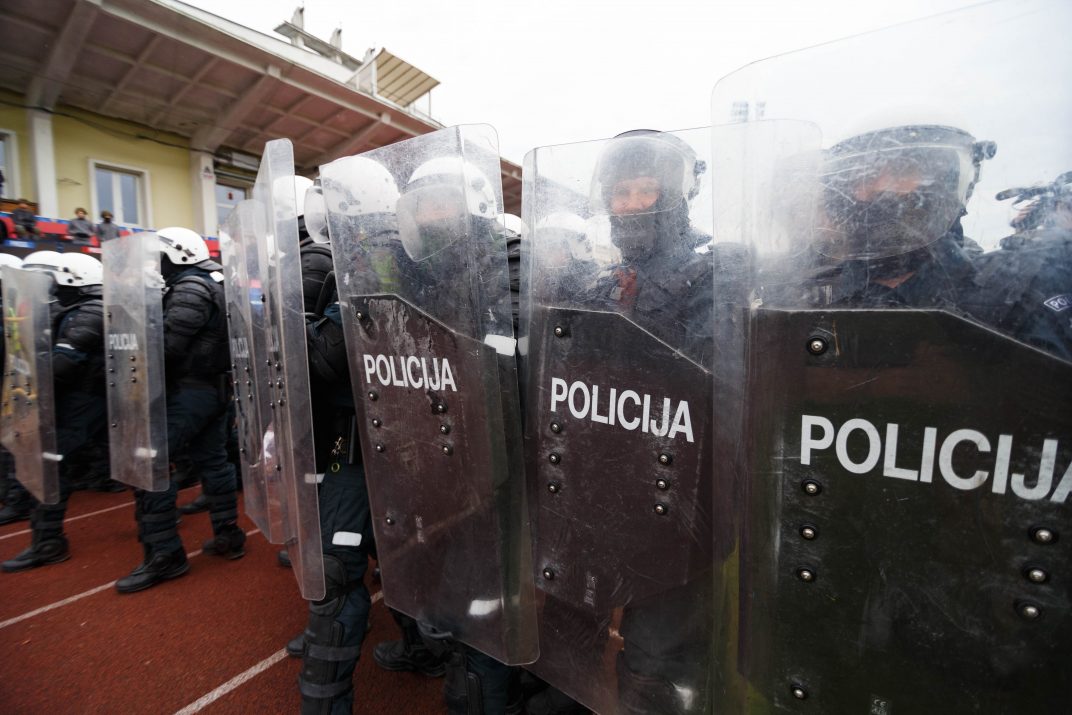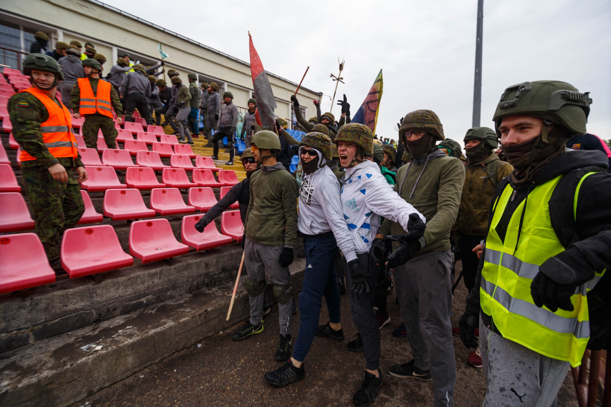 Penktadienio rytą sustiprintos policijos pareigūnų ir kitų tarnybų pajėgos skubėjo į „Aukštaitijos“ stadione prasidėjusias futbolo sirgalių riaušes. Čia mokymuose, inscenizuodami galimą situaciją, susirėmė Karaliaus Mindaugo husarų bataliono kariai ir Panevėžio apskrities VPK pareigūnai.