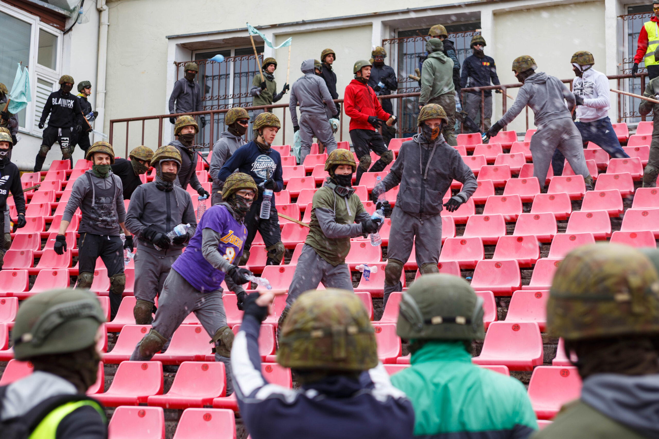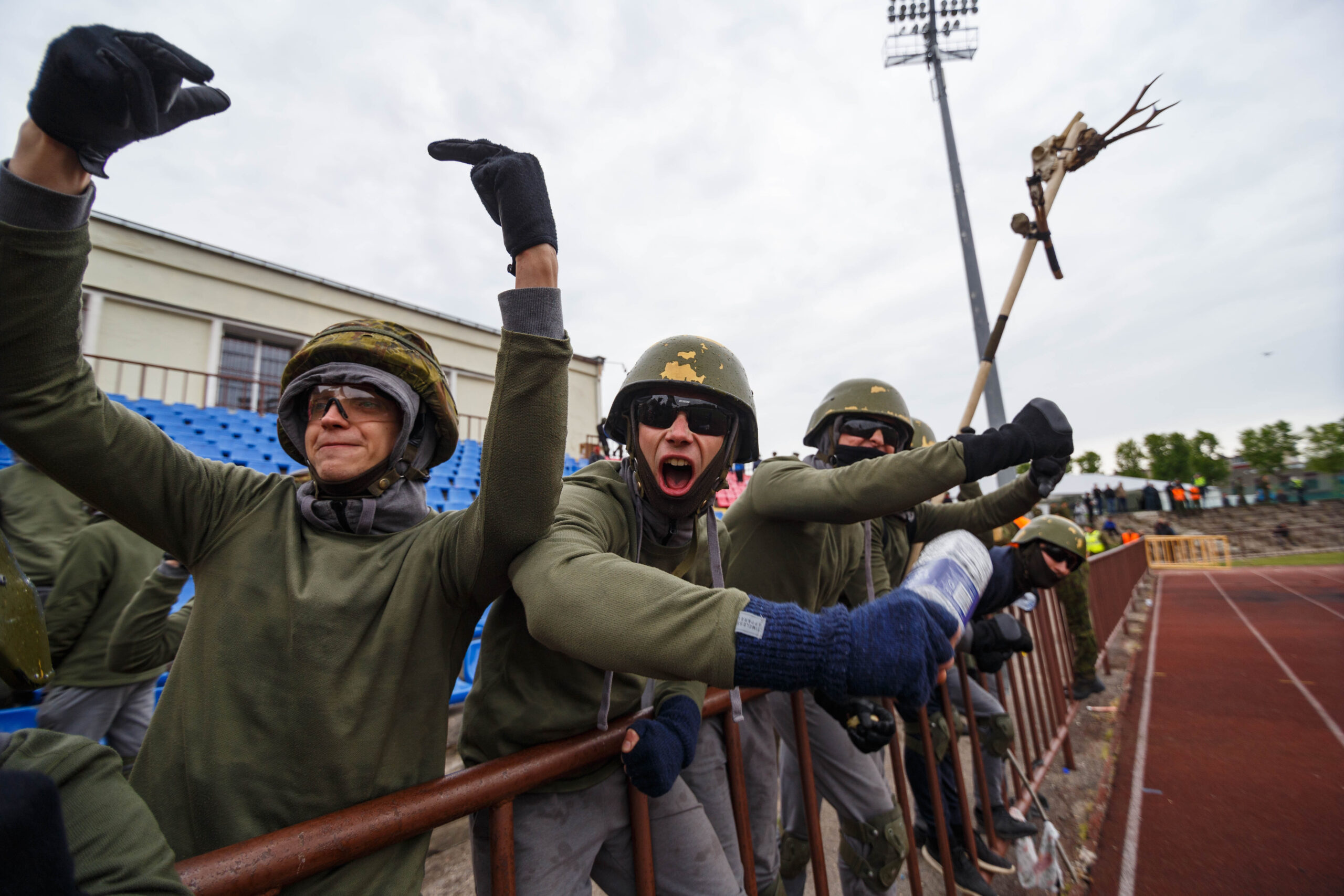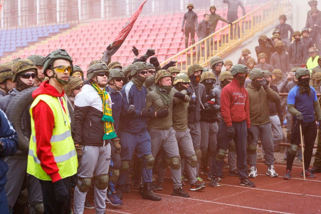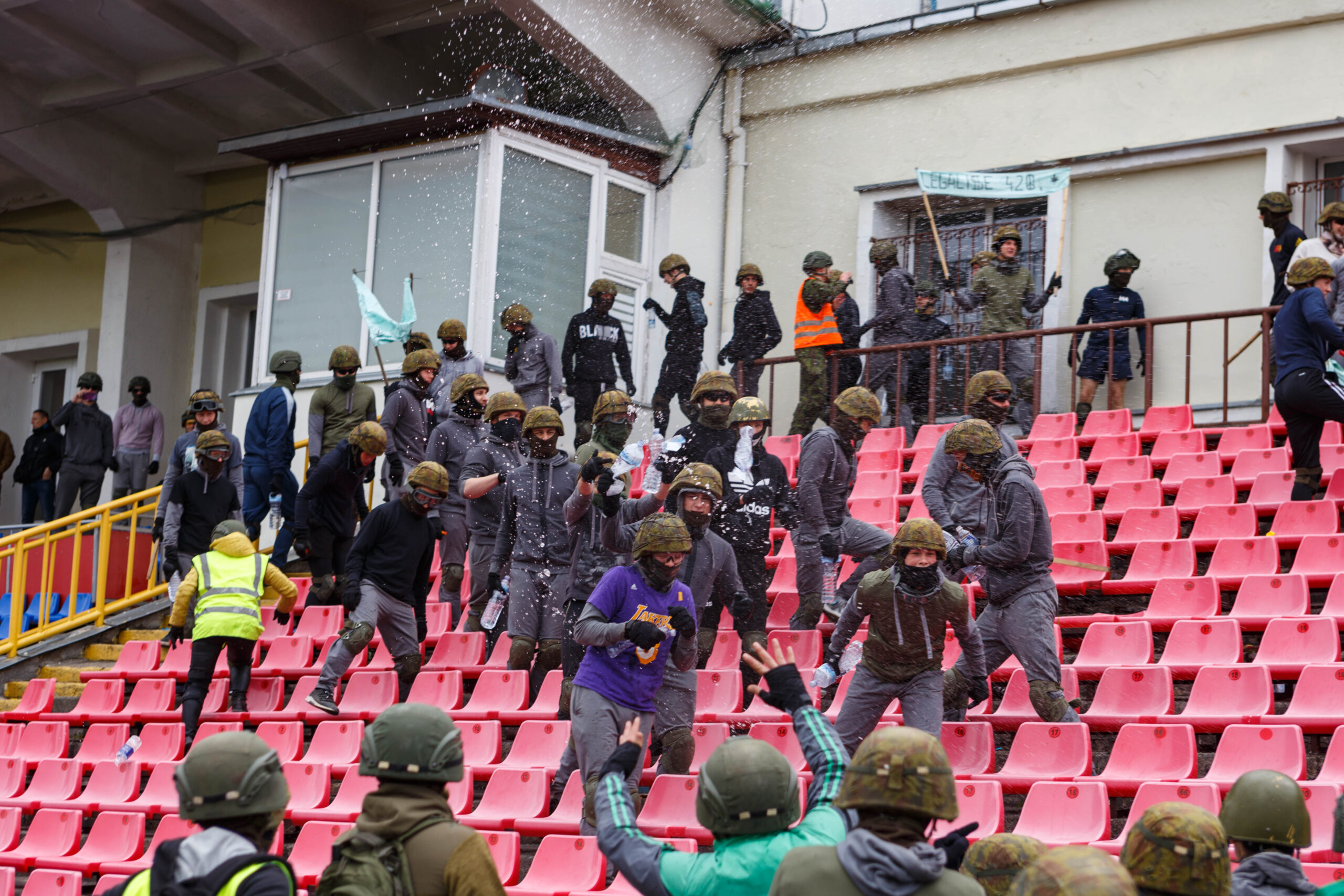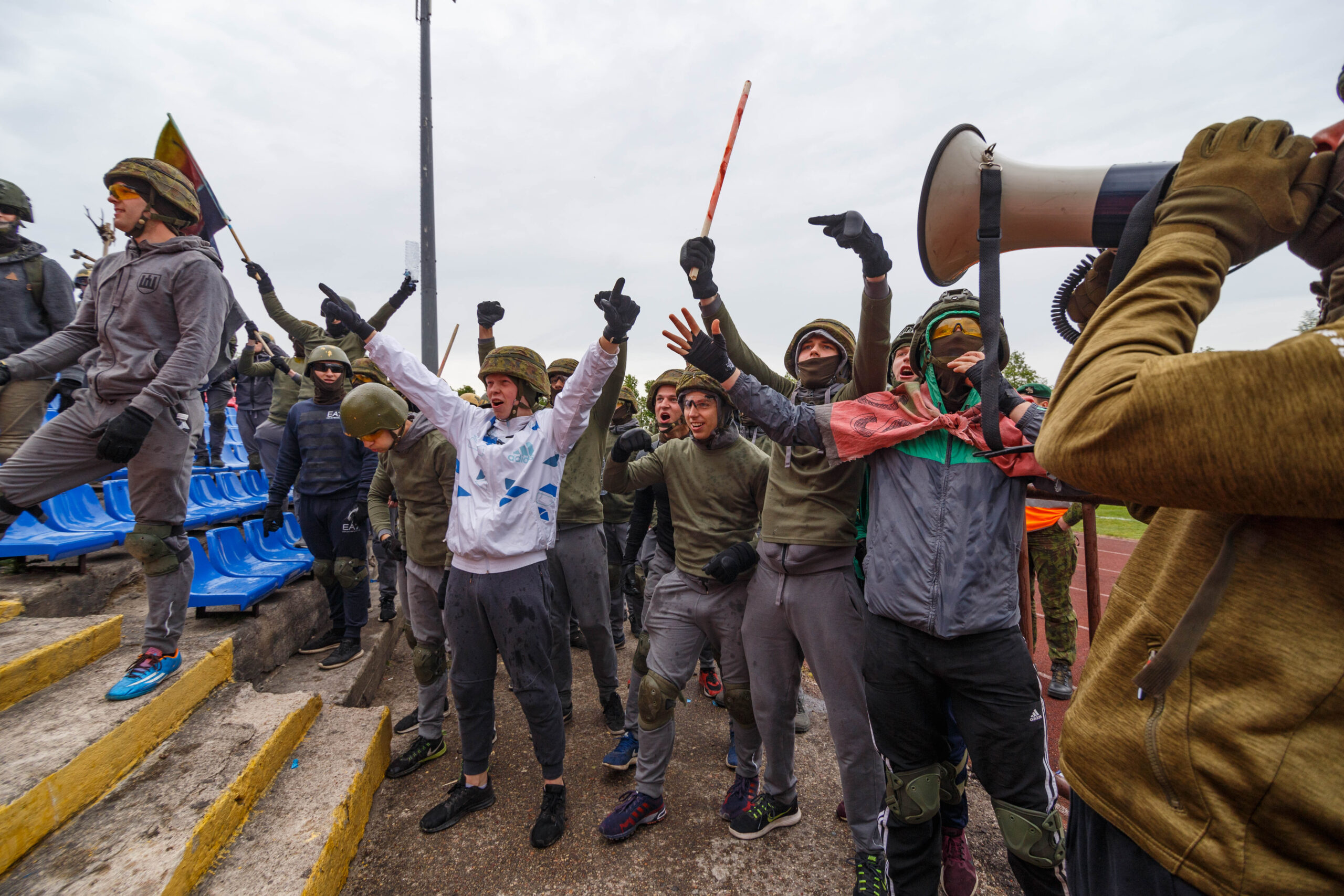 Penktadienio rytą sustiprintos policijos pareigūnų ir kitų tarnybų pajėgos skubėjo į „Aukštaitijos“ stadione prasidėjusias futbolo sirgalių riaušes. Čia mokymuose, inscenizuodami galimą situaciją, susirėmė Karaliaus Mindaugo husarų bataliono kariai ir Panevėžio apskrities VPK pareigūnai.