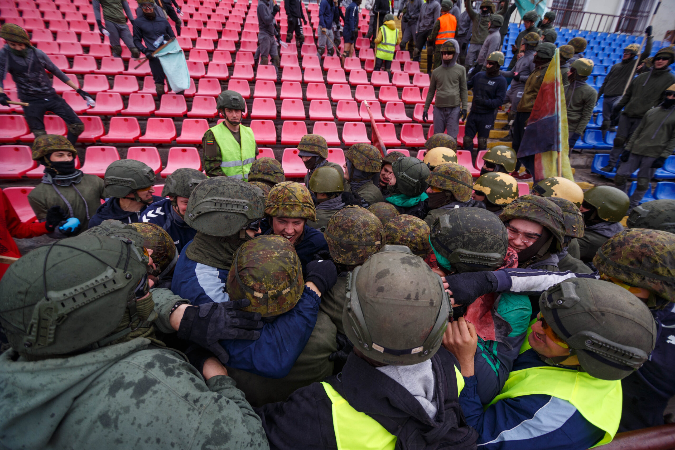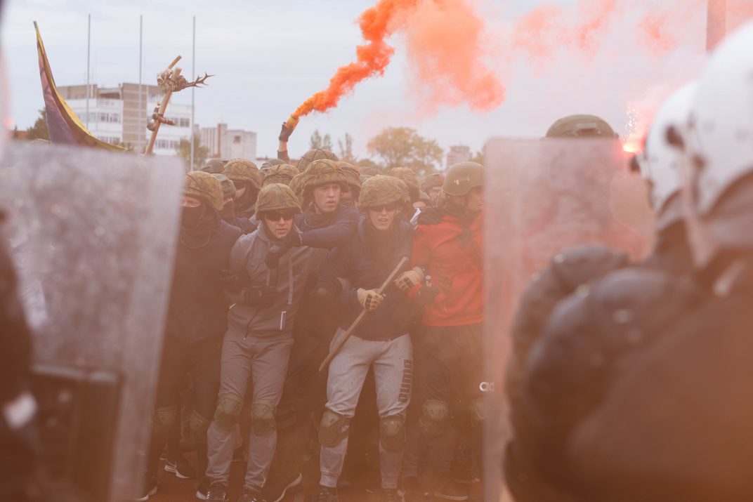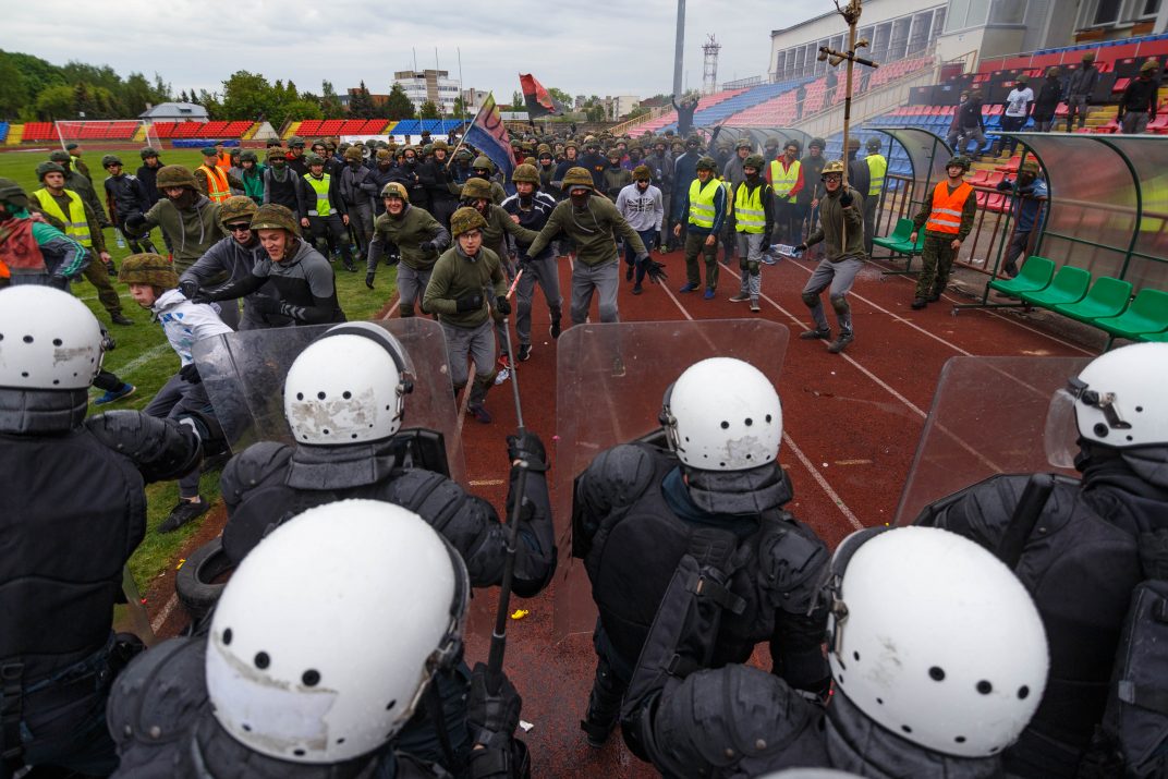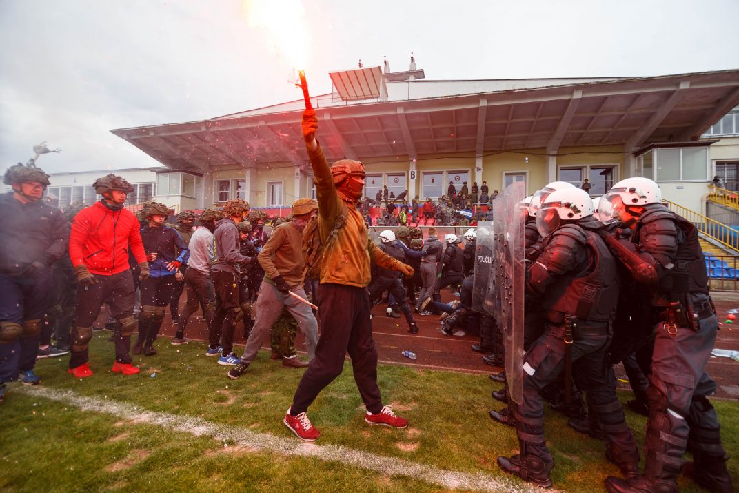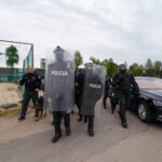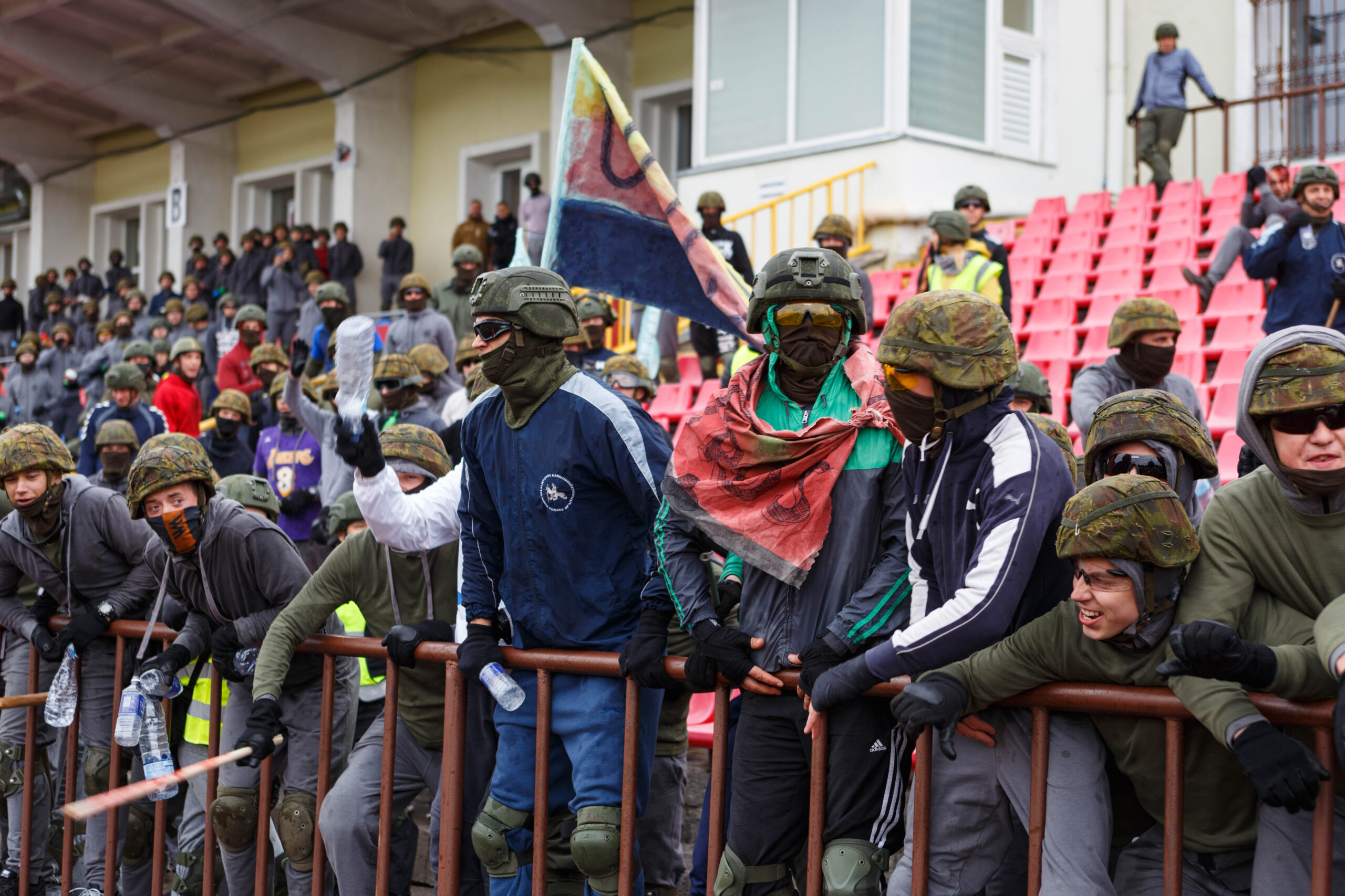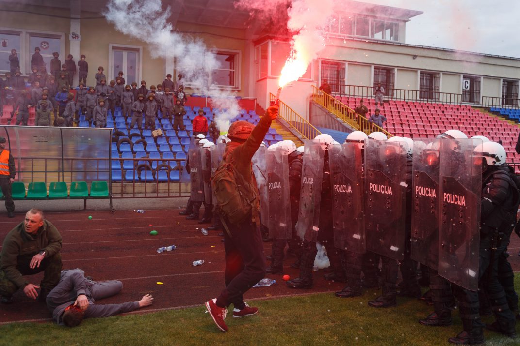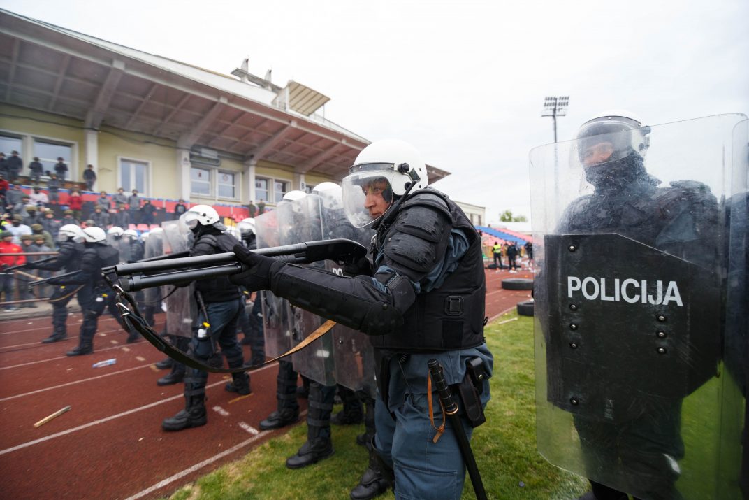 Penktadienio rytą sustiprintos policijos pareigūnų ir kitų tarnybų pajėgos skubėjo į „Aukštaitijos“ stadione prasidėjusias futbolo sirgalių riaušes. Čia mokymuose, inscenizuodami galimą situaciją, susirėmė Karaliaus Mindaugo husarų bataliono kariai ir Panevėžio apskrities VPK pareigūnai.