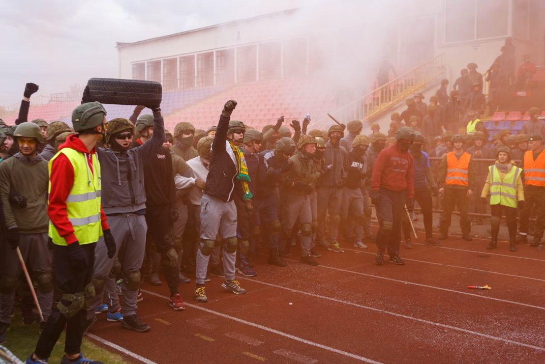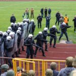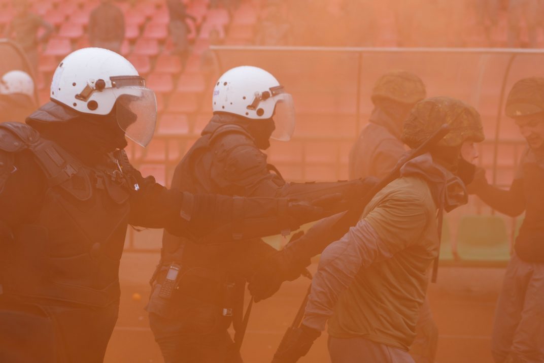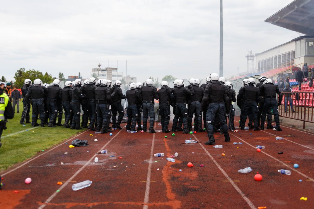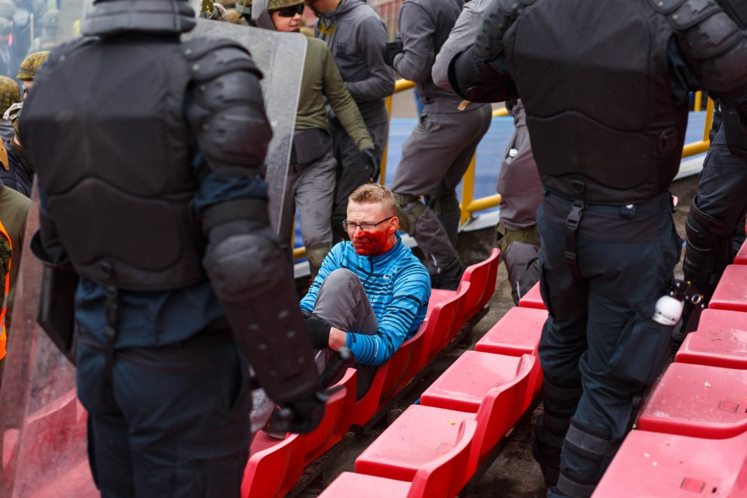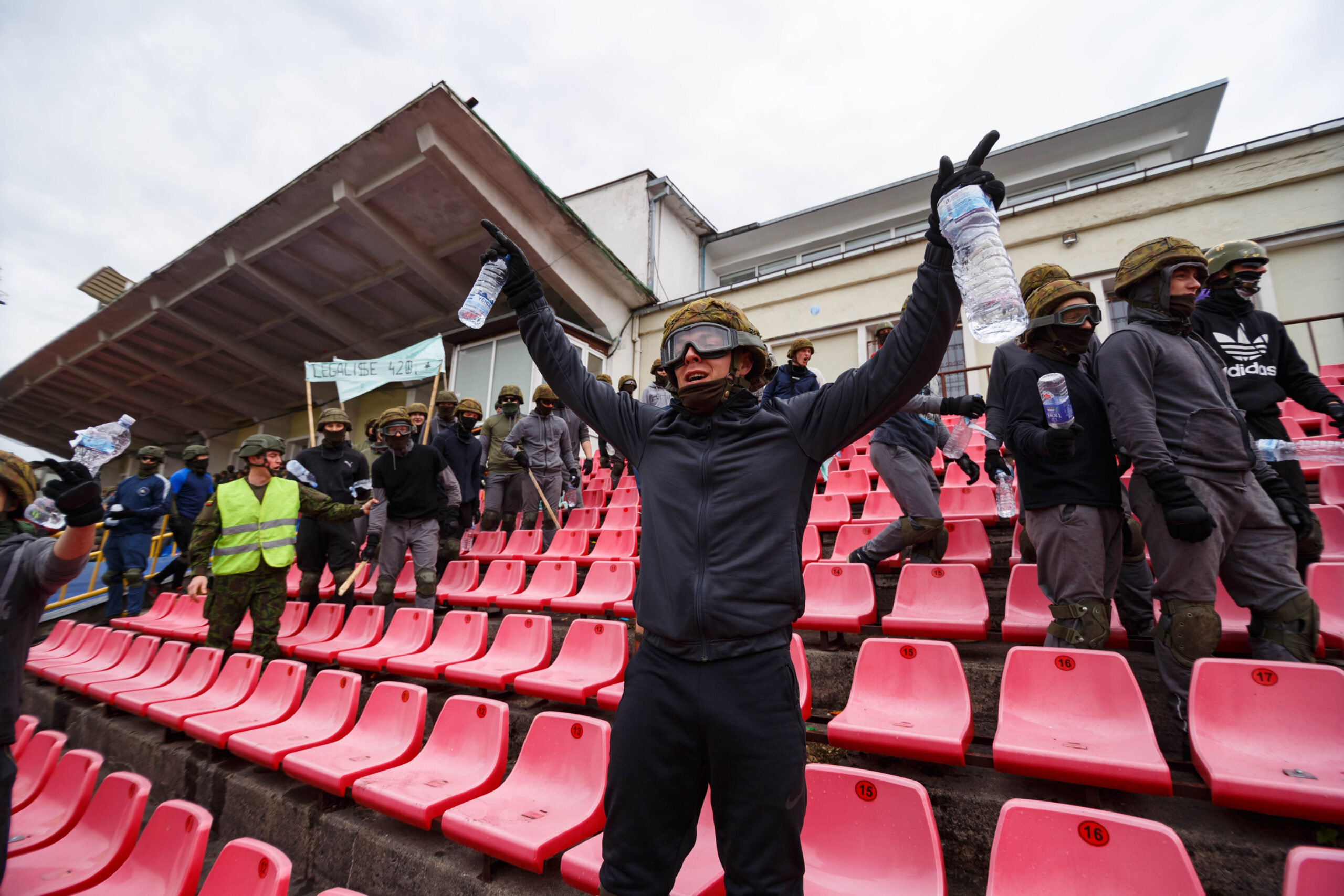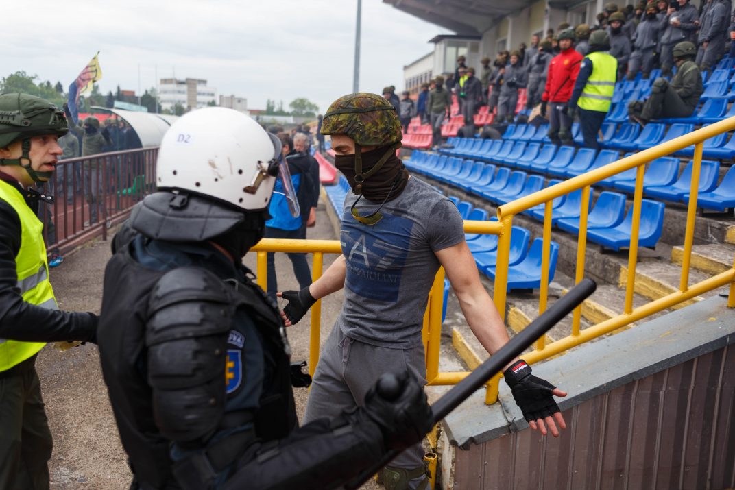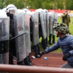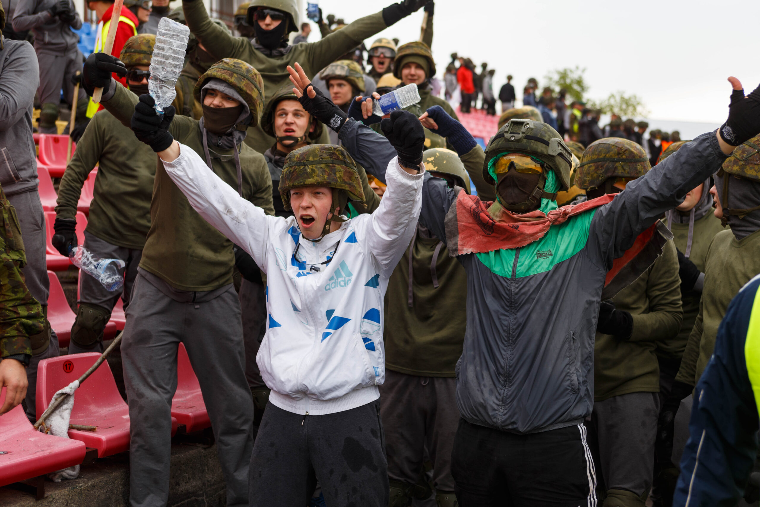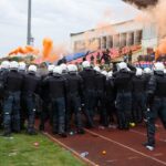 Penktadienio rytą sustiprintos policijos pareigūnų ir kitų tarnybų pajėgos skubėjo į „Aukštaitijos“ stadione prasidėjusias futbolo sirgalių riaušes. Čia mokymuose, inscenizuodami galimą situaciją, susirėmė Karaliaus Mindaugo husarų bataliono kariai ir Panevėžio apskrities VPK pareigūnai.