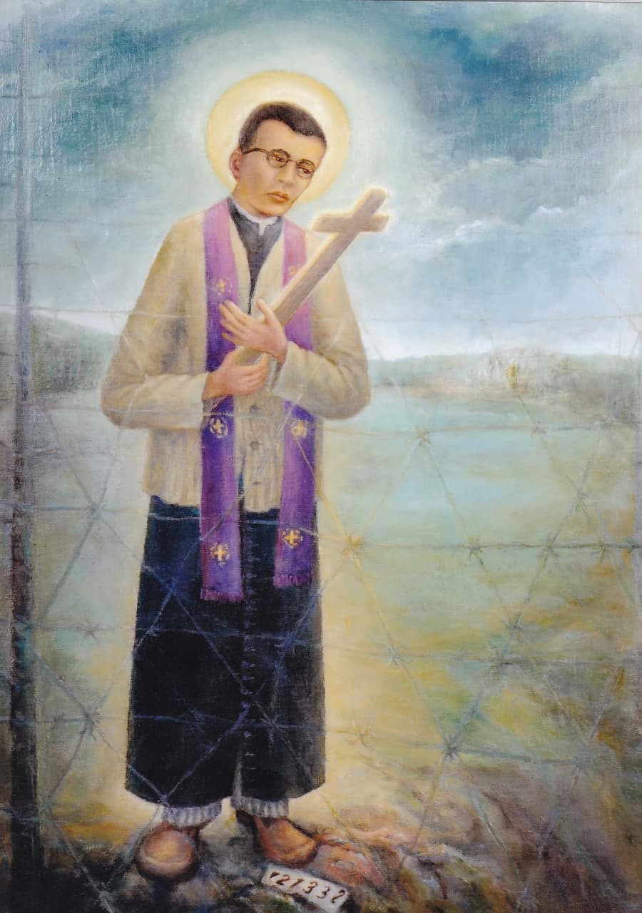 Štuthofo aplinką paliudija ir įspūdį sustiprina spygliuotos vielos ir kalinio numeris – 21332. Nutapytasis vaizduojamas su violetine stula, sutana, matyti ir kalinio drabužio fragmentas, rankose laiko kryžių – kančios, bet kartu ir vilties, pasitikėjimo Dievu ženklą. Pati paveikslo autorė yra sakiusi, kad ją sujaudinusi koncentracijos stovyklos aplinka, kunigo pastangos nužmogėjusioje, nužmogintoje aplinkoje likti žmogumi, patarnauti tikintiesiems kaip dvasininkui iki paskutinio atodūsio. Paveikslu norėta ne tik įamžinti kančią, bet ir padėkoti už paliktą asmeninį pavyzdį, kaip net ir žvėriškiausiomis sąlygomis galima išsaugoti tikėjimą bei žmogiškumo kibirkštį.