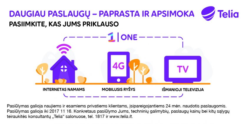 Gana vargti. Nuo šiol, visas šias paslaugas užsisakę iš „Telia“, galėsite mėgautis visais „iš vienų rankų“ privalumais kartu su specialiu pasiūlymu „Telia One“. Jūs sutaupysite laiko ir dar gausite greičio, daugiau duomenų ir dar daugiau mėgstamų televizijos kanalų.