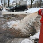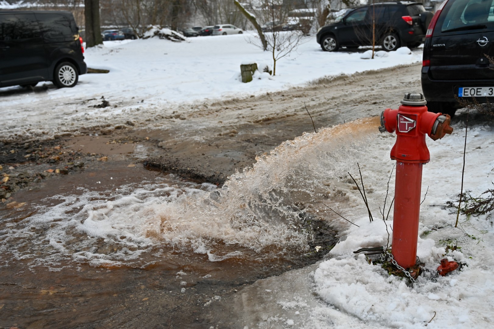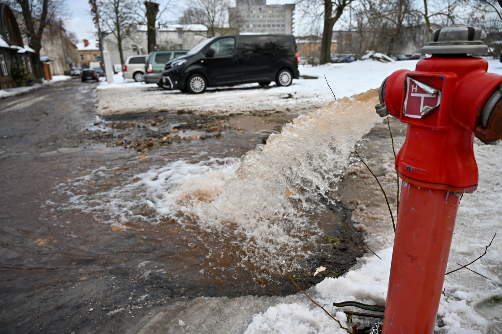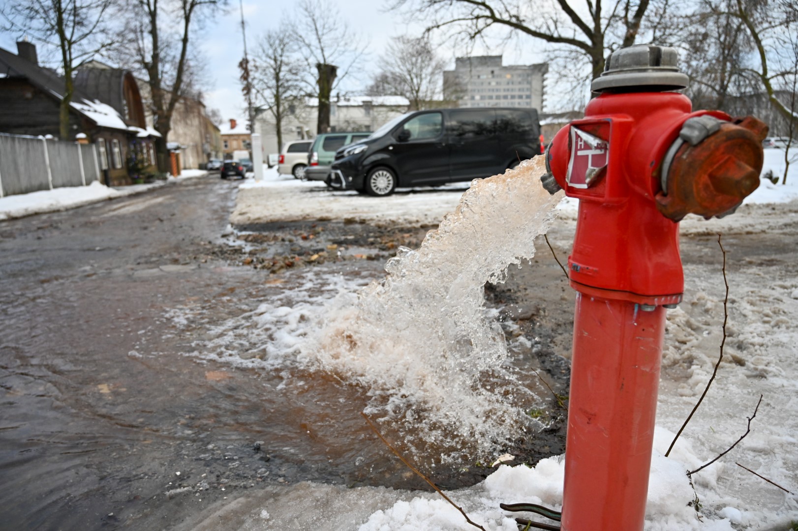 Tačiau remonto metu įvyko avarija – hidrantą „išmušė“. Kol įmonės darbuotojai uždarė vandentiekio liniją, ant kurios stovi hidrantas, vanduo kliokte kliokė, tvindydamas gatves.