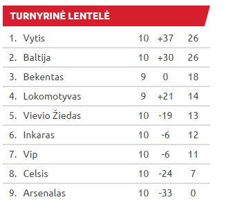 Čempionų titulą ginantis „Baltijos“ klubas turi 26 taškus – tiek pat, kiek pirmoje vietoje esanti „Vyčio“ komanda, bet žengia antri dėl prastesnio įvarčio santykio. „Bekentas“ nuo lyderių atsilieka jau aštuoniais taškais, o iki čempionato galo liko septyni turai.