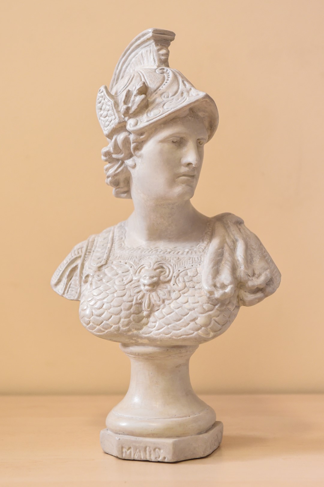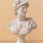 Dar vienas Vilniaus restauratorių naujam gyvenimui prikeltas Panevėžio muziejaus eksponatas taip pat XIX a. siekiantis gipsinis antikinio kario biustas – karys su šalmu ir prabangiais šarvais. Pasak J. Gaidelienės, biustas rastas 1972 metais Berčiūnuose ariant žemę – maždaug 80 centimetrų gylyje. Prieš restauravimą skulptūros būklė buvusi labai prasta. Tikriausiai netrumpą laiką gulėjęs žemėje biustas buvo dėmėtas, kario galva kažkada nudužusi ir vėl priklijuota, dažai apsilupę, trūko kai kurių fragmentų. Buvo spėjama, kad biustas ne kartą perdažytas šviesios spalvos dažais. Matėsi, kad apatinis dažų sluoksnis šviesesnis nei paviršiniai.