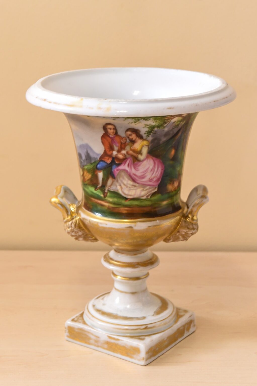 Muziejus ilgą laiką saugojo tik vazos šukes. Ši vertybė buvo sudužusi į devynias dalis: pati vaza skilusi į penkias, o jos postamentas – į 4 šukes. Be to, nebuvo vienos rankenėlės, neišlikęs ir vazos apatinės dalies fragmentas. Pačiose lūžių vietose buvo daug smulkių ištrupėjimų, o vazos paviršius buvo nešvarus, paauksinimas daug kur nusitrynęs. Tokios būklės vaza muziejaus saugyklose išgulėjo beveik šešis dešimtmečius.