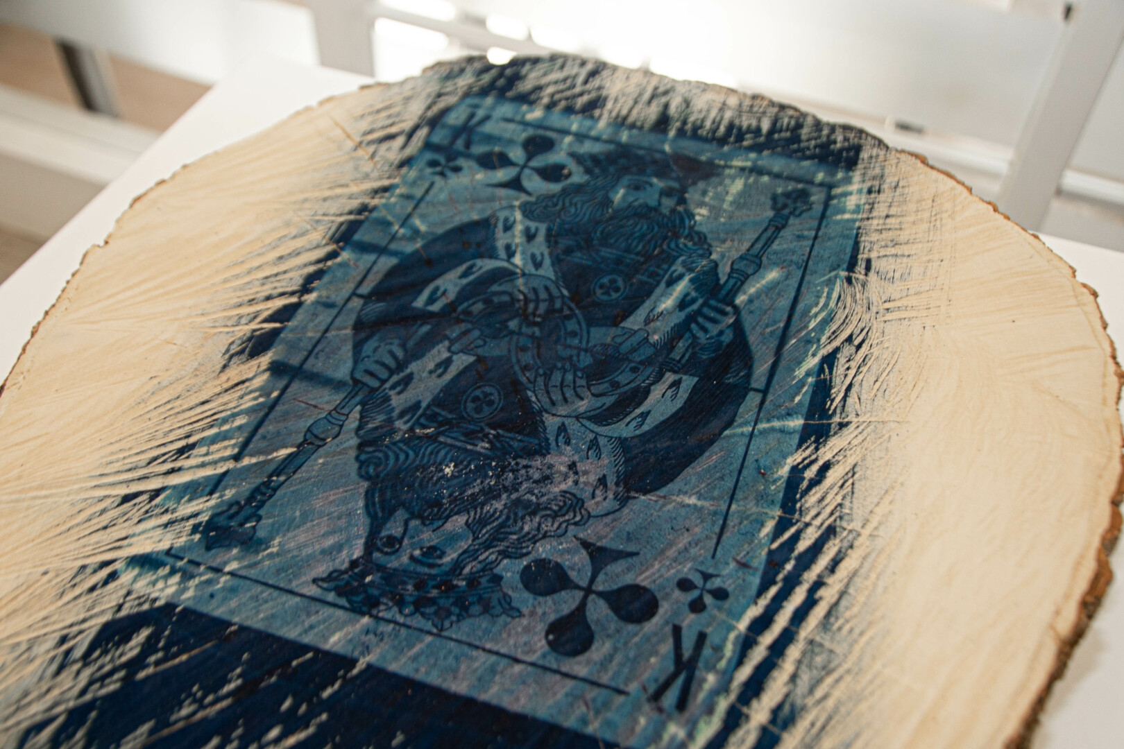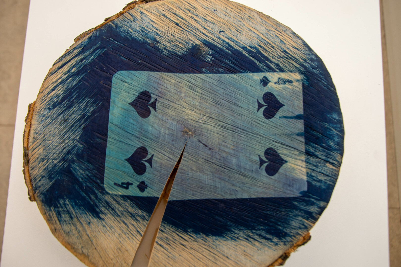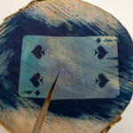 Visgi sudėtingiausia buvo rasti medžiagą, kuri blokuotų medžio paviršių cianotipijos proceso metu. Po gausybės informacijos paieškų ir draugų patarimų sprendimą radau – pasirodo, horizontalias medžio kamieno išpjovas (ripkeles) geriausia ištepti paprasčiausia, pigiausia maistine želatina. Tai puikiai suveikė.