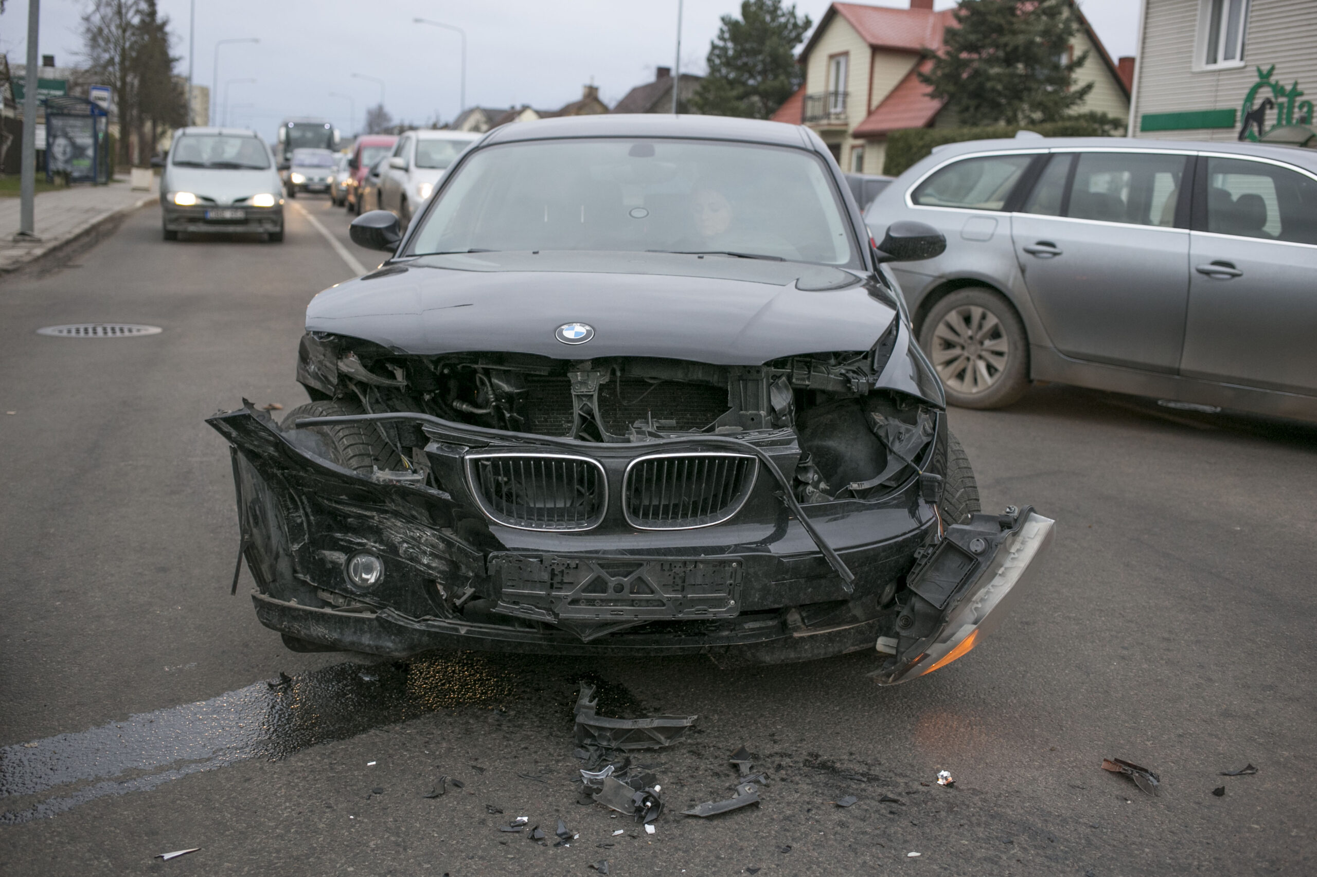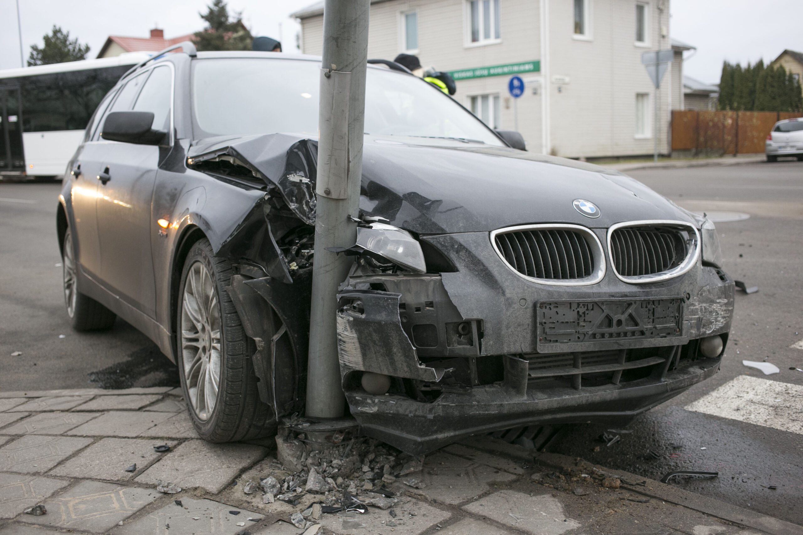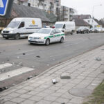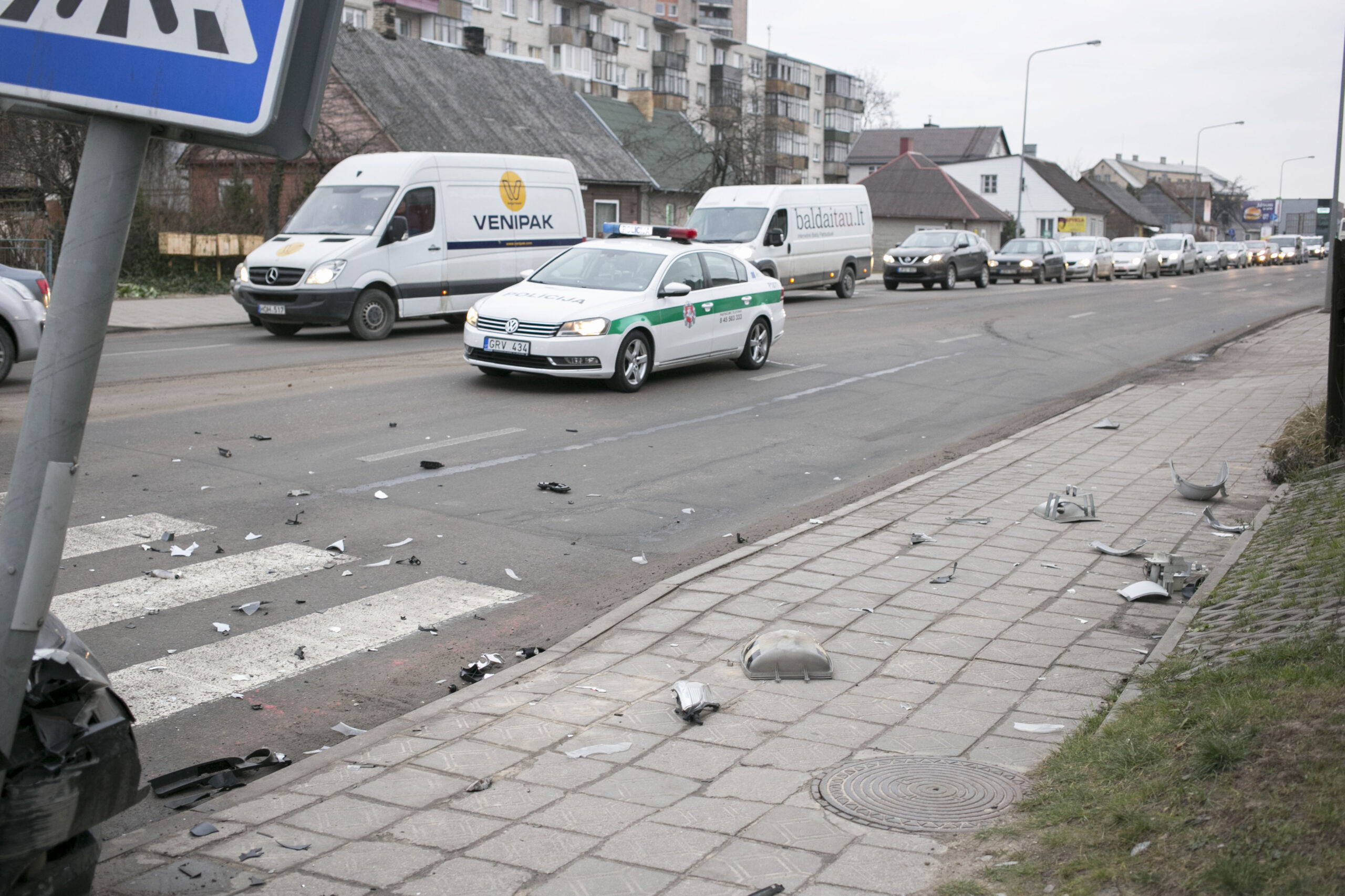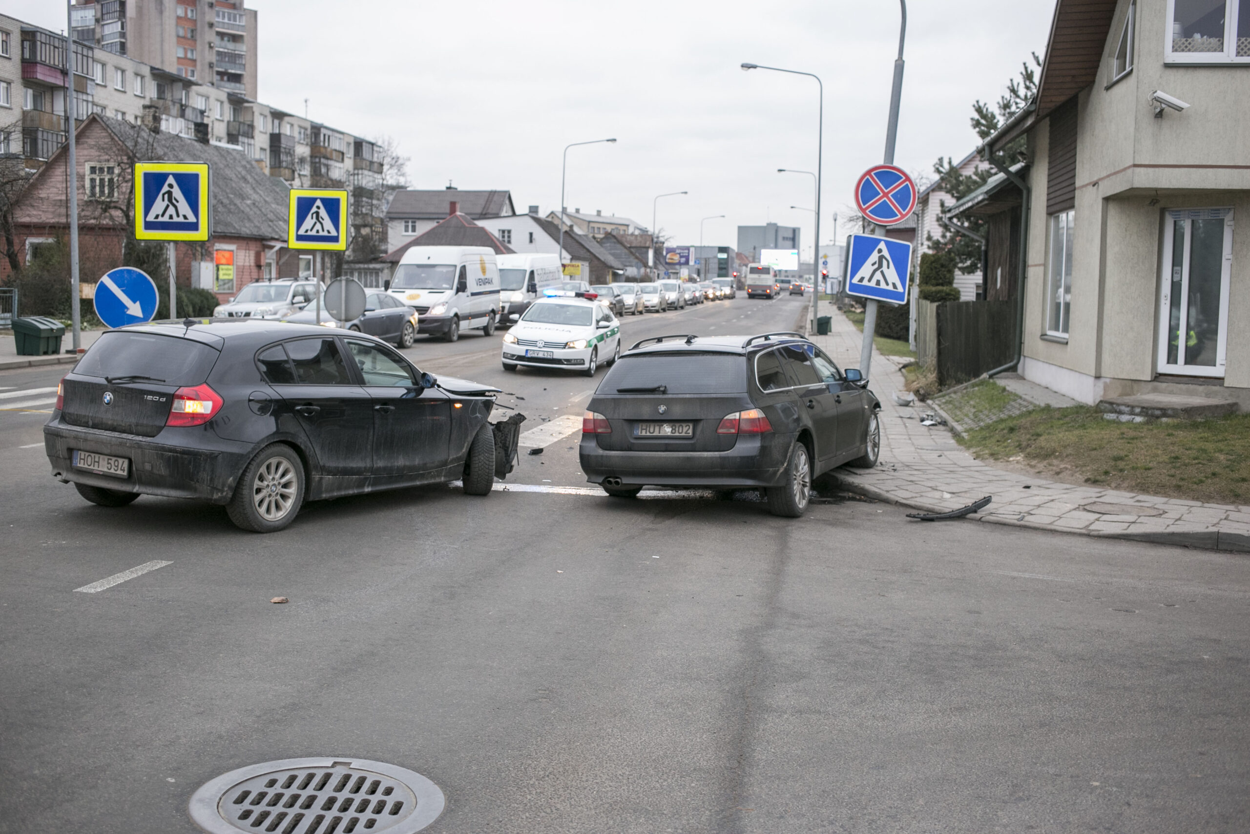 Į vietą atvykę pareigūnai vieną mašiną viduryje gatvės, ties pėsčiųjų perėja rado gerokai apdaužytu priekiu. Kita buvo įsirėmusi į metalinį kelio ženklą.