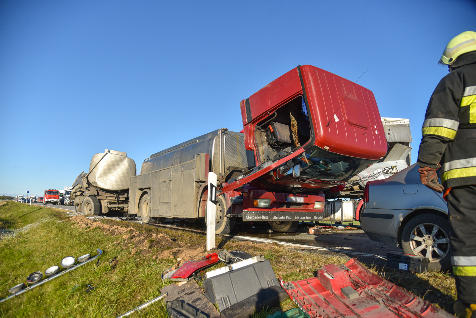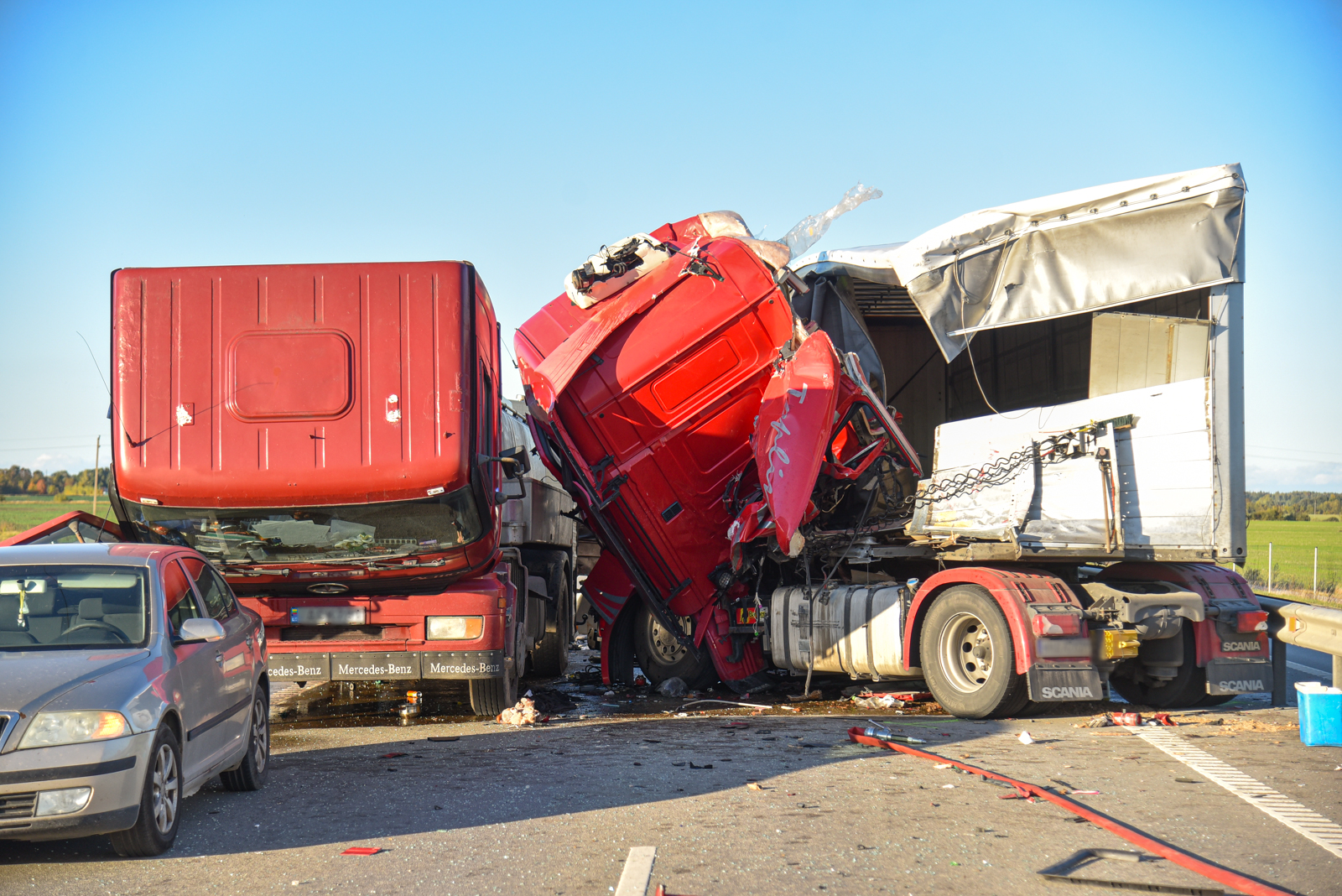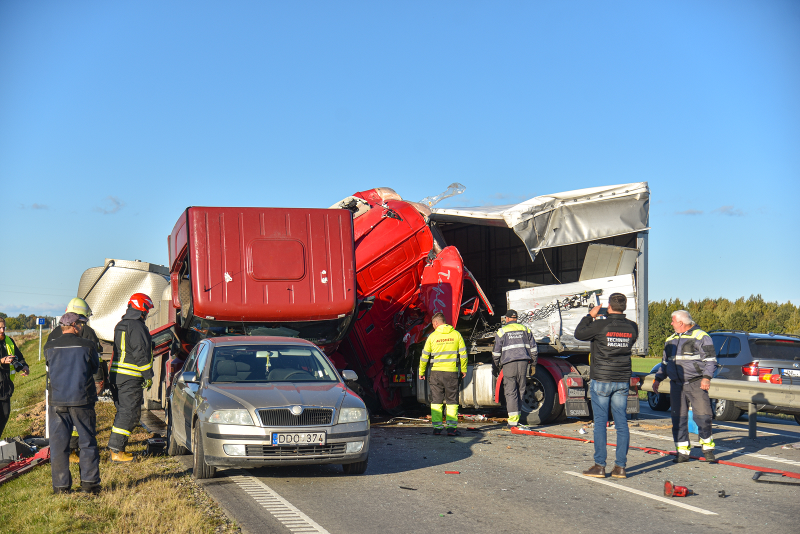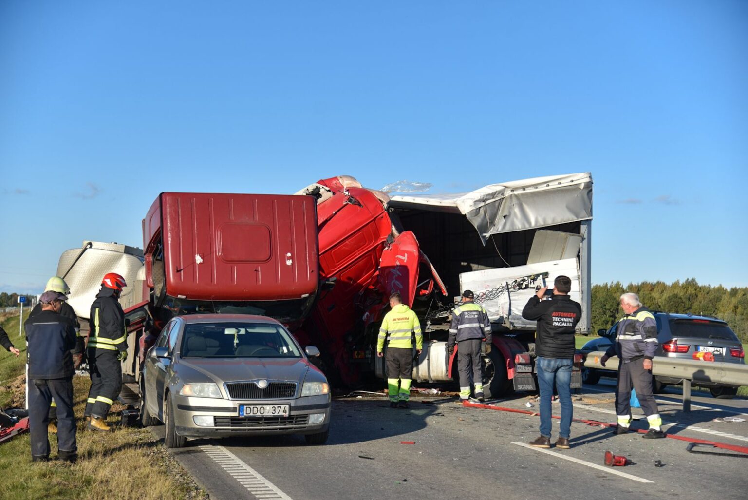 Policijos žiniomis, avarija įvyko, kai į kelkraštyje stovėjusį sugedusį sunkvežimį trenkėsi ta pačia kryptimi važiavusi kita sunkiasvorė transporto priemonė. Šioji nuo smūgio persisuko visiškai užblokuodama pravažiavimą.