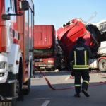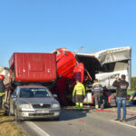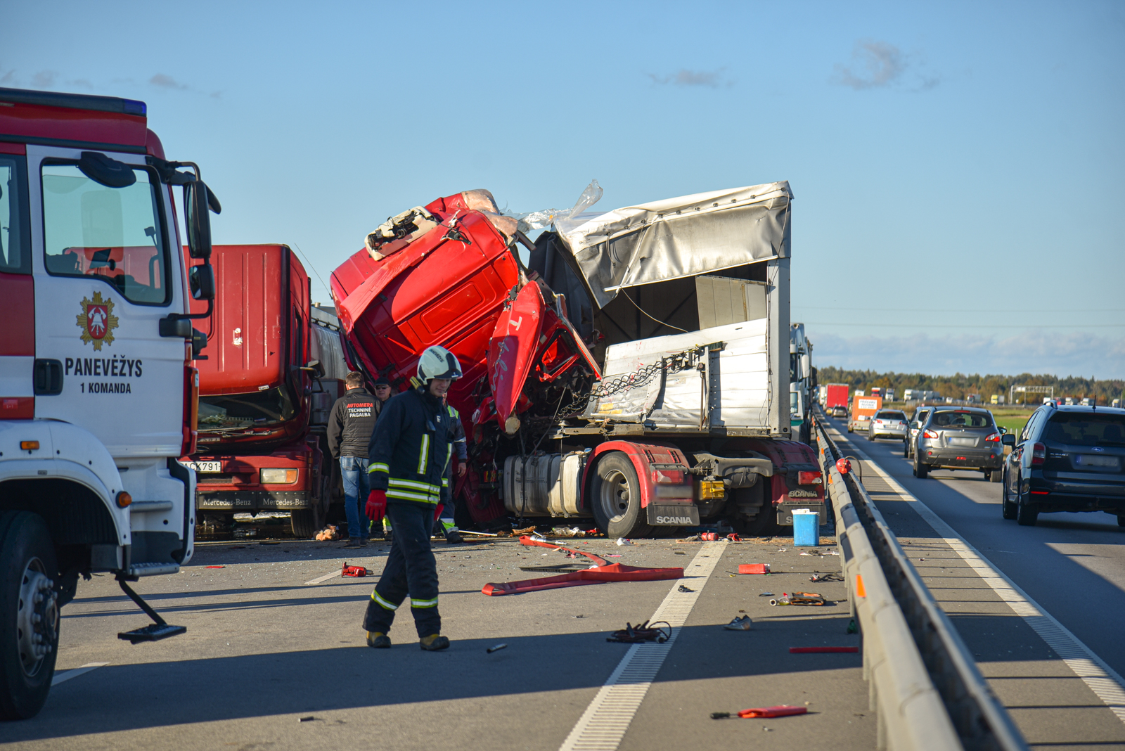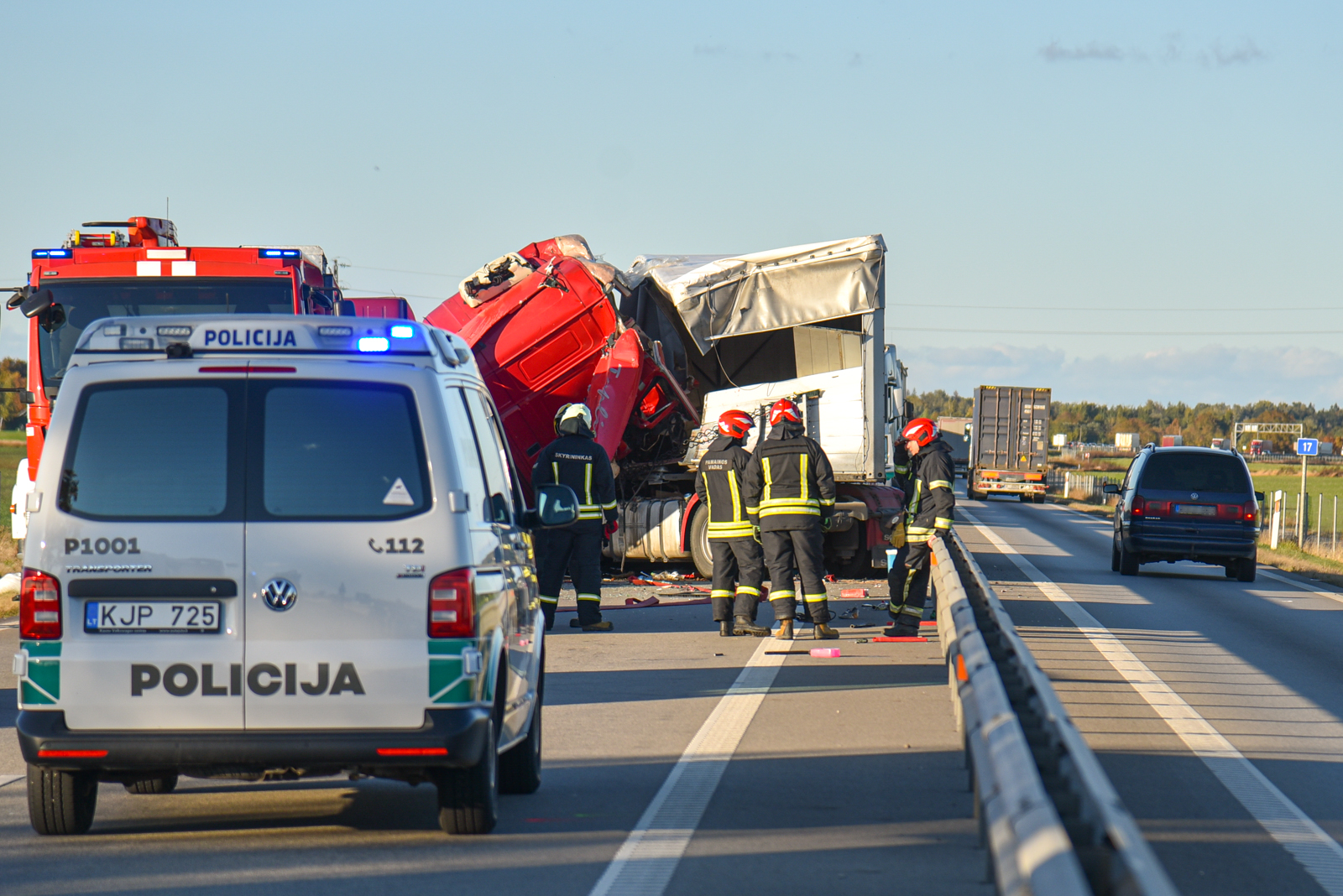Panevėžio aplinkkelyje susidūrus dviem krovininiams automobiliams, judrus kelias tapo nepravažiuojamas.