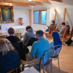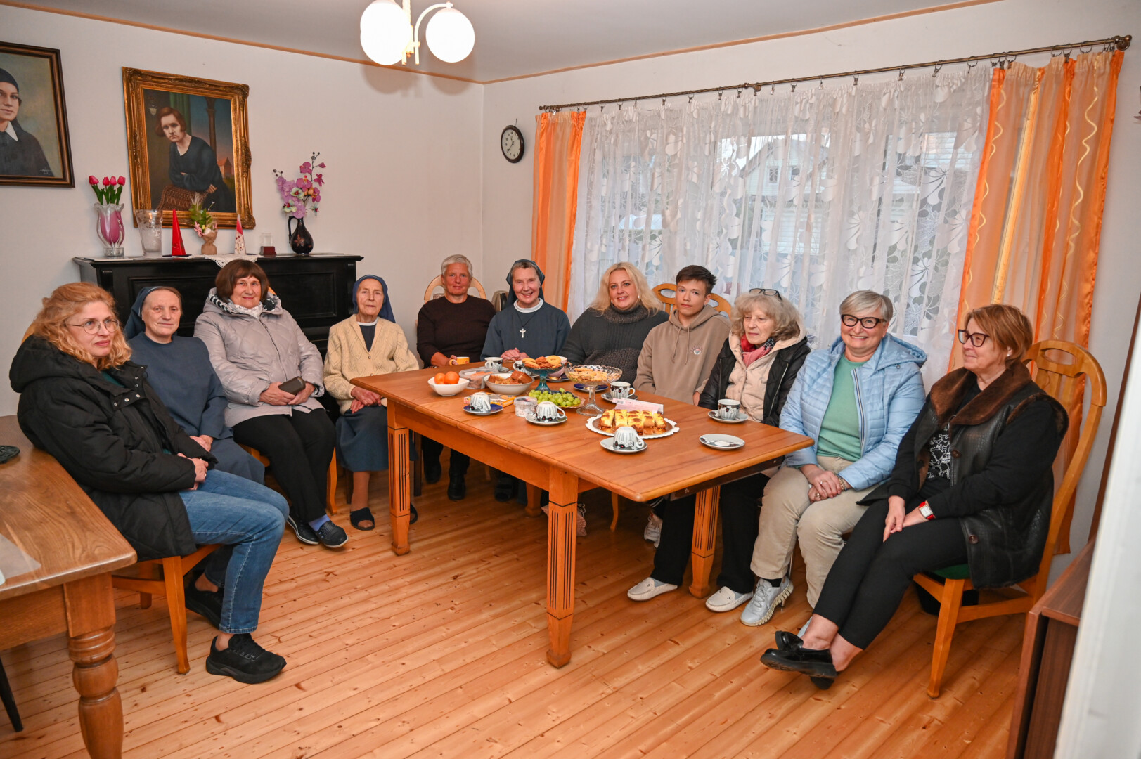 Giedotojai sutinkami svetainėje, vaišinami pačių vienuolių surinktų ir paruoštų gilių kava.