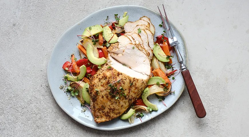 Reikės (4 porcijoms): 600 g kalakuto krūtinėlės filė, 3 morkų, 2 paprikų, 2 svogūnų, 2 šaukštų alyvuogių aliejaus, 1 šaukšto medaus, 1 česnako skiltelės, 1 šaukštelio džiovintų rozmarinų, 1 šaukštelio paprikos miltelių, druskos, šviežiai maltų juodųjų pipirų; patiekti: avokado, mikrožalumynų.