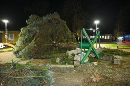 Vėjas antrus metus iš eilės išverčia šventinę eglę Naujamiestyje, Panevėžio rajone. 2023…
