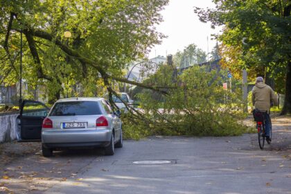 Pirmadienį vėjas vartė medžius, du iš jų prispaudė automobilius, Kėdainiuose lietaus vanduo…